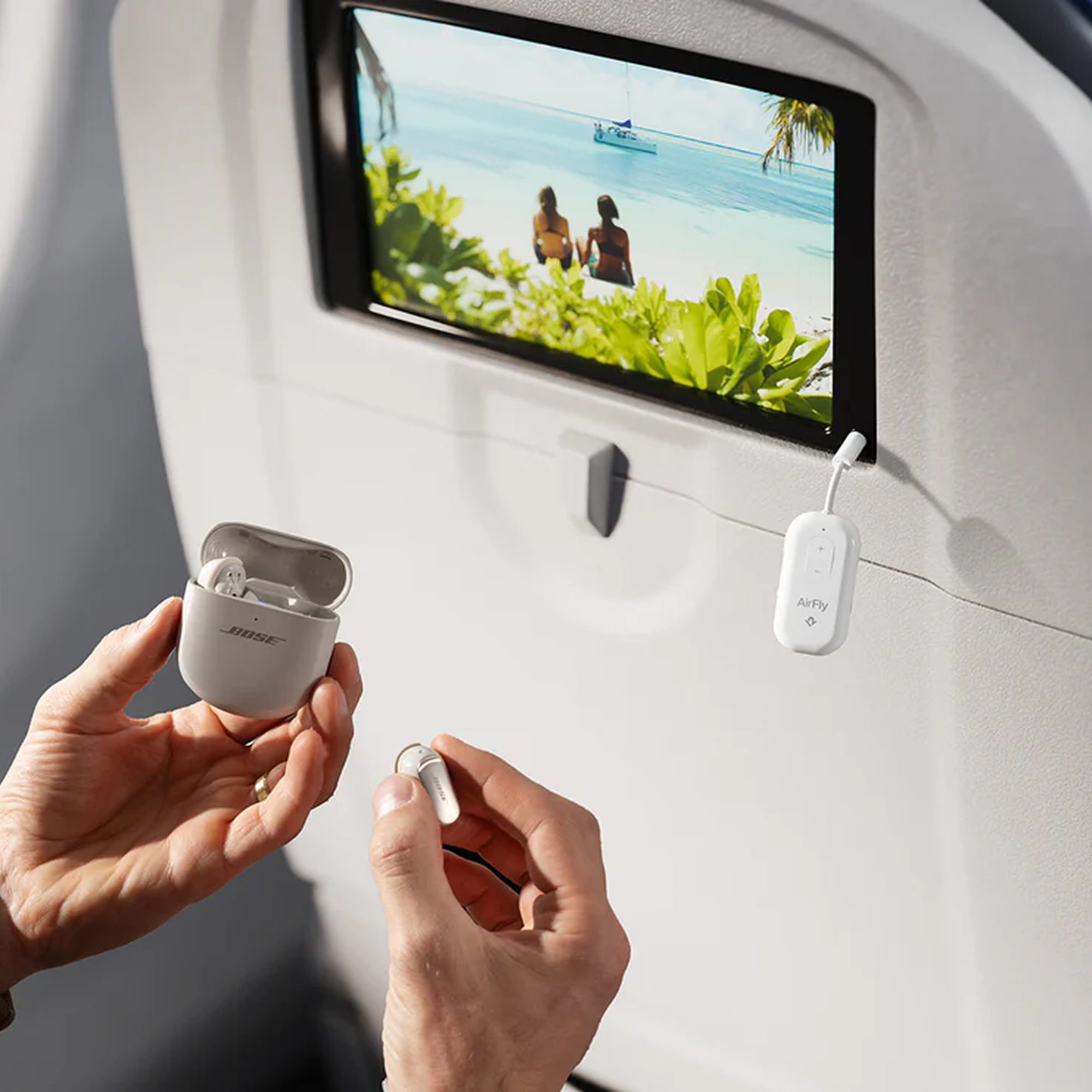 The AirFly Pro 2 makes flights a lot more comfortable. Instead of being stuck with airline headphones, you can pair it directly to your own wireless earbuds like the AirPods Pro 2.