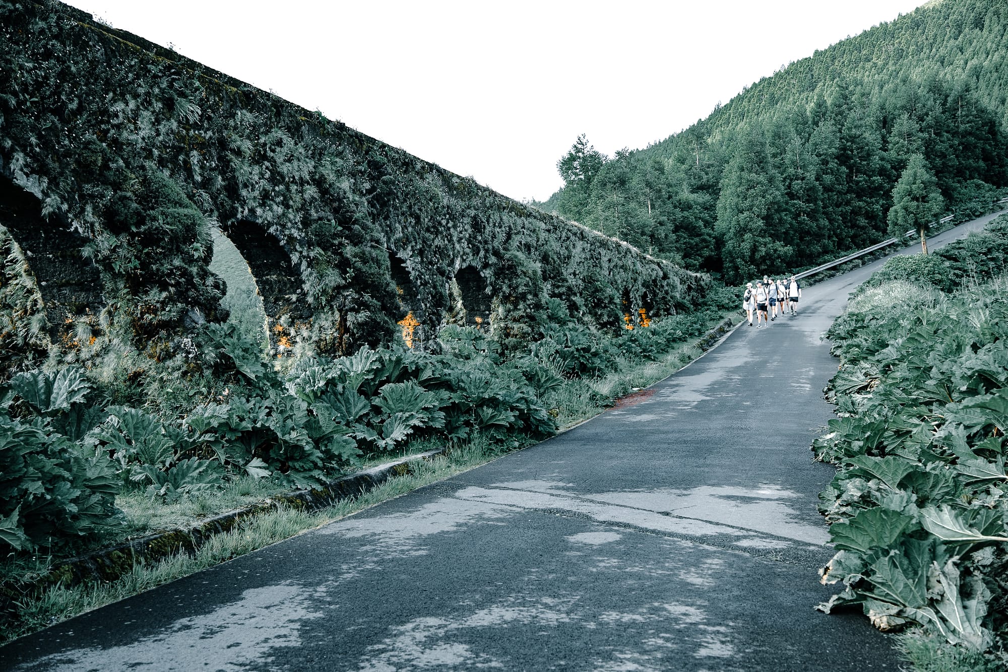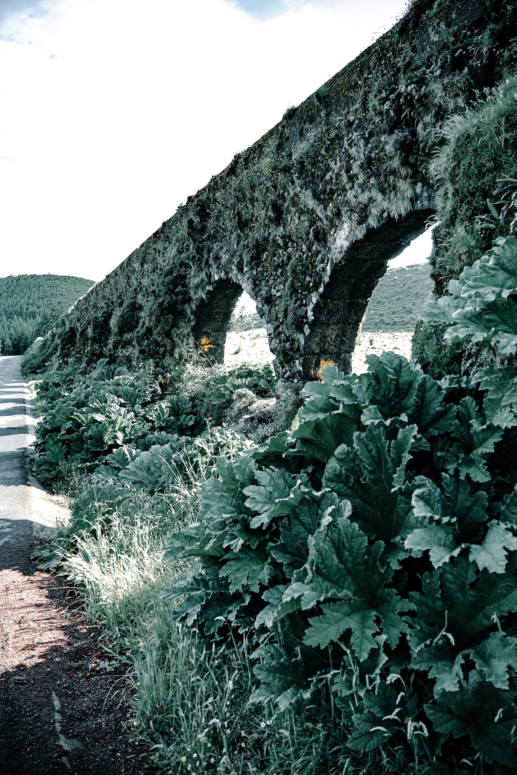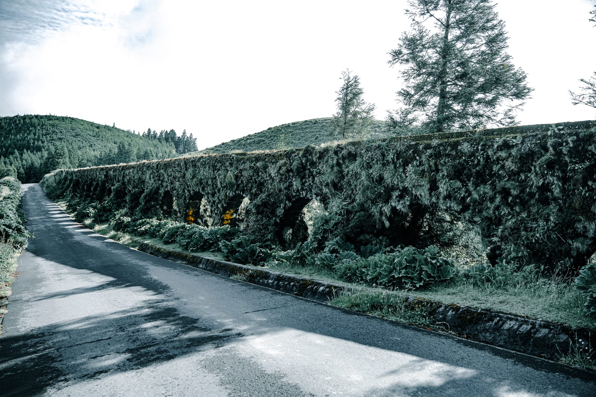 A moss-covered aqueduct stretches alongside a quiet road on São Miguel, occasionally drawing the footsteps of passing hikers
