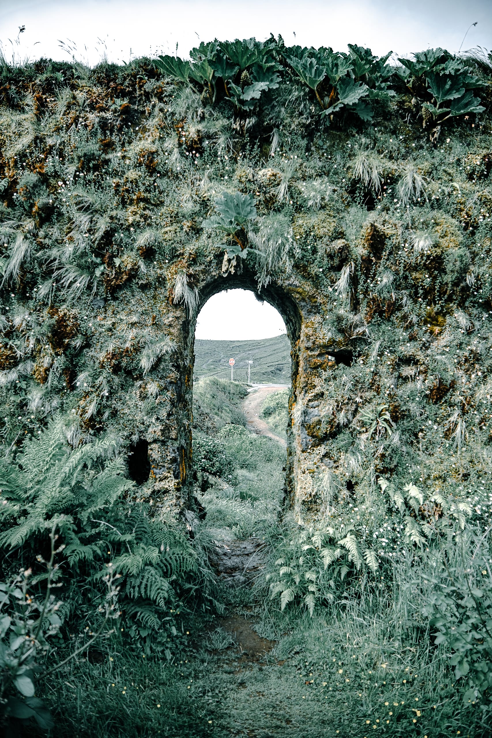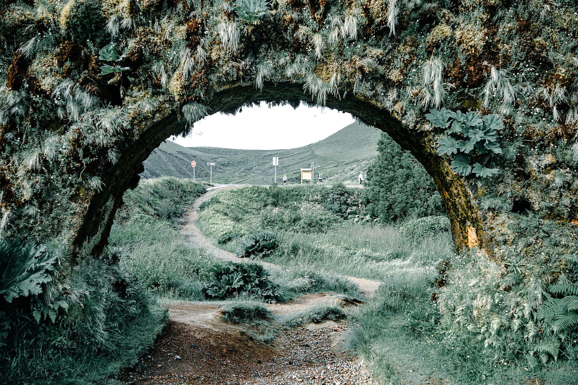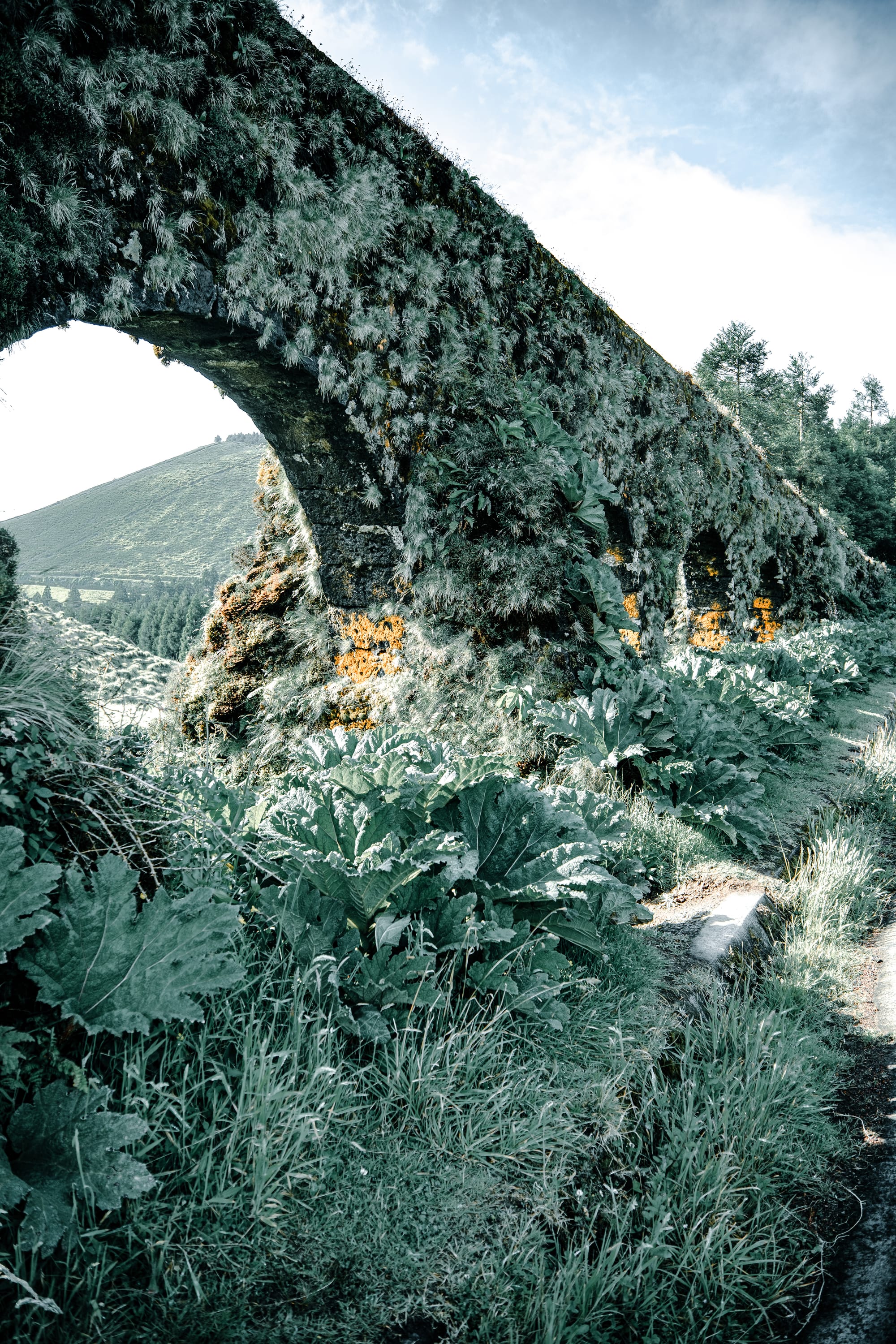 Trails pass through archways in the aqueduct wall, where stone, moss, and volcanic hills converge at the island’s highlands