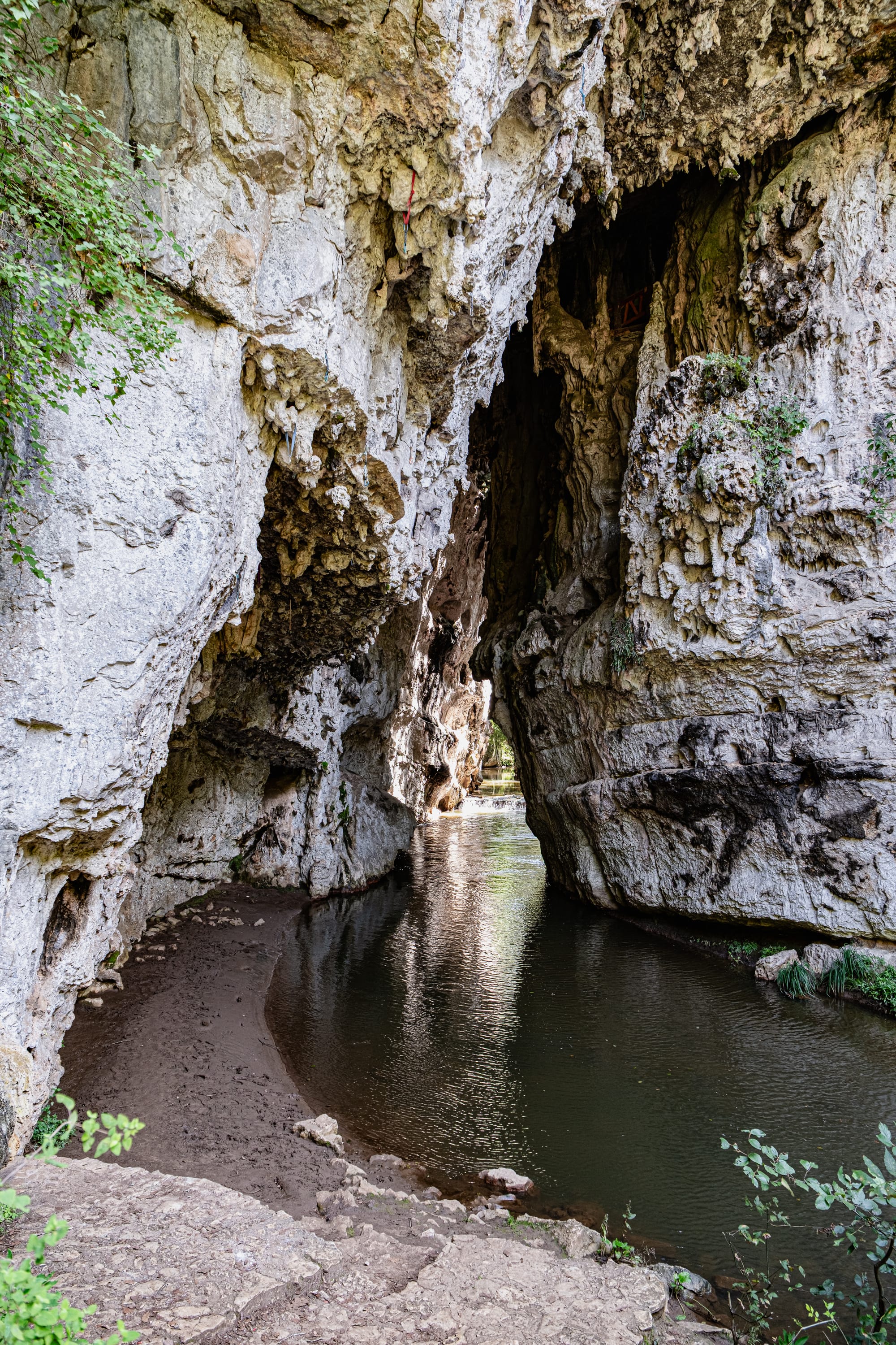 It is larger than photographs suggest, not in height alone but in the way its shape anchors the surrounding valley. The limestone has been hollowed and sculpted over time by Río Fogótico, leaving a broad opening that looks almost architectural from a distance. Upright walls extend vertically from the riverbanks, with irregular textures marking where water once seeped or where rock gave way in fragments.