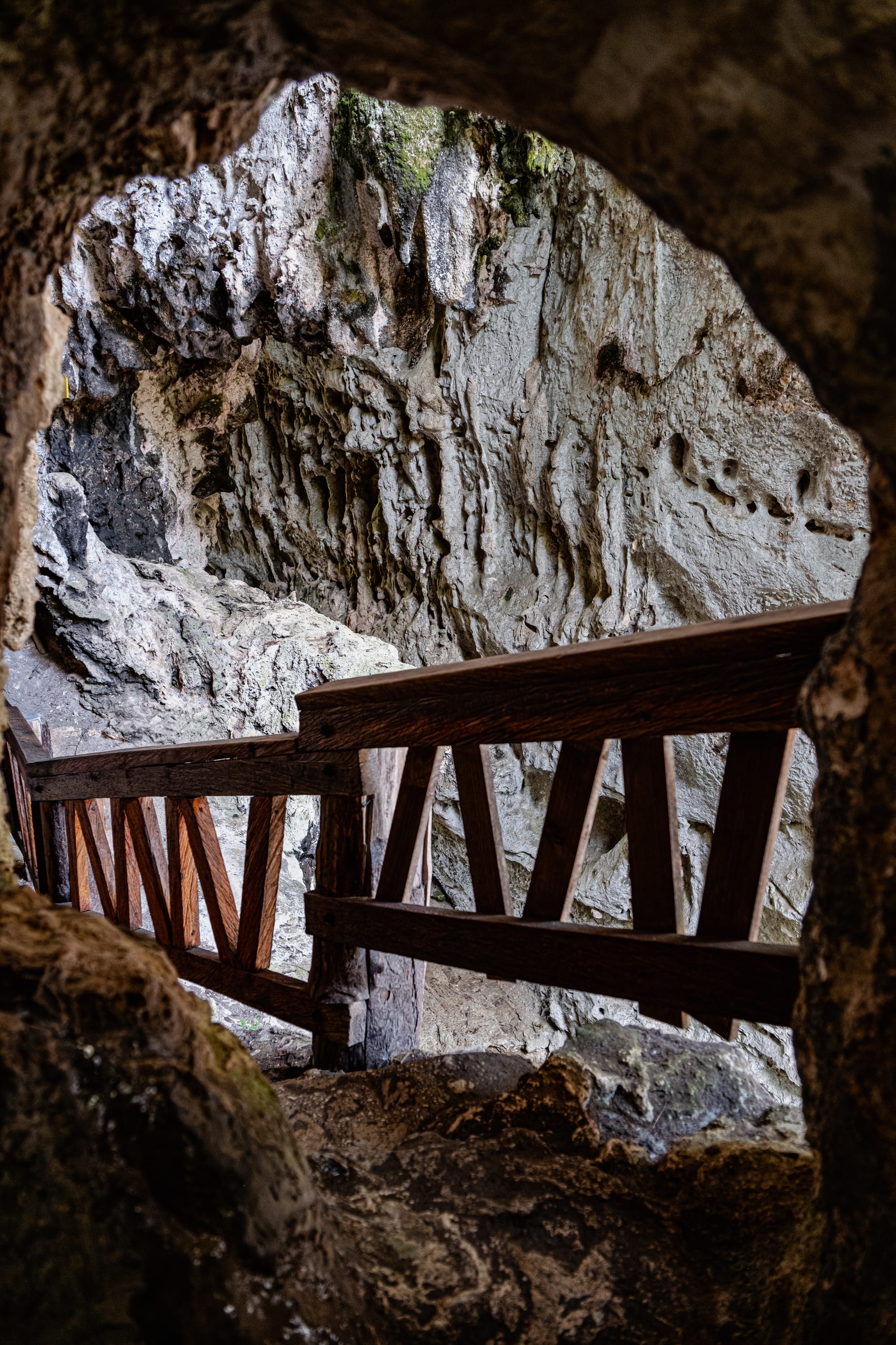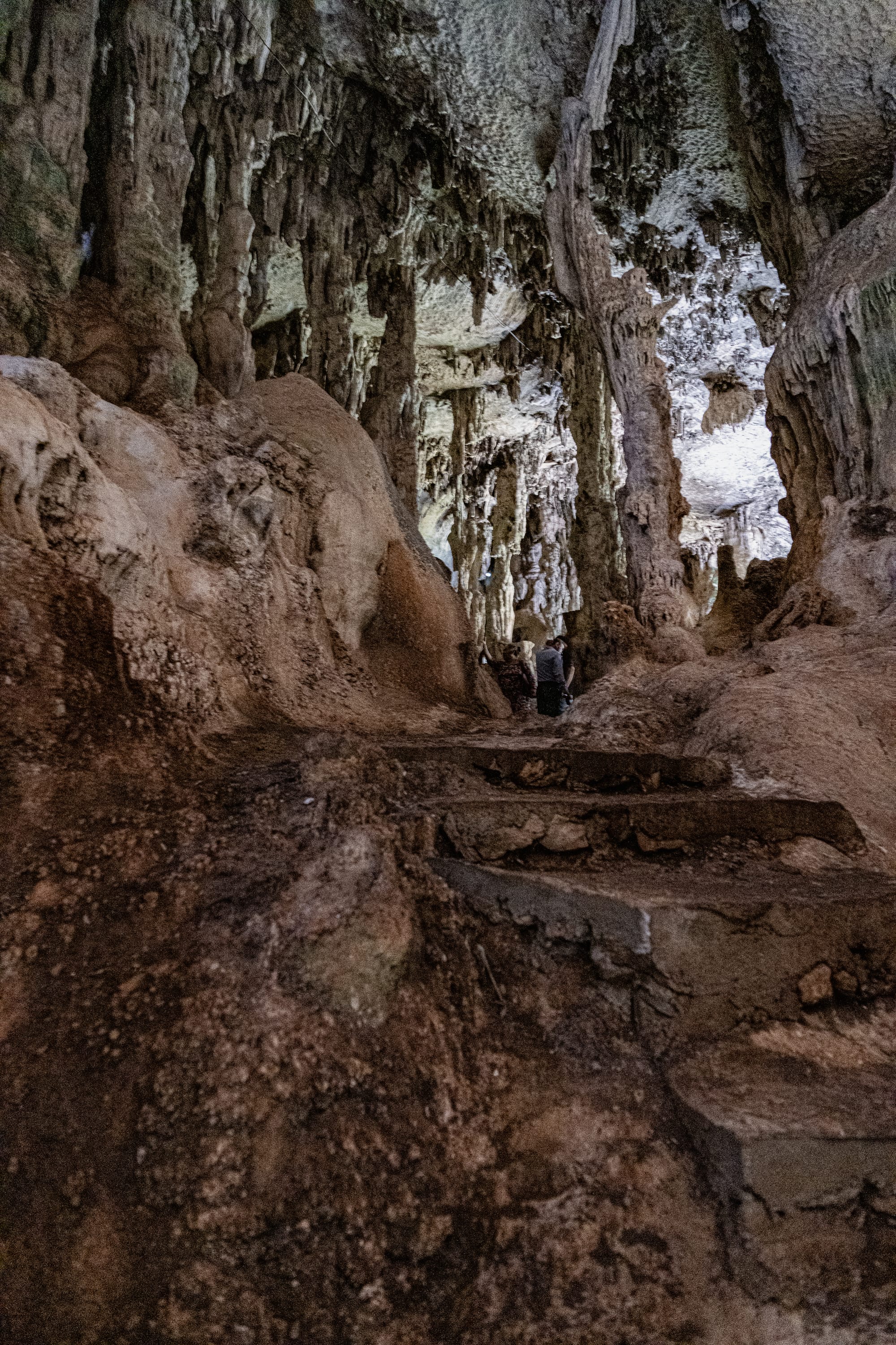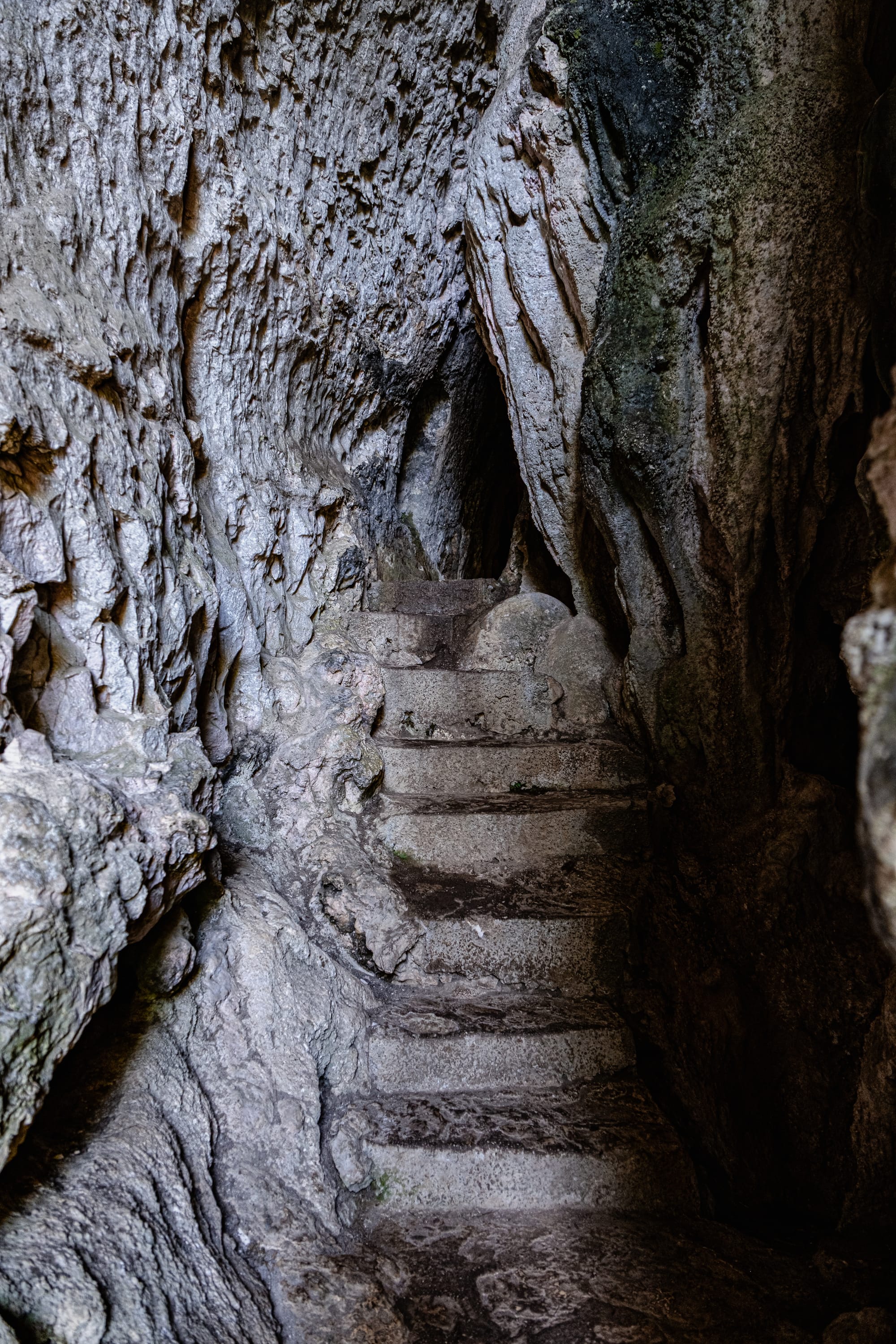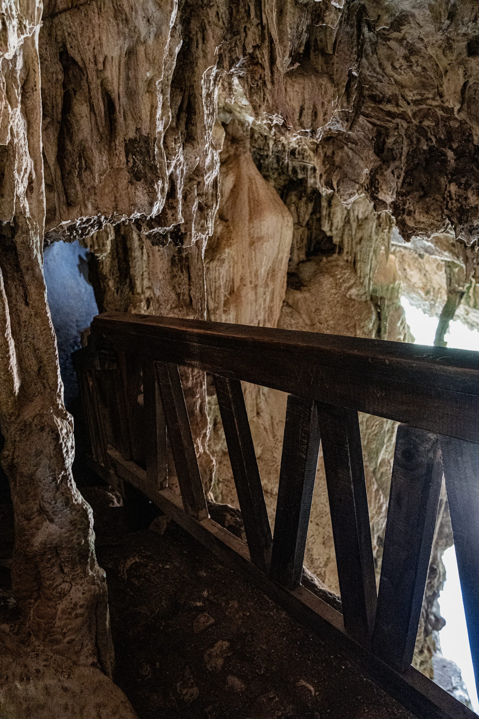 Stairs lead from one side of the arch up toward the caves—a short climb, but one that shifts the viewpoint quickly. Inside, the air cools noticeably, and the light narrows into small pockets shaped by the stone formations overhead.
