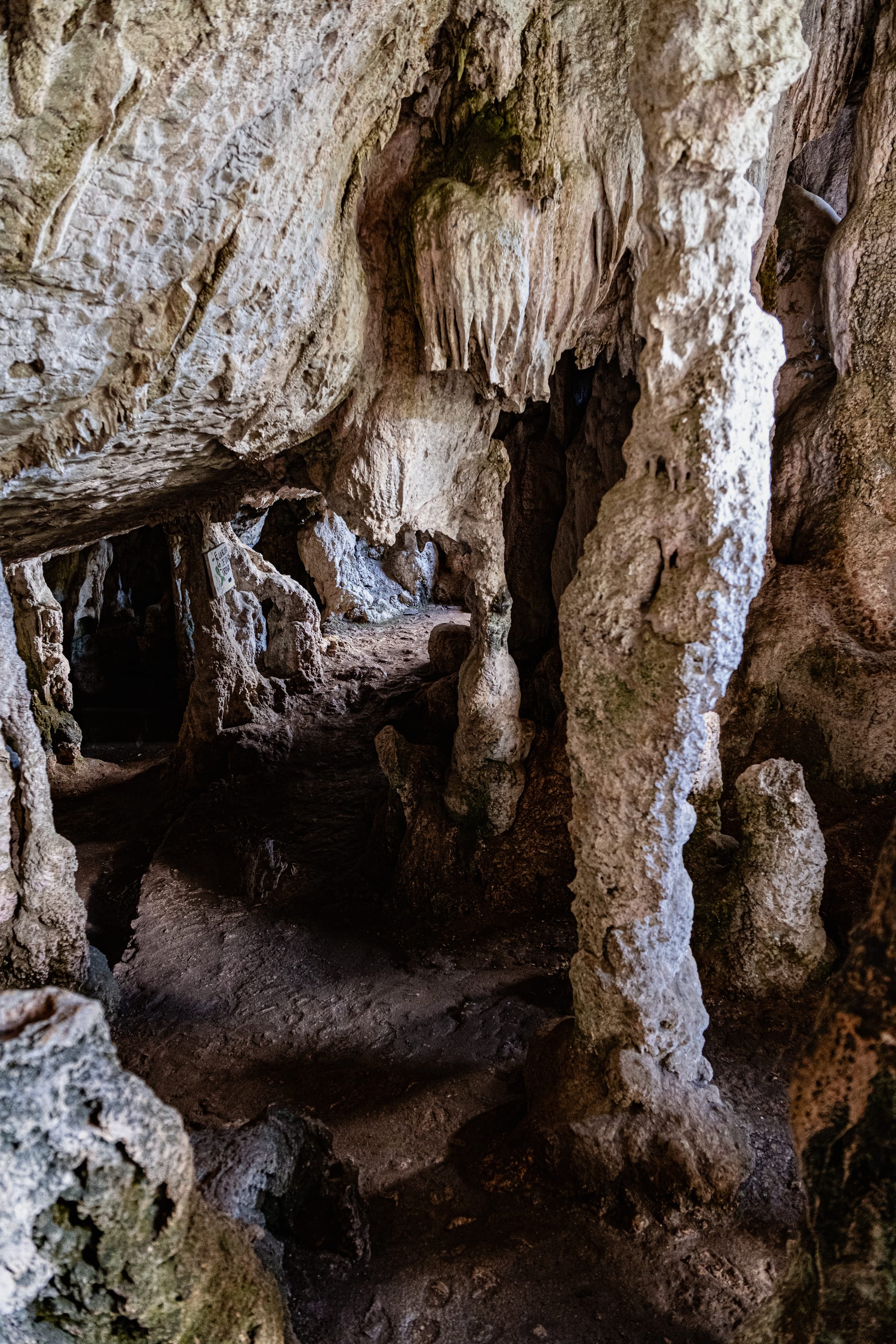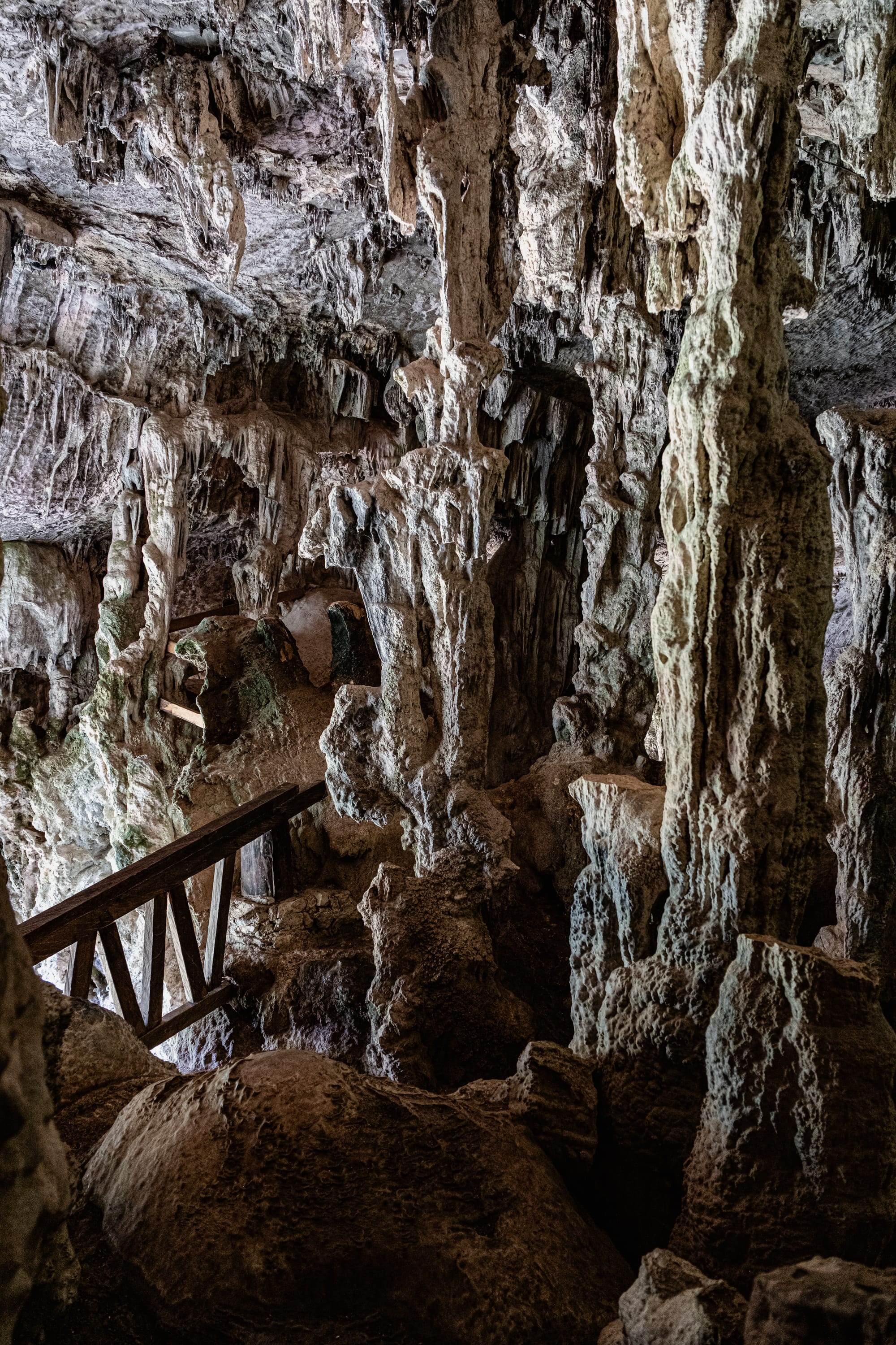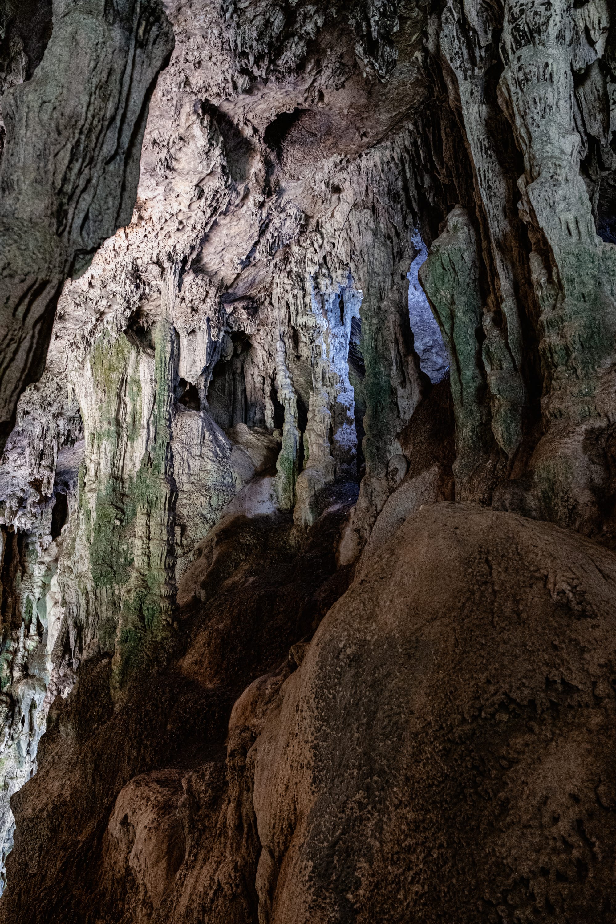 Stairs lead from one side of the arch up toward the caves—a short climb, but one that shifts the viewpoint quickly. Inside, the air cools noticeably, and the light narrows into small pockets shaped by the stone formations overhead.