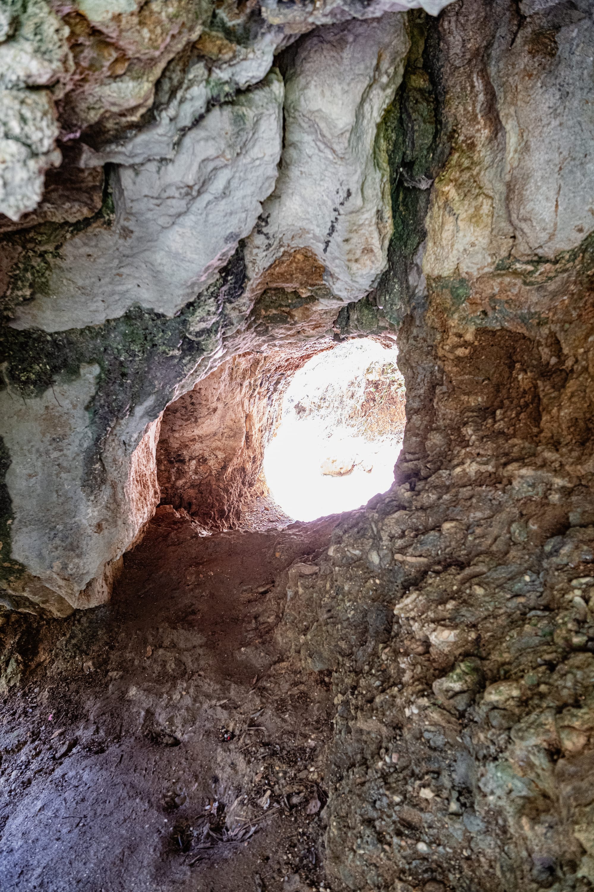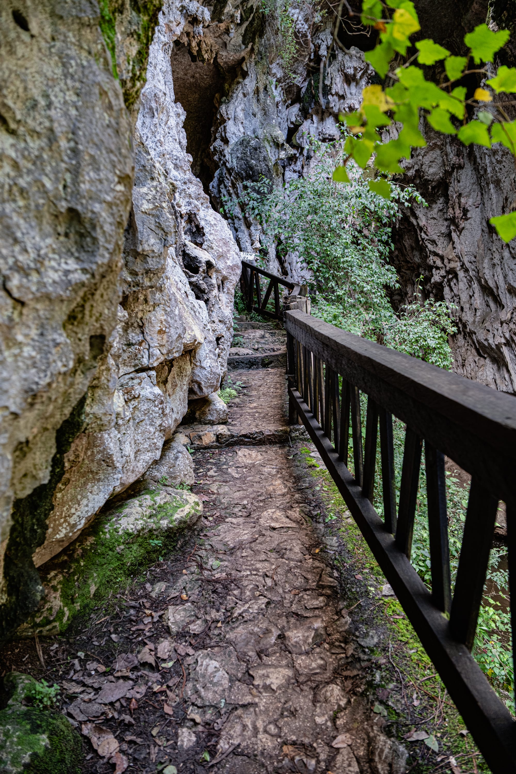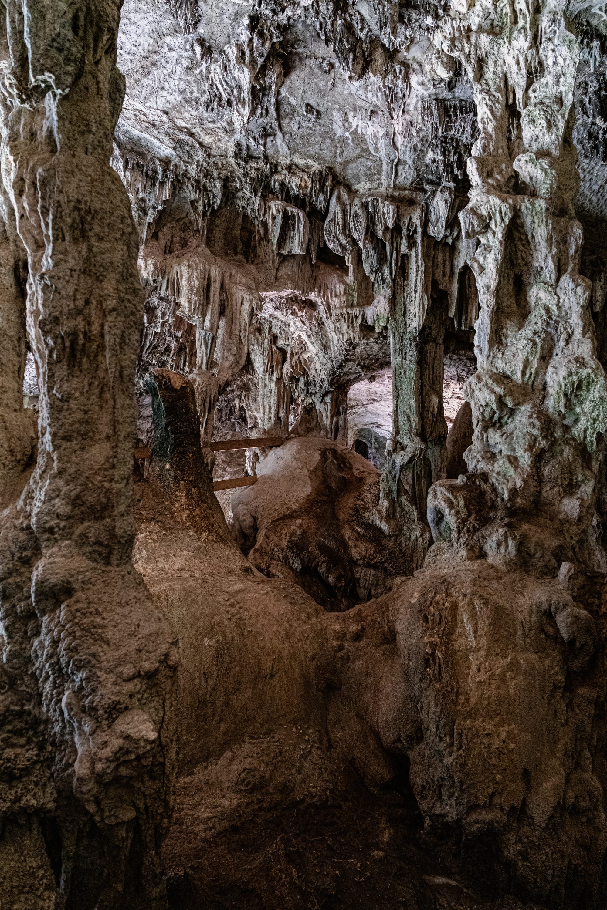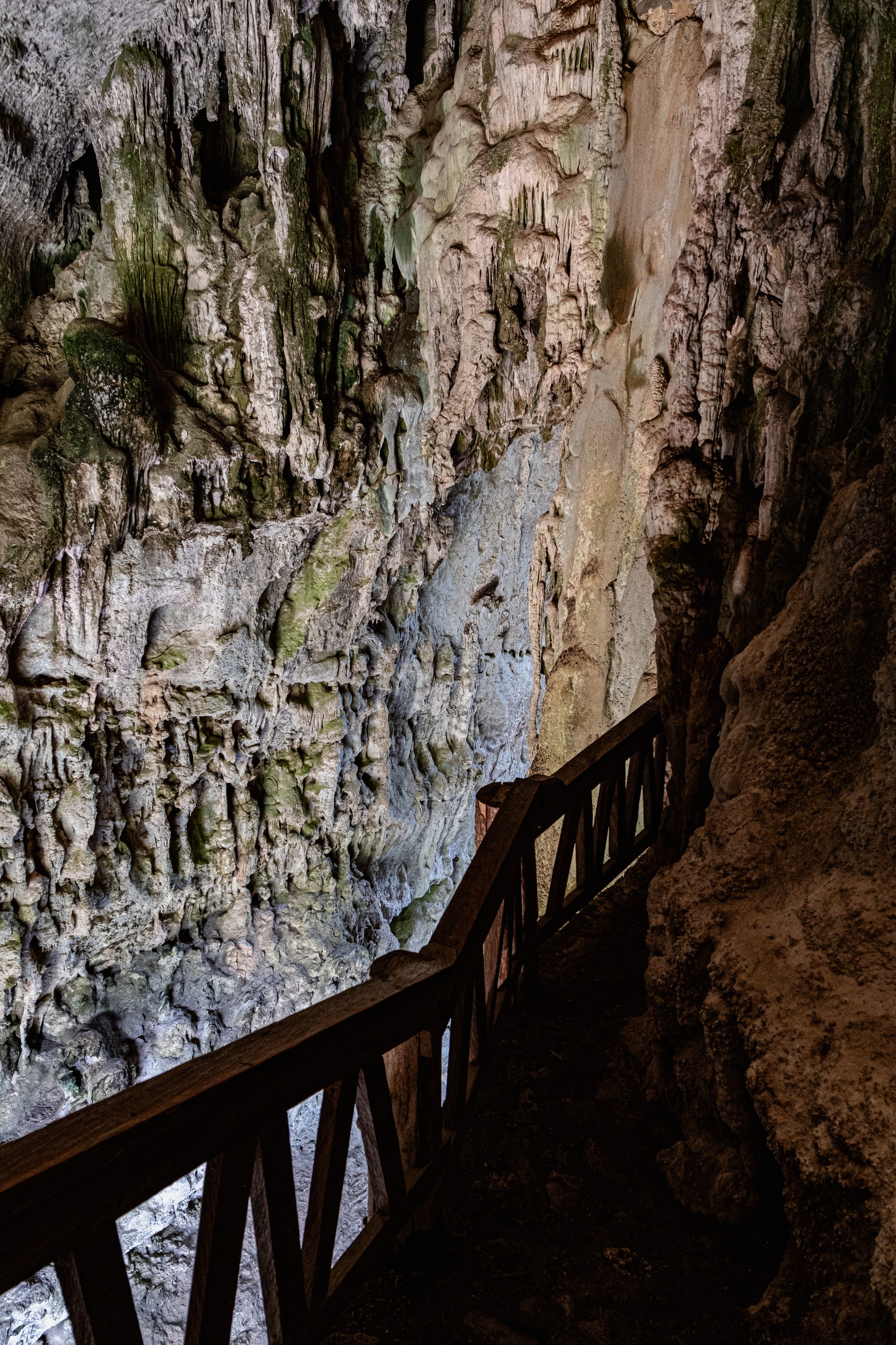 Stairs lead from one side of the arch up toward the caves—a short climb, but one that shifts the viewpoint quickly. Inside, the air cools noticeably, and the light narrows into small pockets shaped by the stone formations overhead.