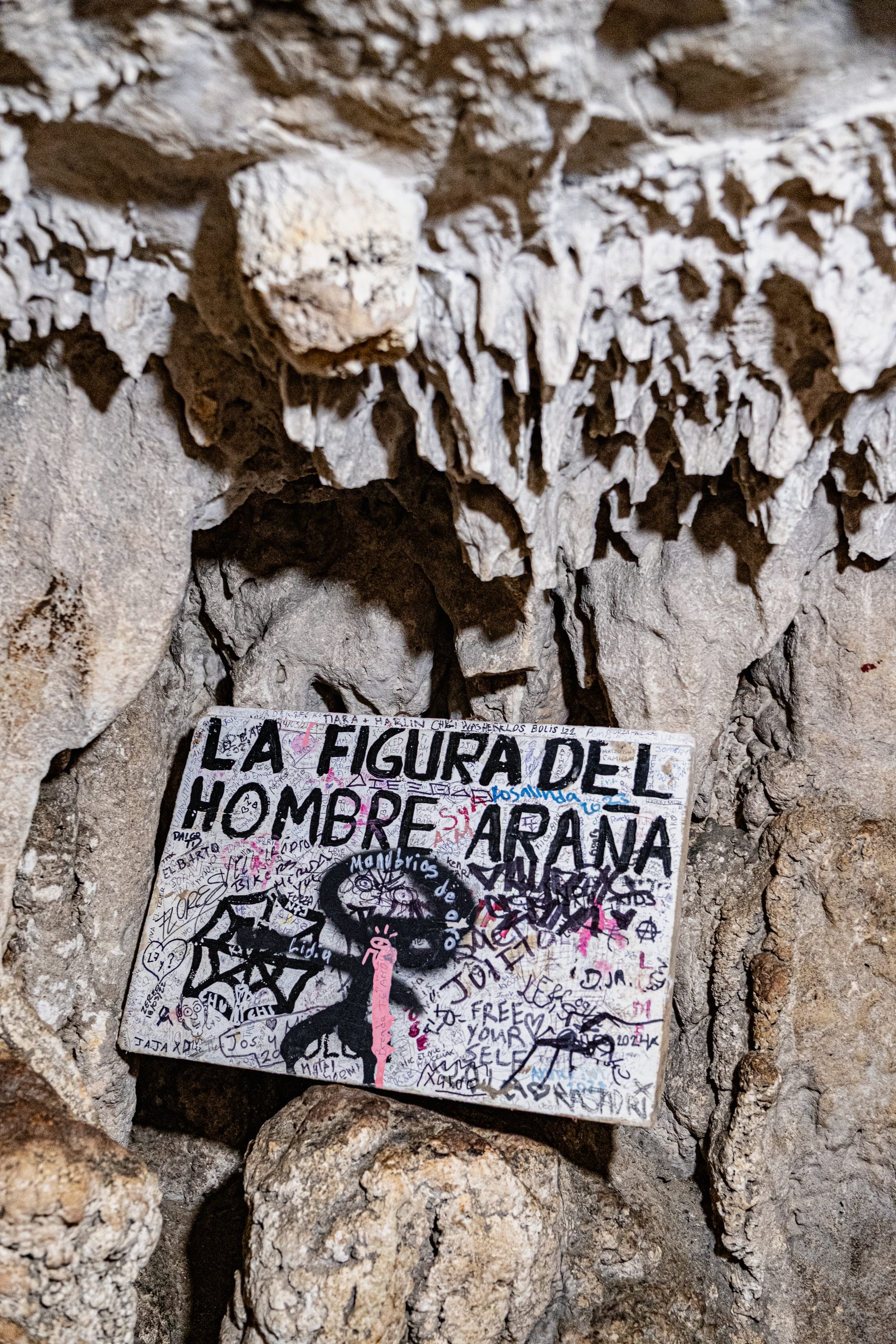 Cave formations at El Arcotete with hand-painted signs hinting at what people see in the stone