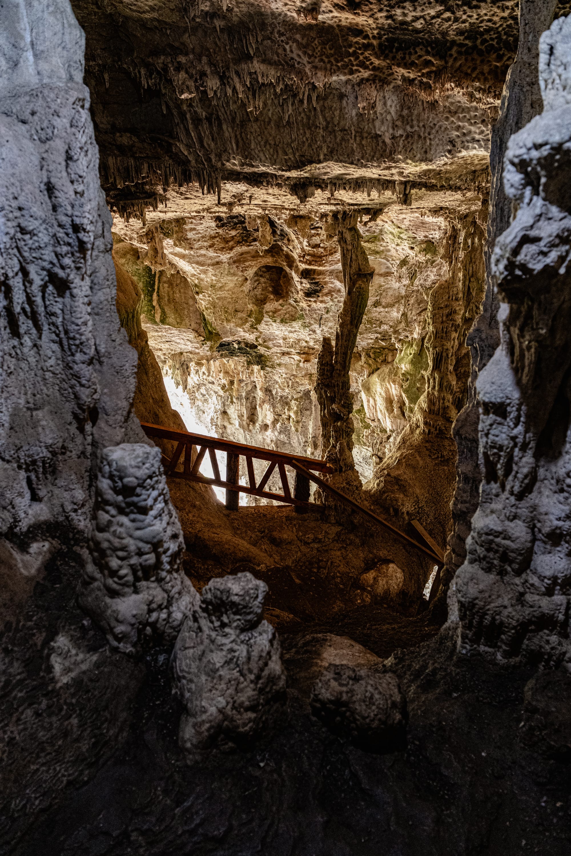 Metal walkways guide you through a loop that takes only a few minutes if you move quickly, though it’s more interesting at a slower pace—pausing to notice how the ceiling shifts in height, how certain formations have grown in sheltered corners, how sound behaves in a room made entirely of mineral.