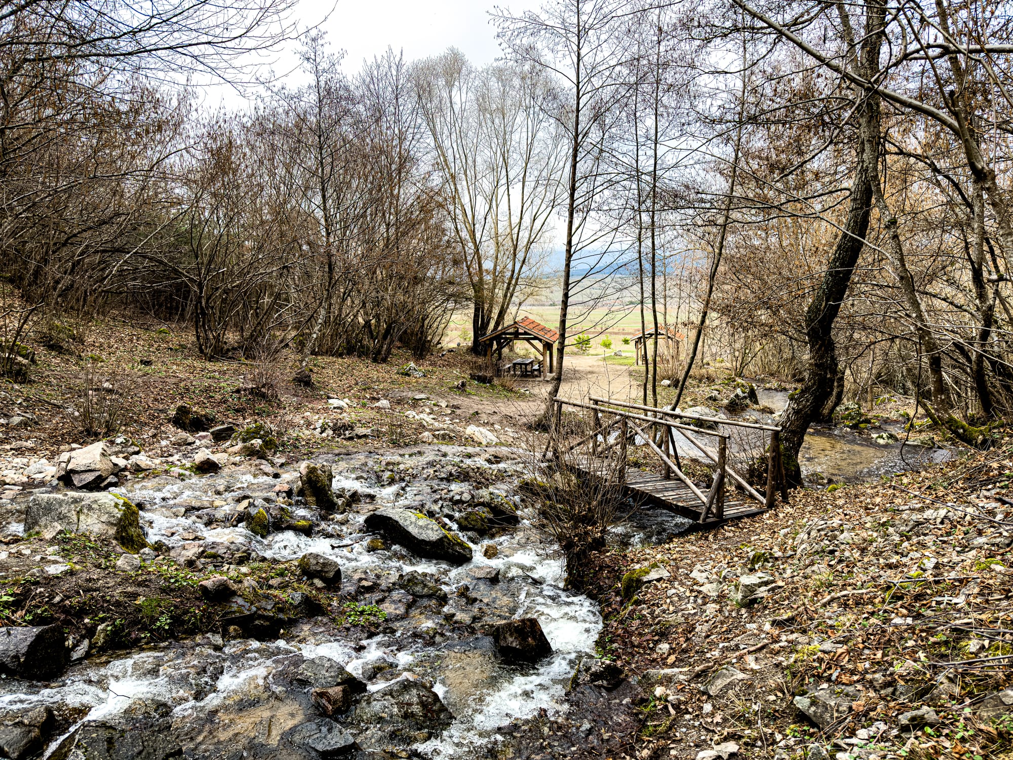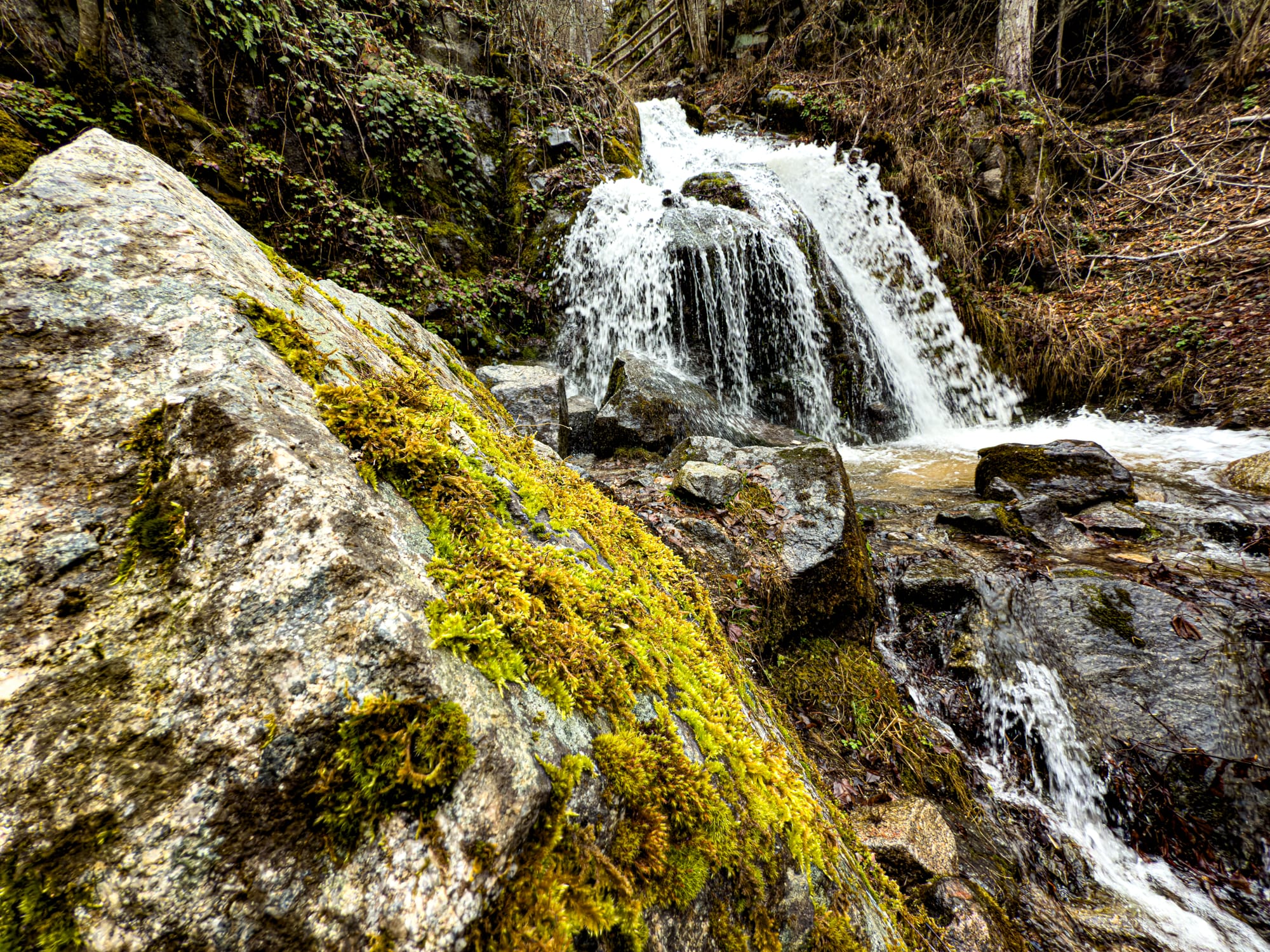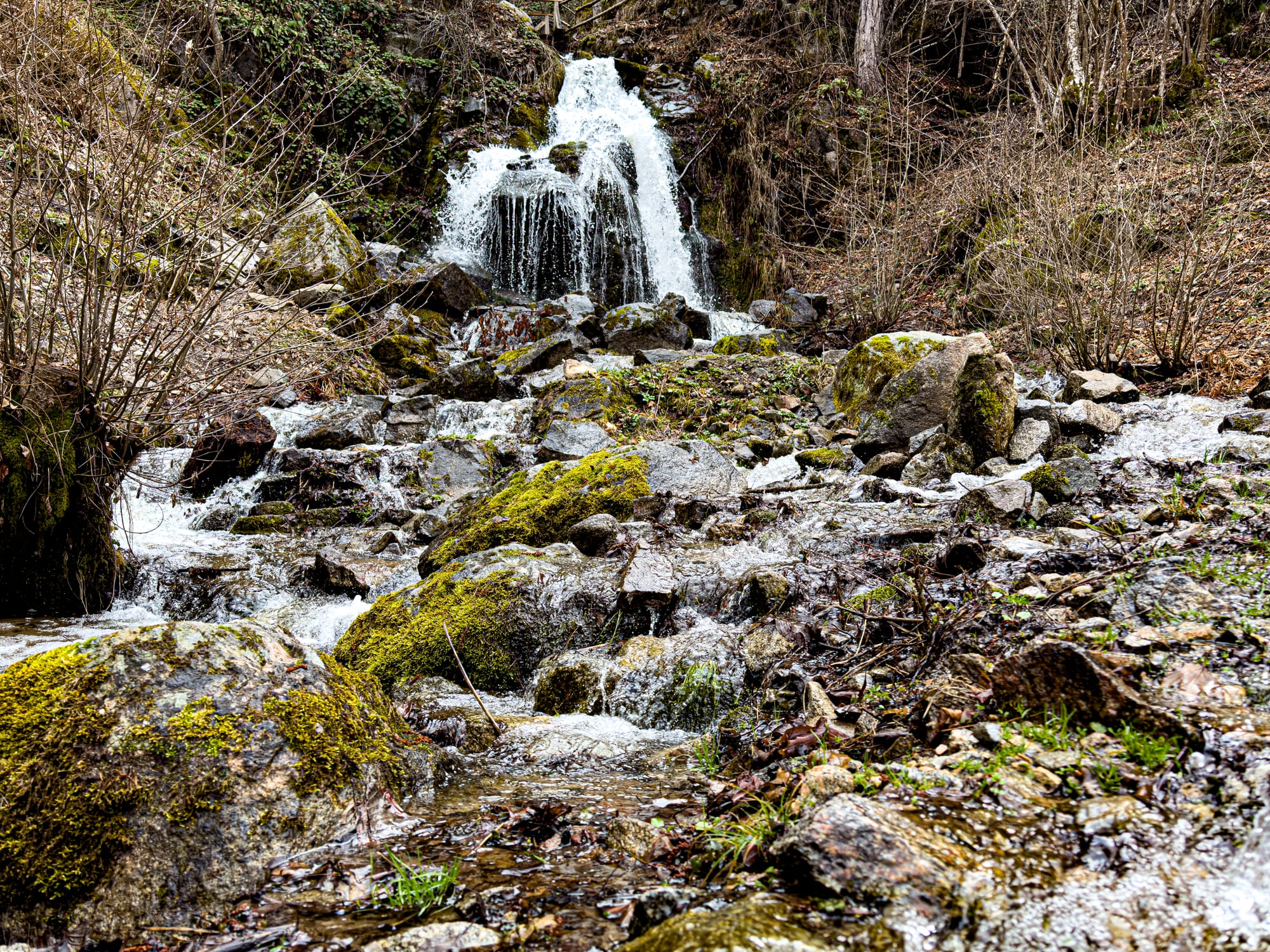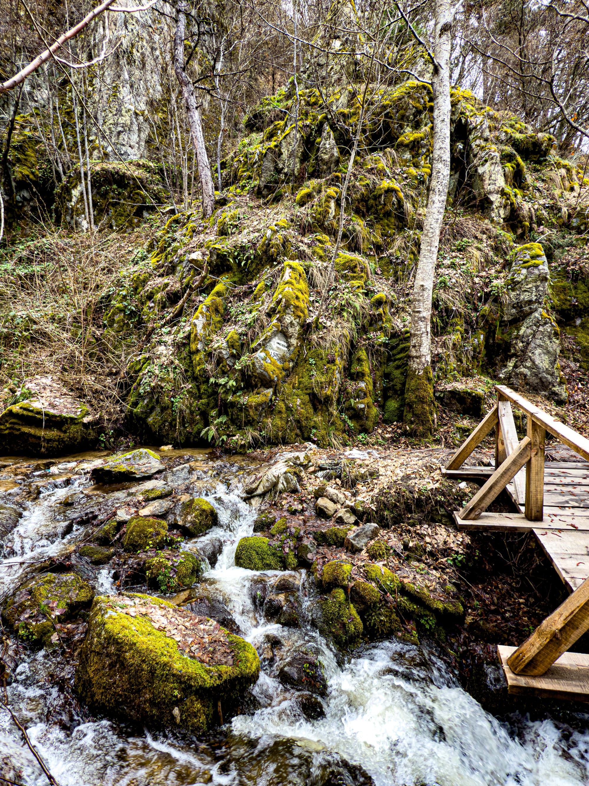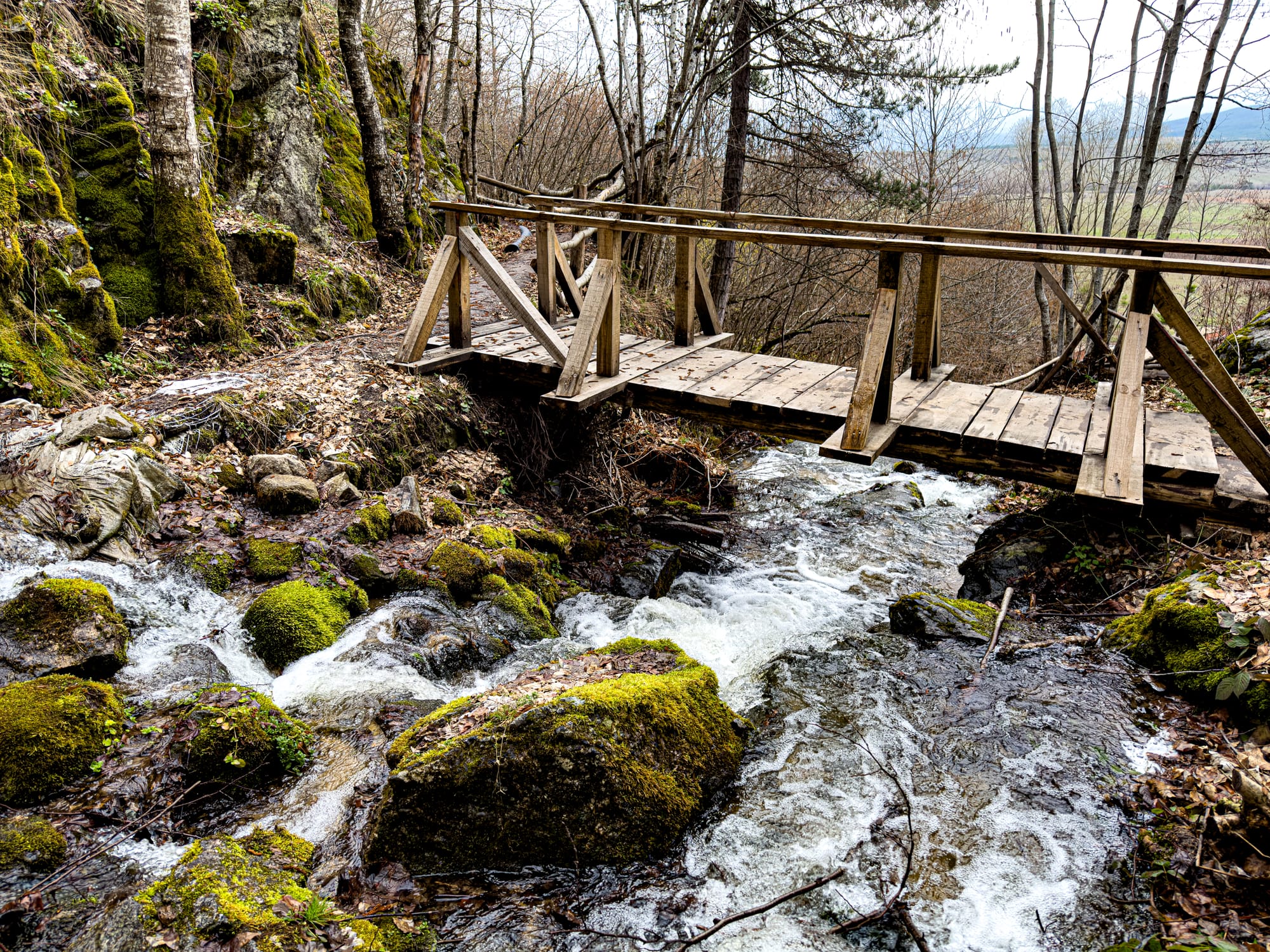 Wooden bridges, mossy rocks, and streams around St. Nicholas Waterfall near Bansko