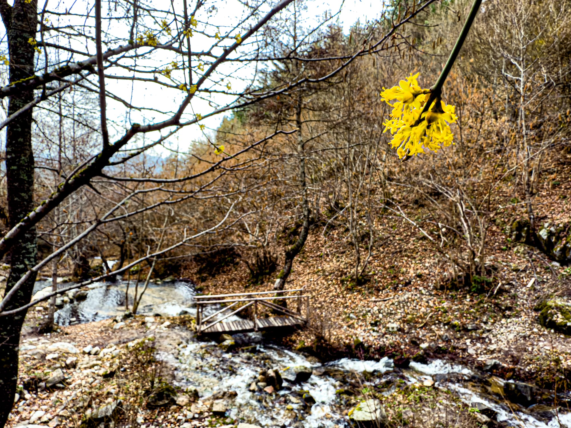 Scenes from St. Nicholas Waterfall: rushing streams, wooden bridges, forest paths, and a hillside shrine