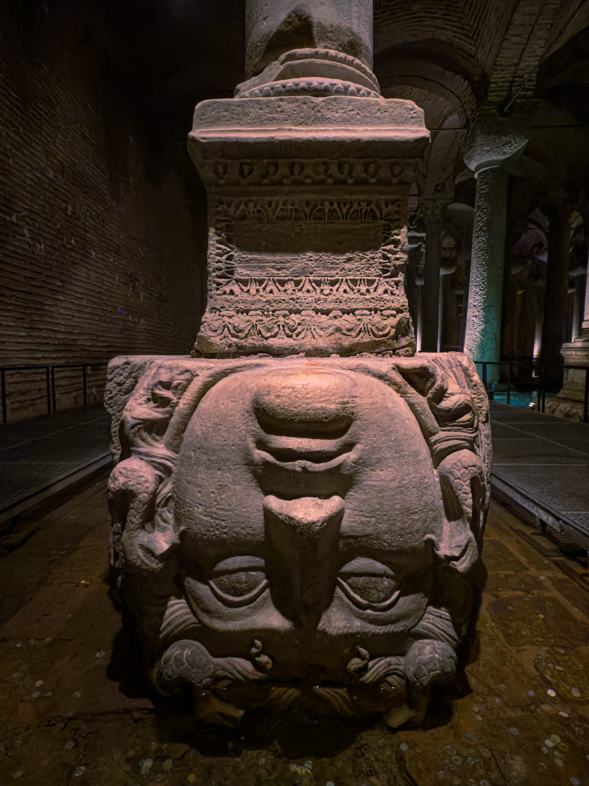 Two mysterious Medusa heads support ancient columns in the depths of the Basilica Cistern