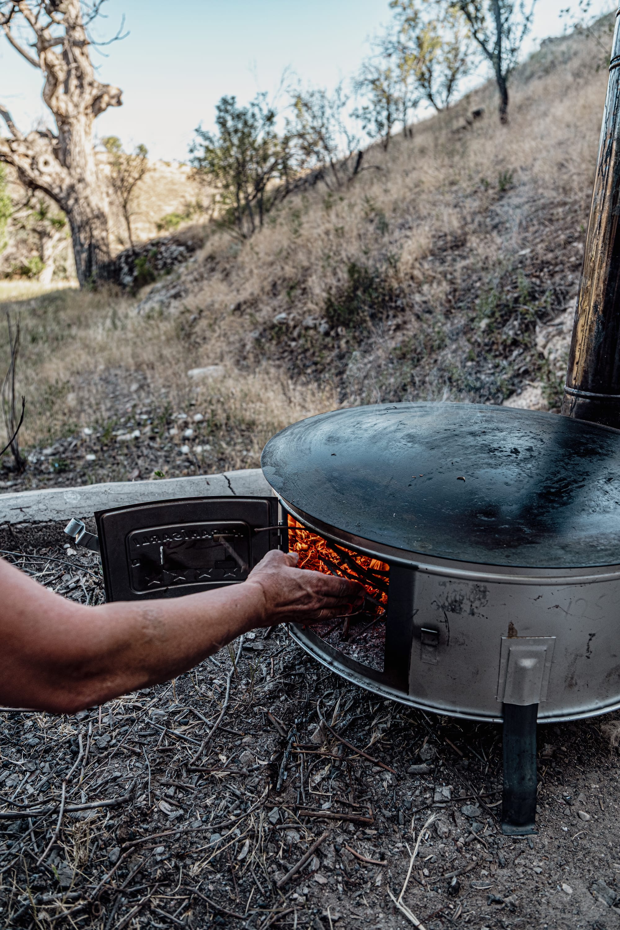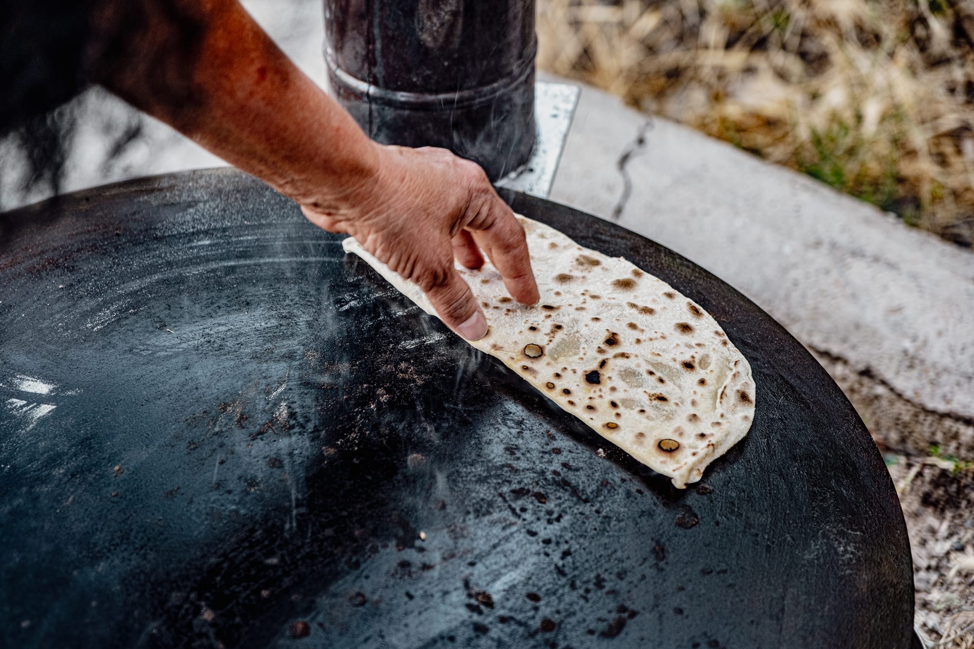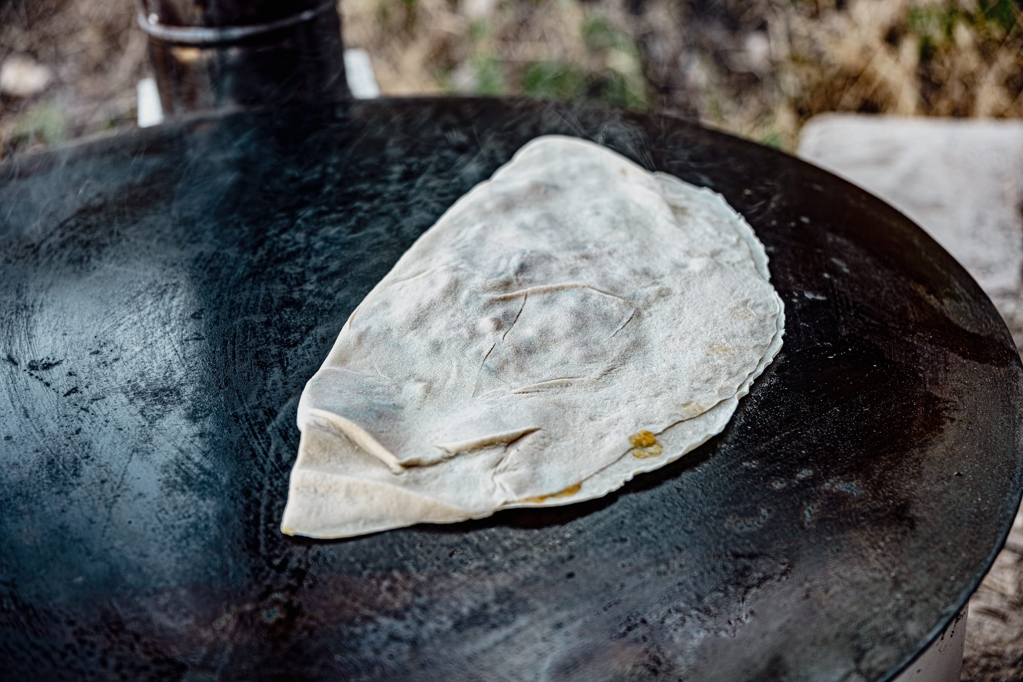 Traditional gözleme cooking over an open wood fire on a large outdoor griddle in Cappadocia