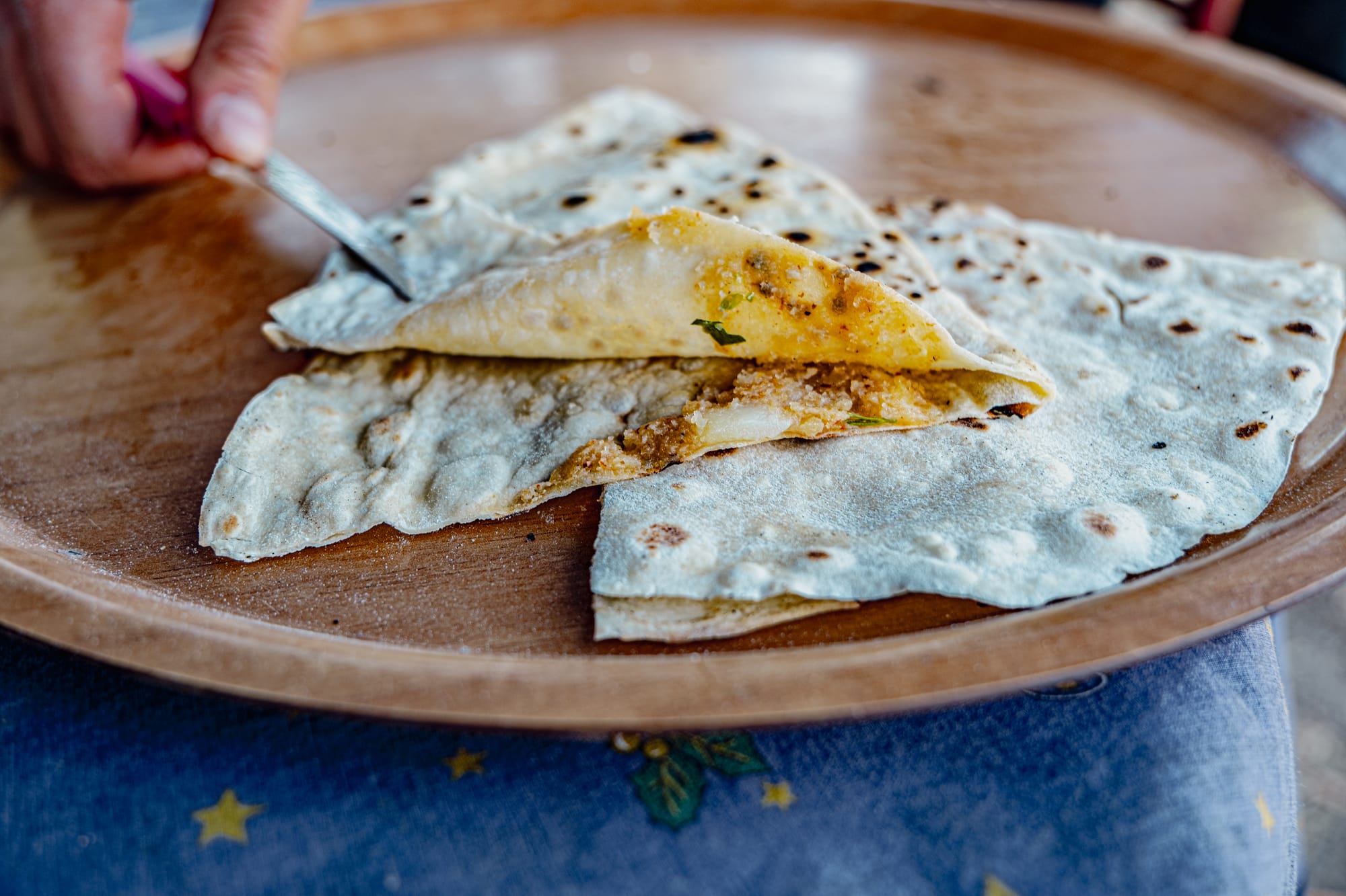 Freshly cooked gözleme filled with herby potato mash, its crispy exterior revealing the flavorful filling inside