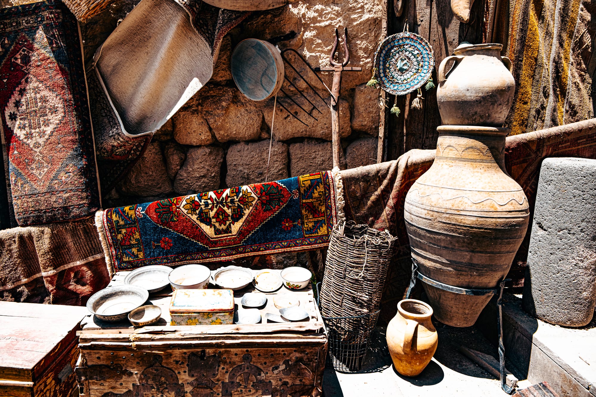 Sunlight filters through doorways, catching on the metallic glint of an old copper pot. The weave of a rug contrasts against the rough cave wall behind it.