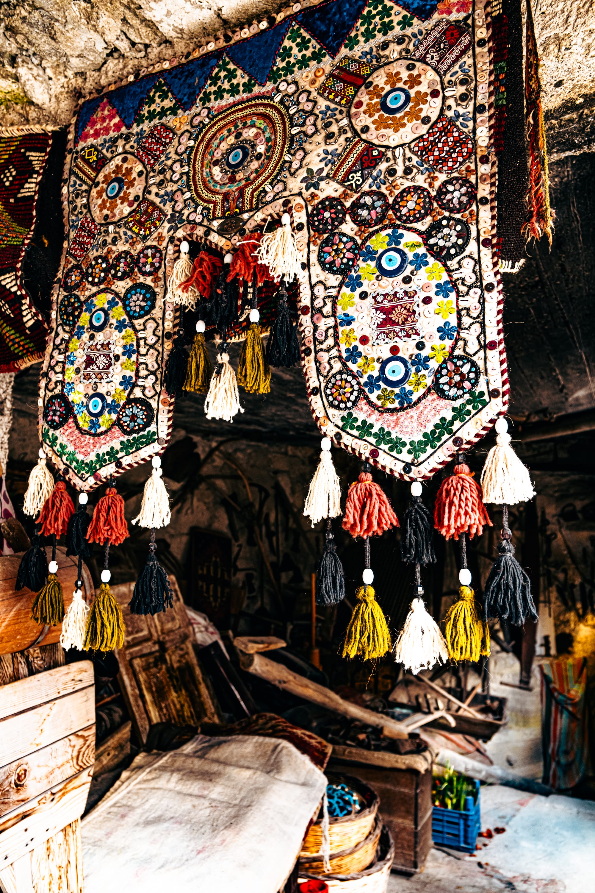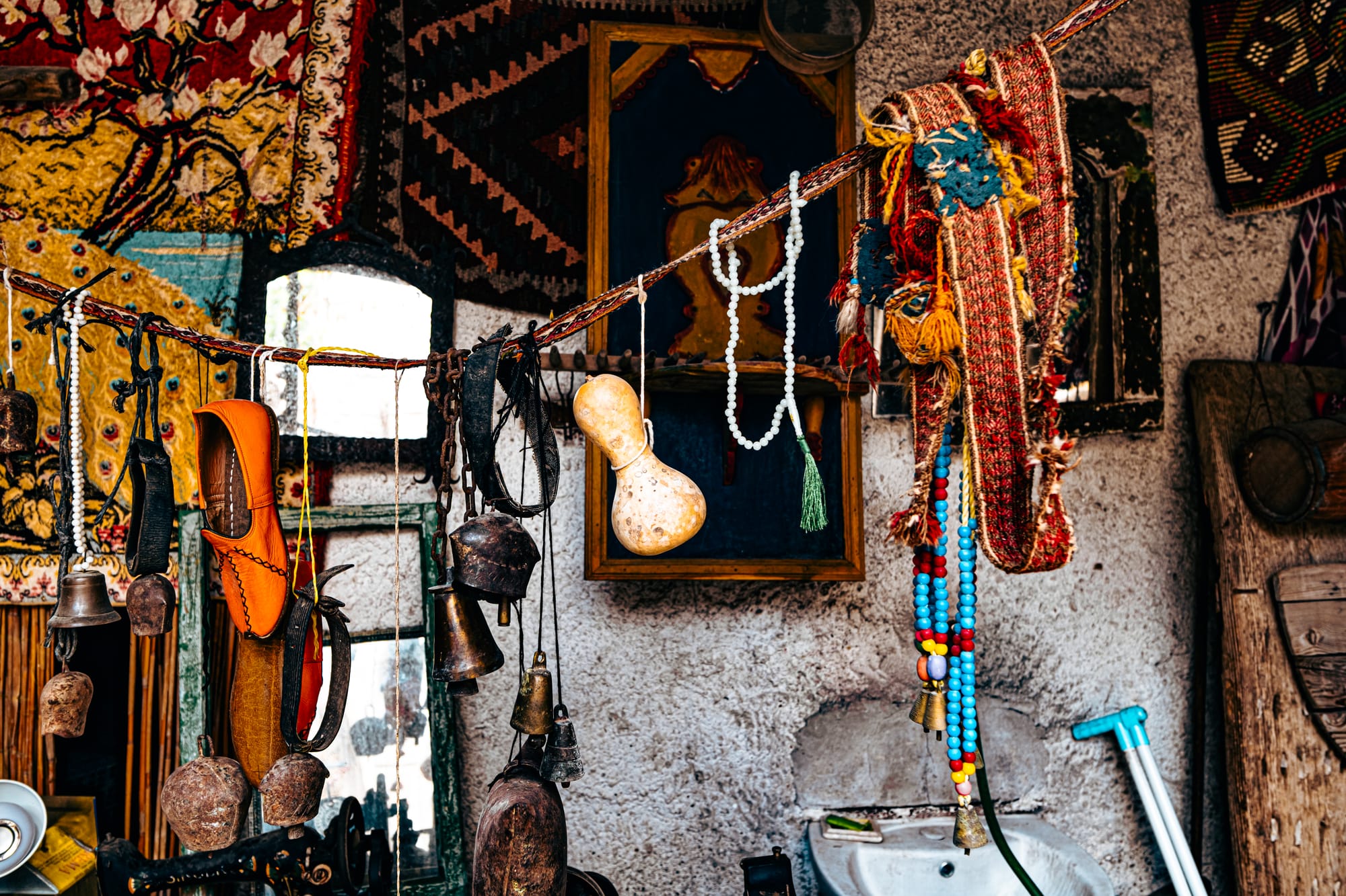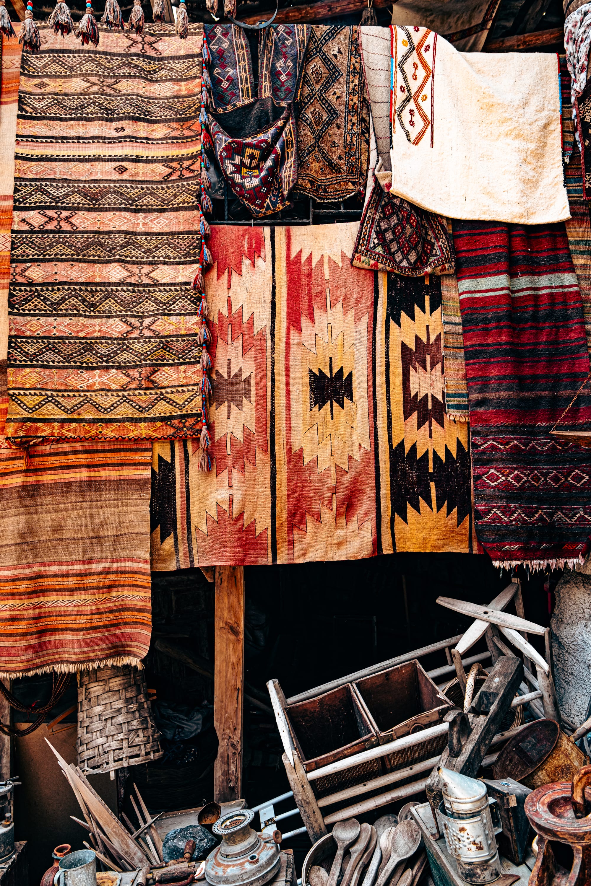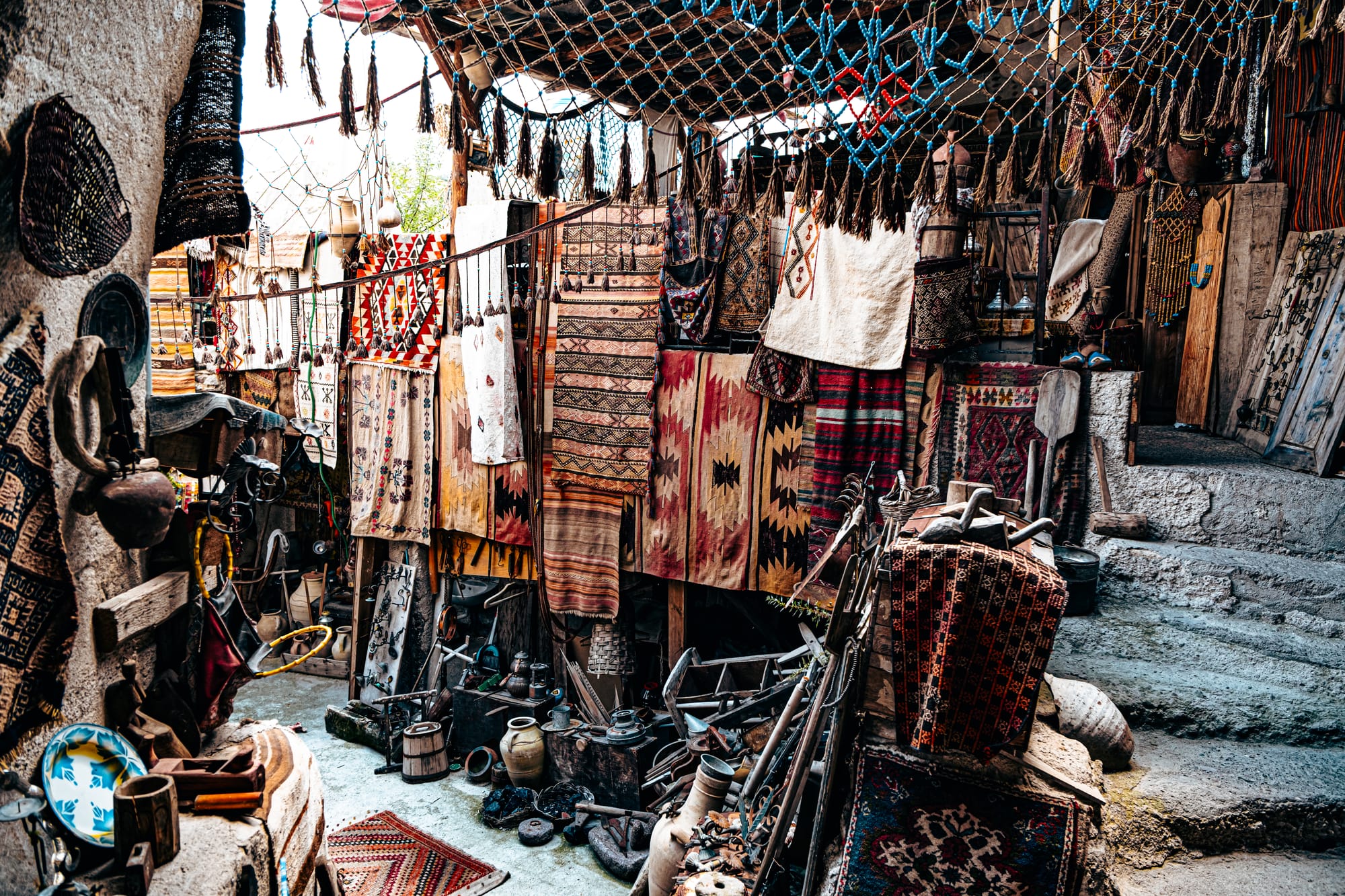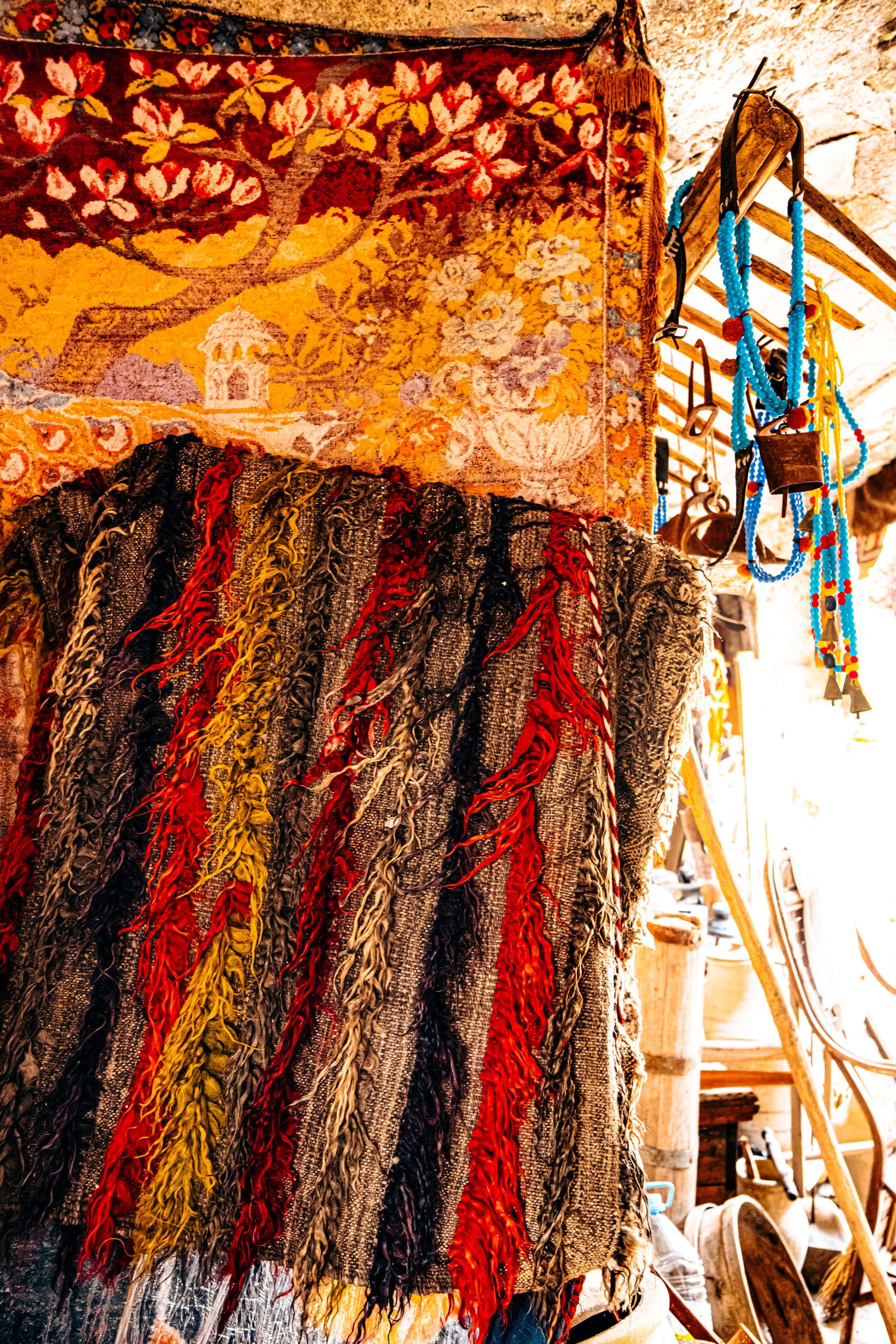The moment you enter, you’re surrounded by an explosion of texture and color. Every wall and surface is covered with something worth studying—handwoven carpets draped from the ceilings, antique kilim rugs rolled in stacks, hand-embroidered fabrics, and strings of beads and talismans.