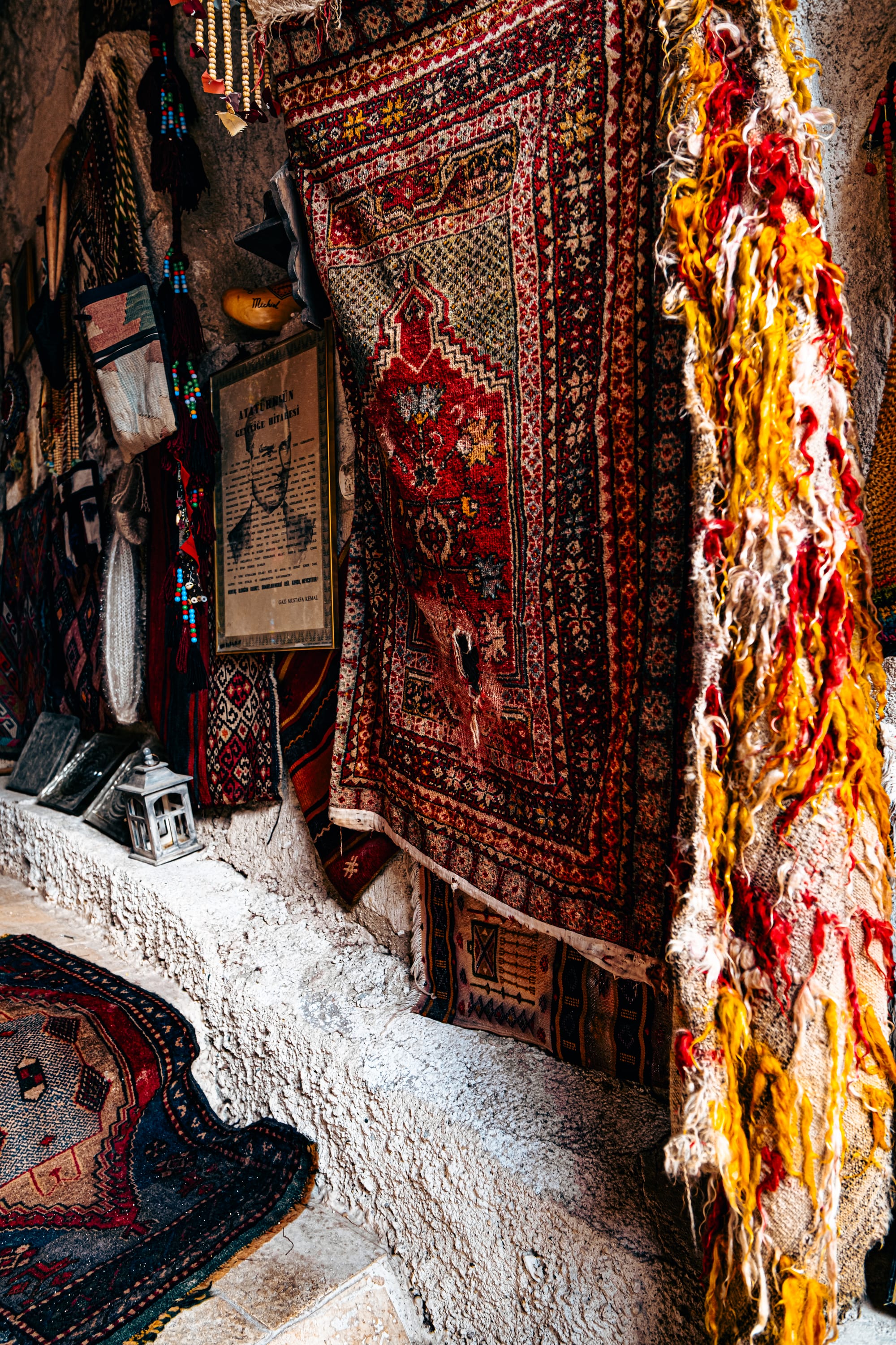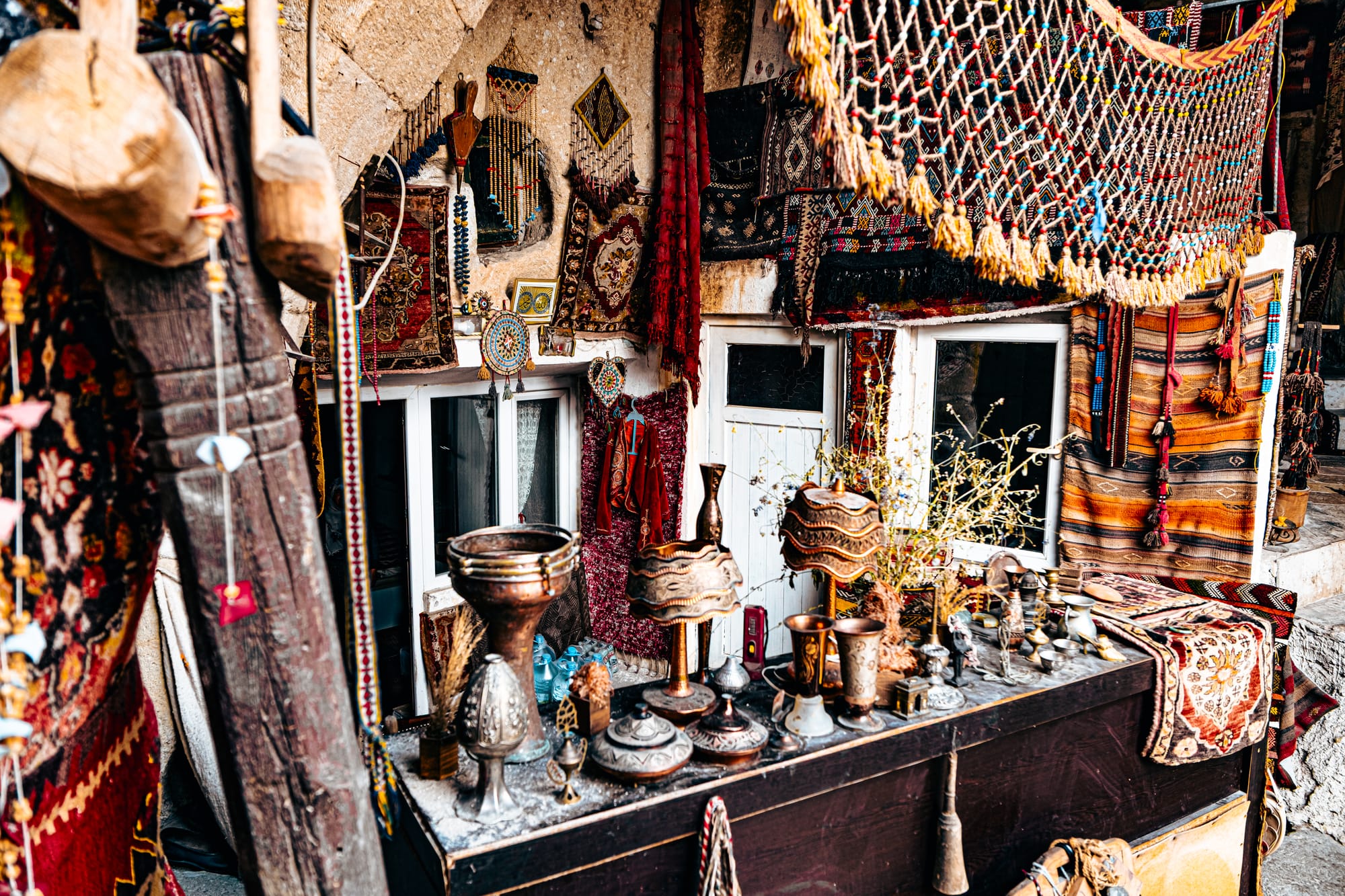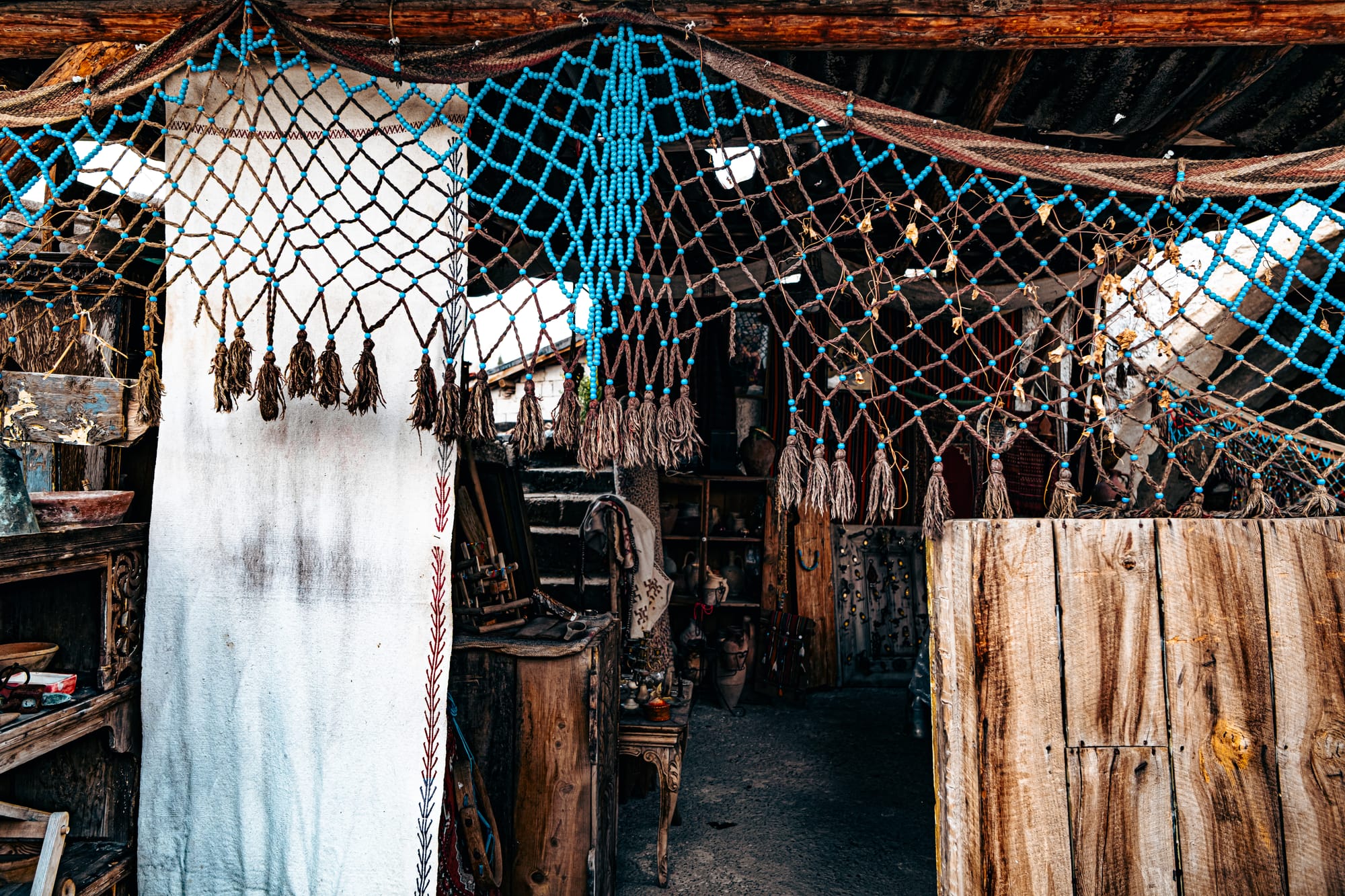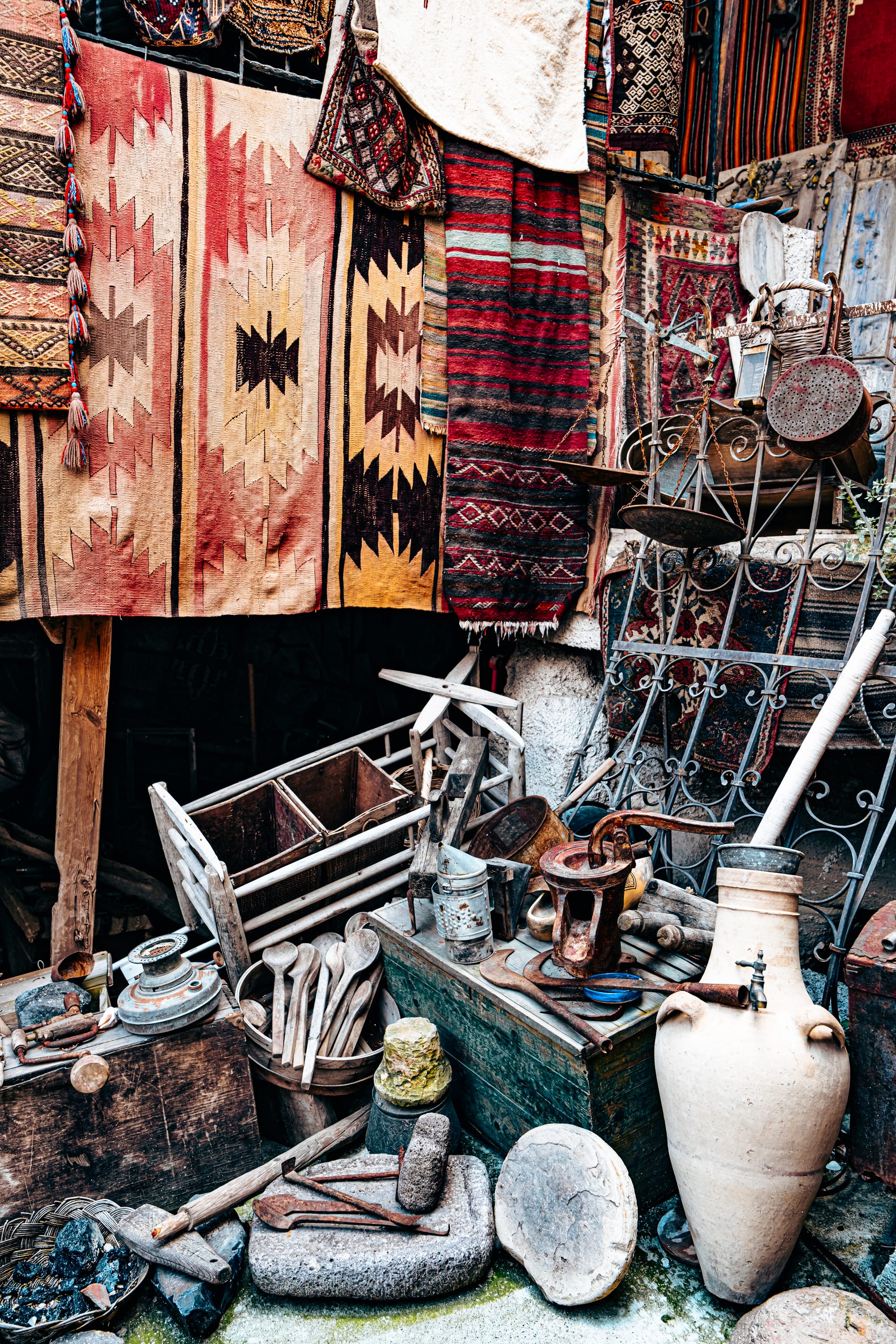 The moment you enter, you’re surrounded by an explosion of texture and color. Every wall and surface is covered with something worth studying—handwoven carpets draped from the ceilings, antique kilim rugs rolled in stacks, hand-embroidered fabrics, and strings of beads and talismans.