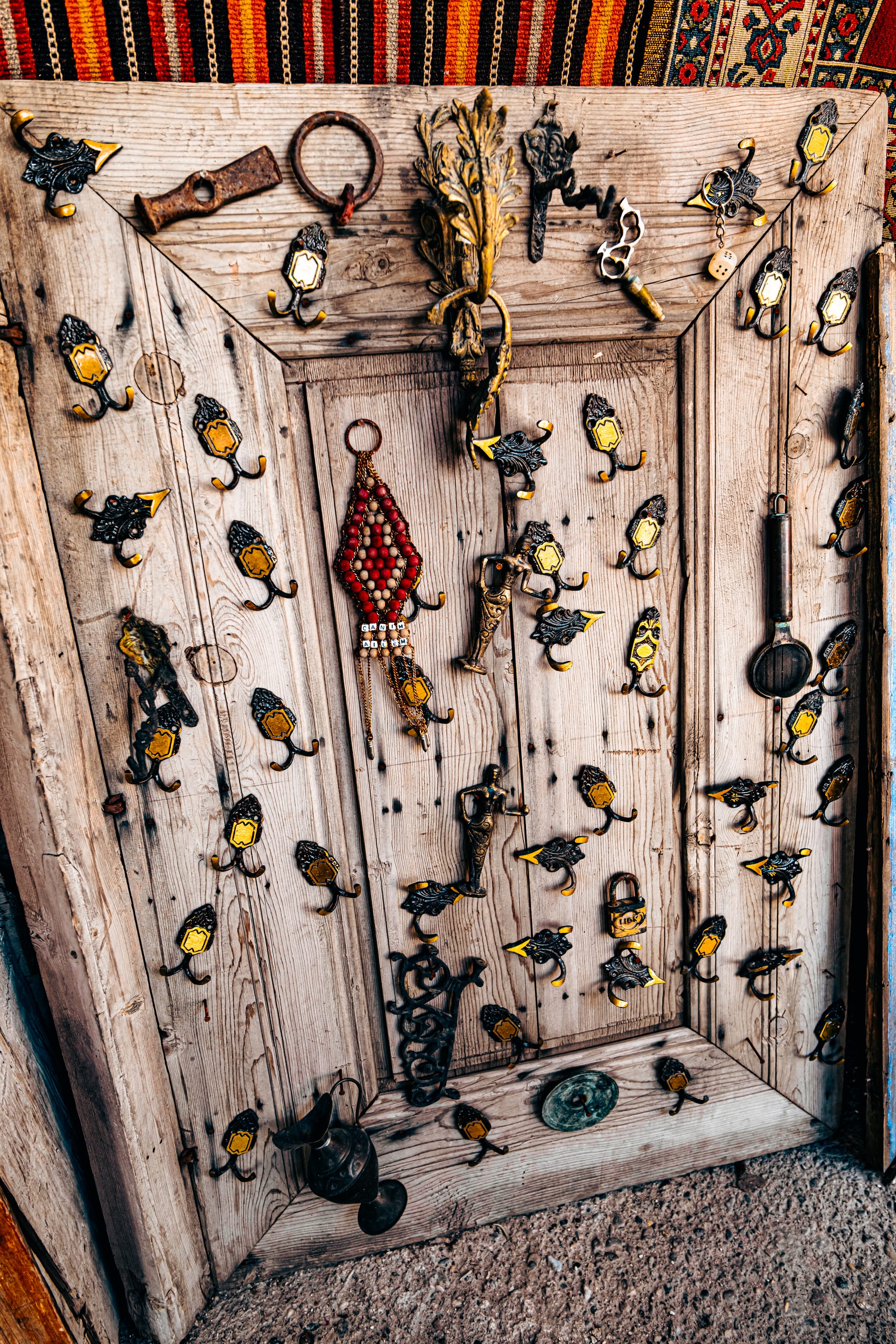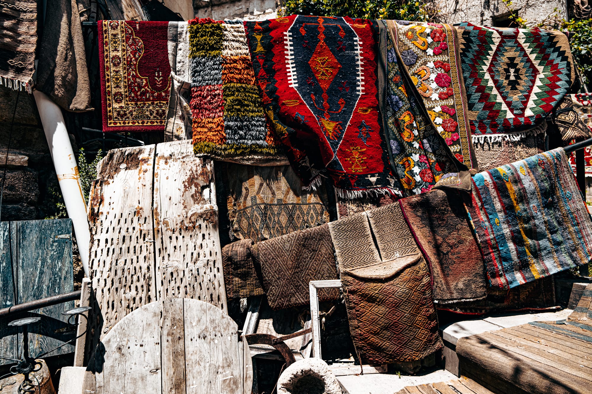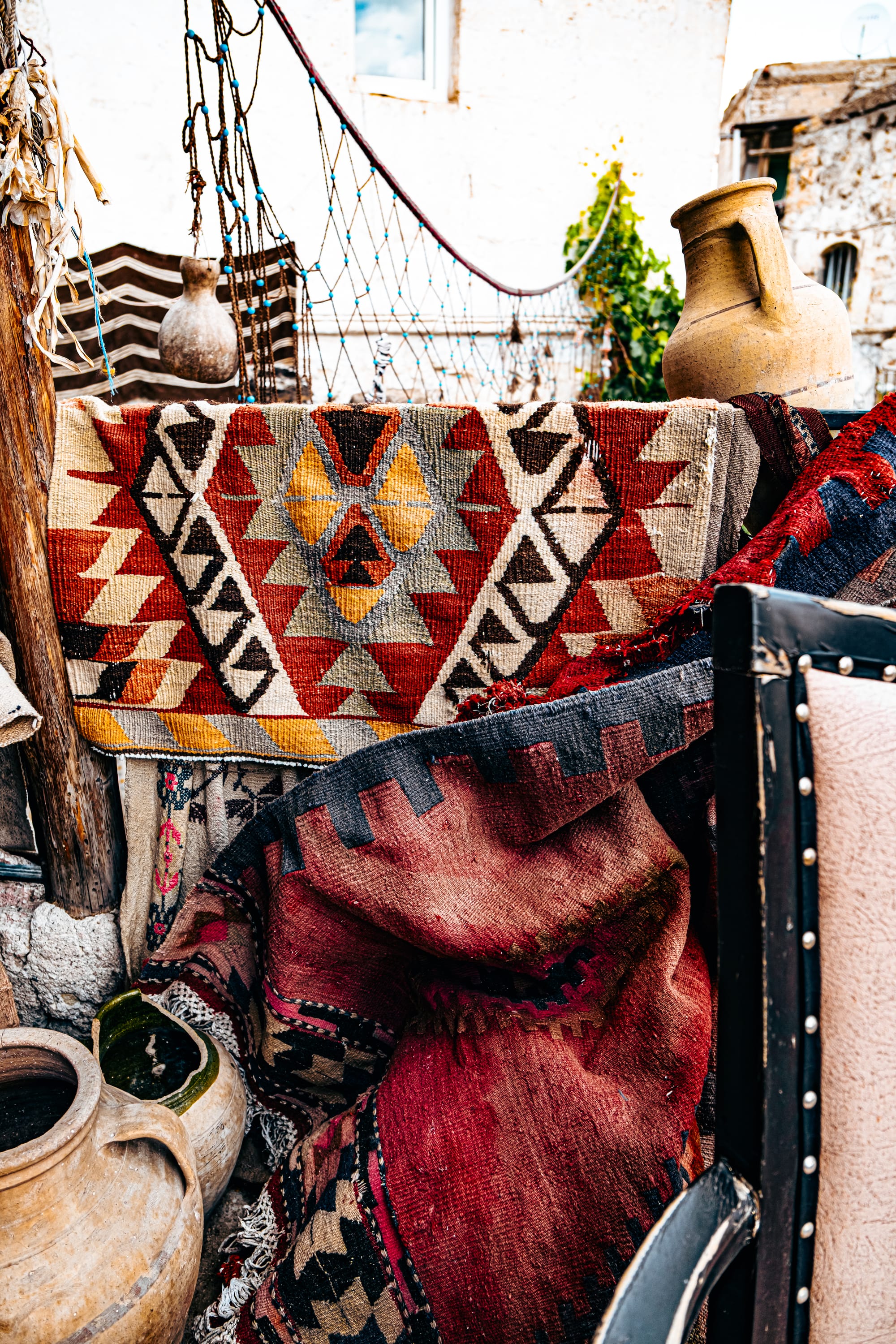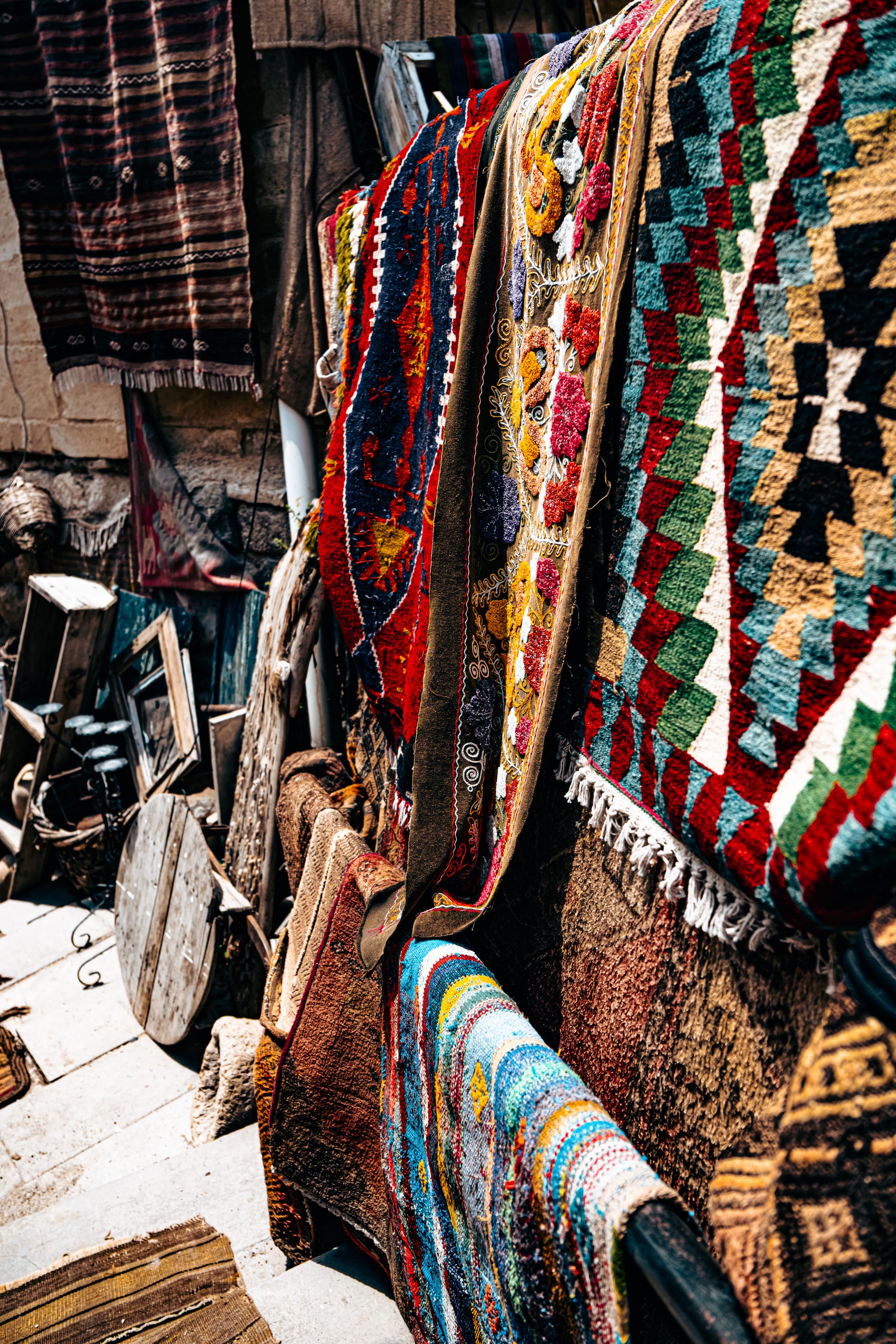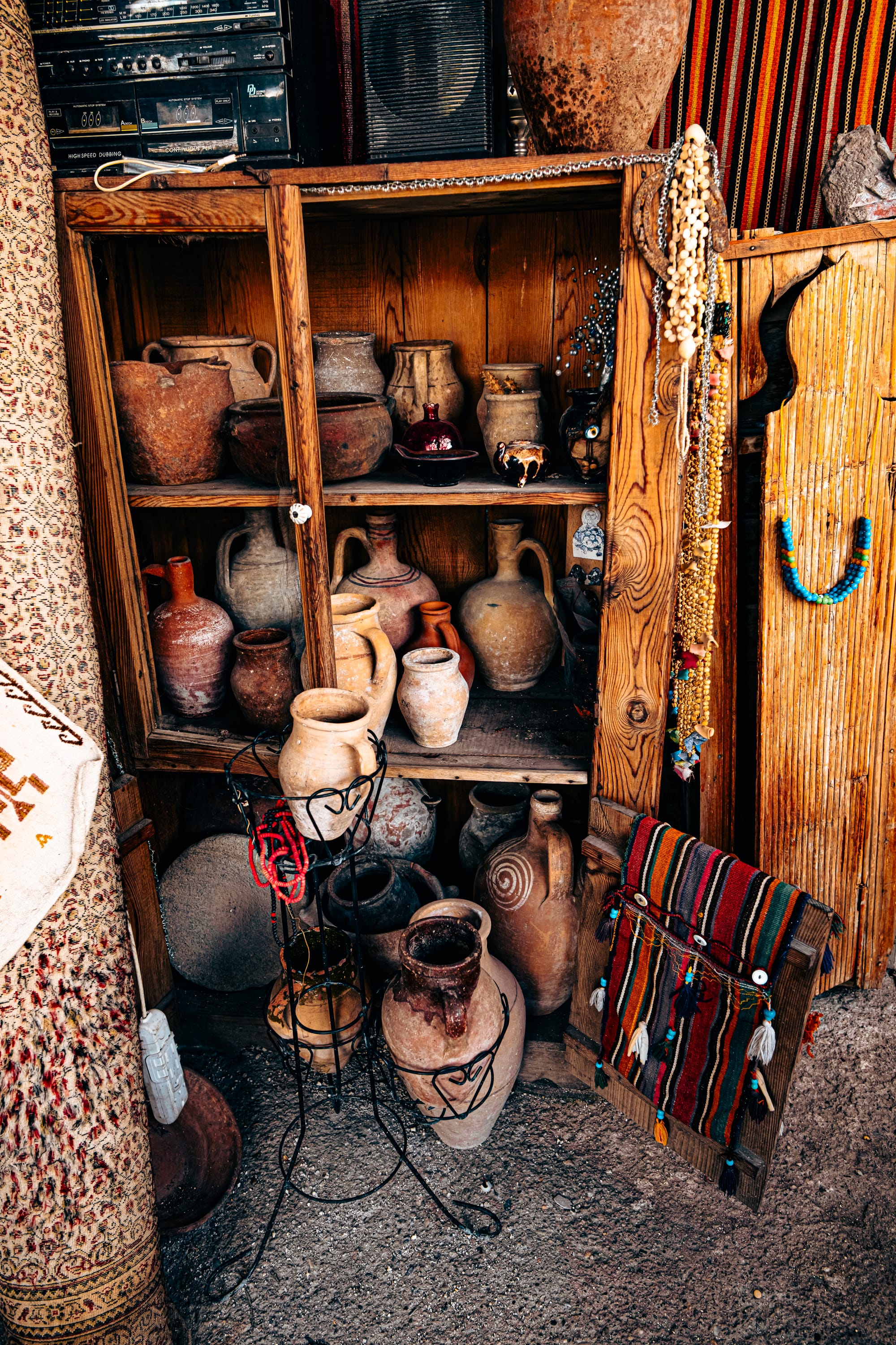 The moment you enter, you’re surrounded by an explosion of texture and color. Every wall and surface is covered with something worth studying—handwoven carpets draped from the ceilings, antique kilim rugs rolled in stacks, hand-embroidered fabrics, and strings of beads and talismans.