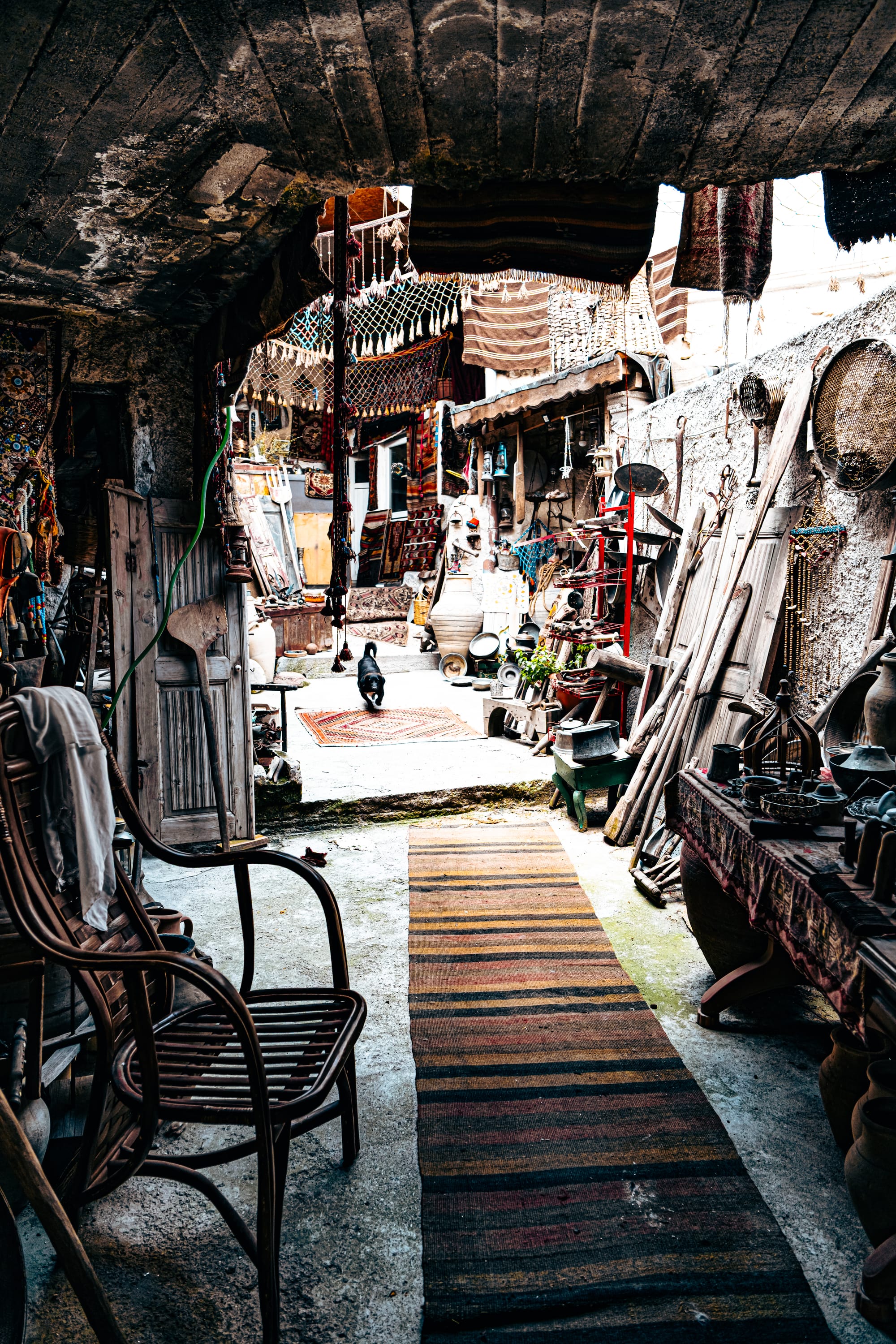 Courtyard of Cappadocia Cultural Antique Collection filled with hanging rugs, pottery, metalware, and vintage artifacts
