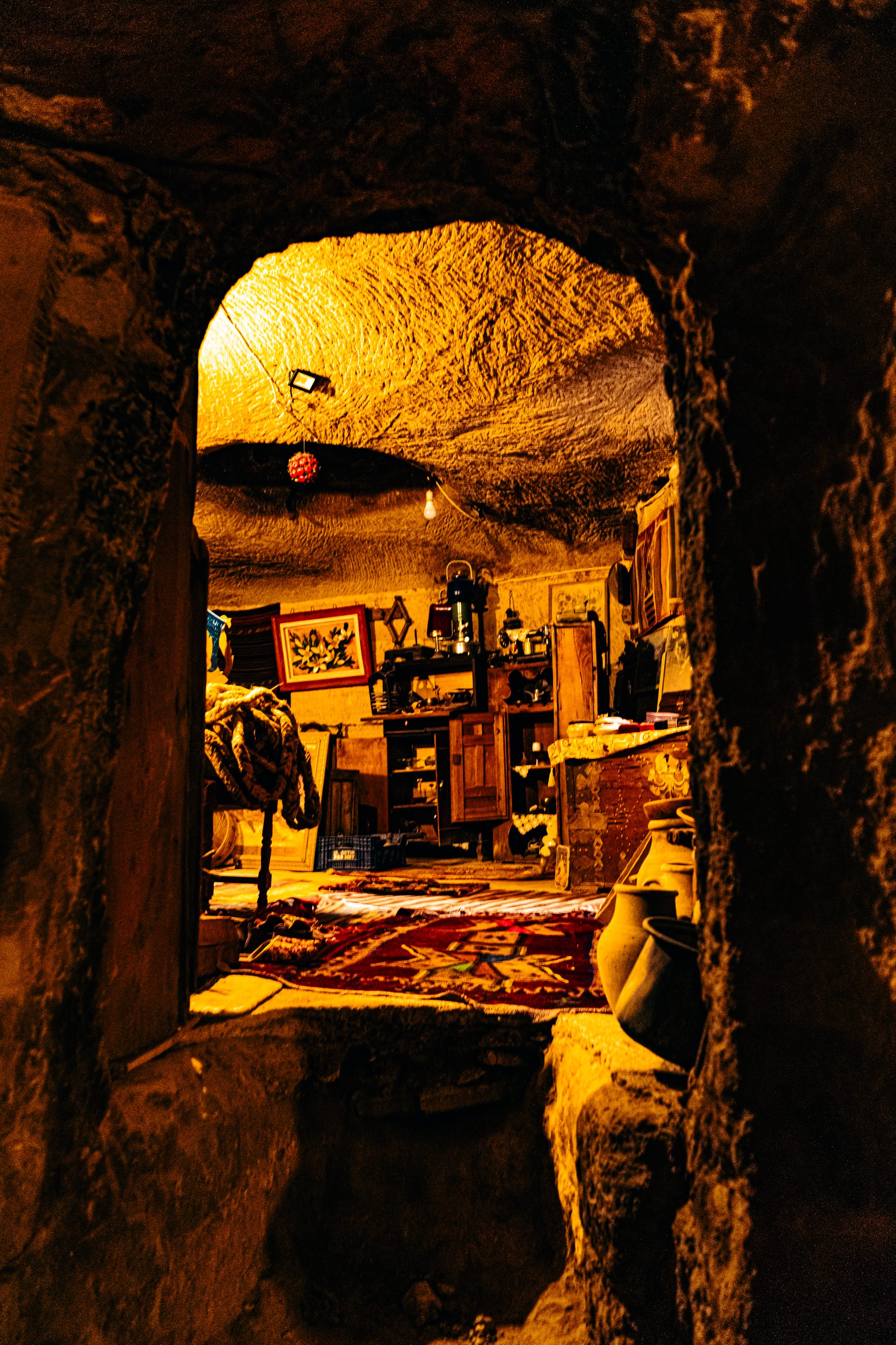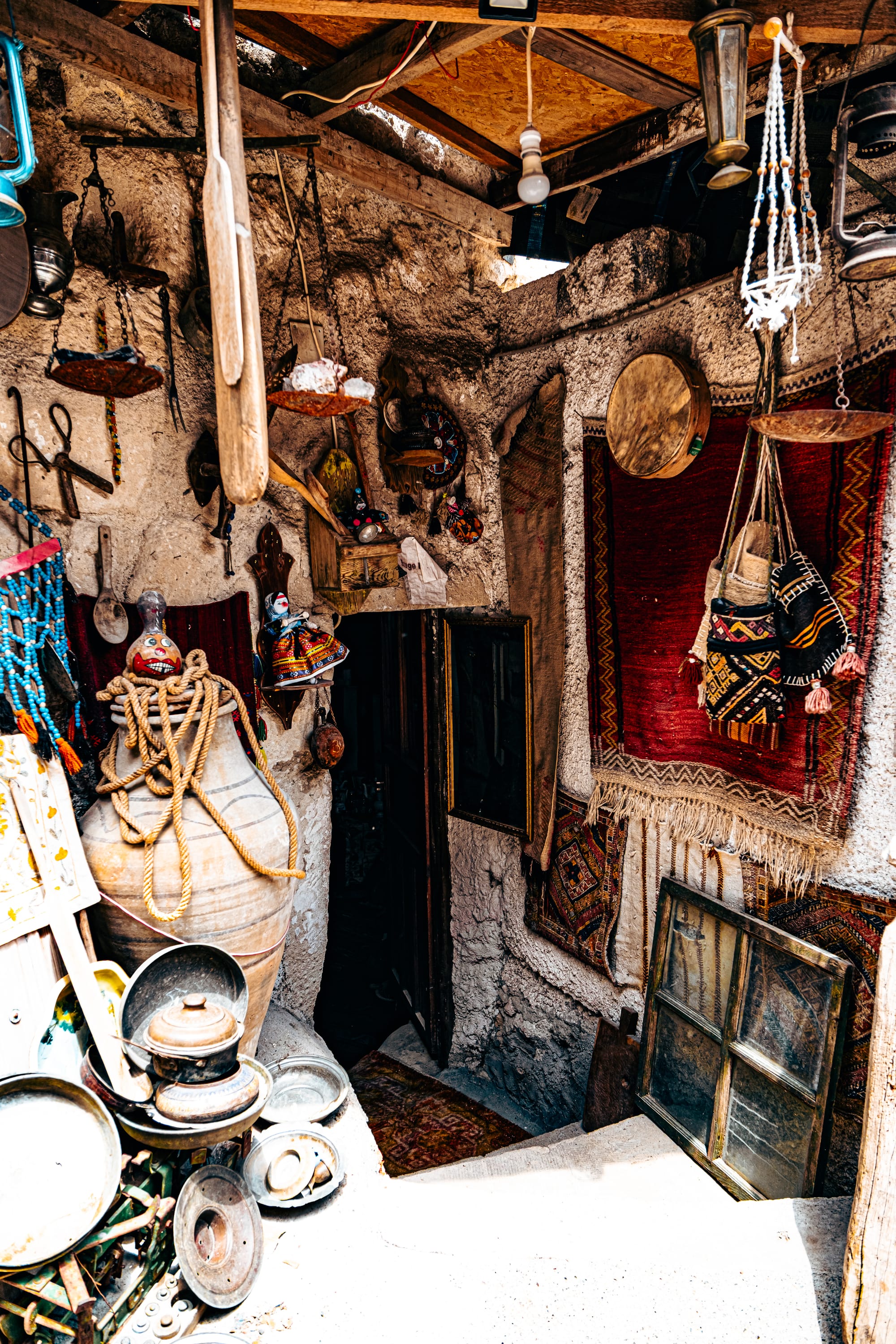 Back inside, doorways lead you into dimly lit cave rooms carved into the soft volcanic rock. Each space houses more treasures—some arranged neatly on shelves, others leaning casually against walls as if waiting to be rediscovered.