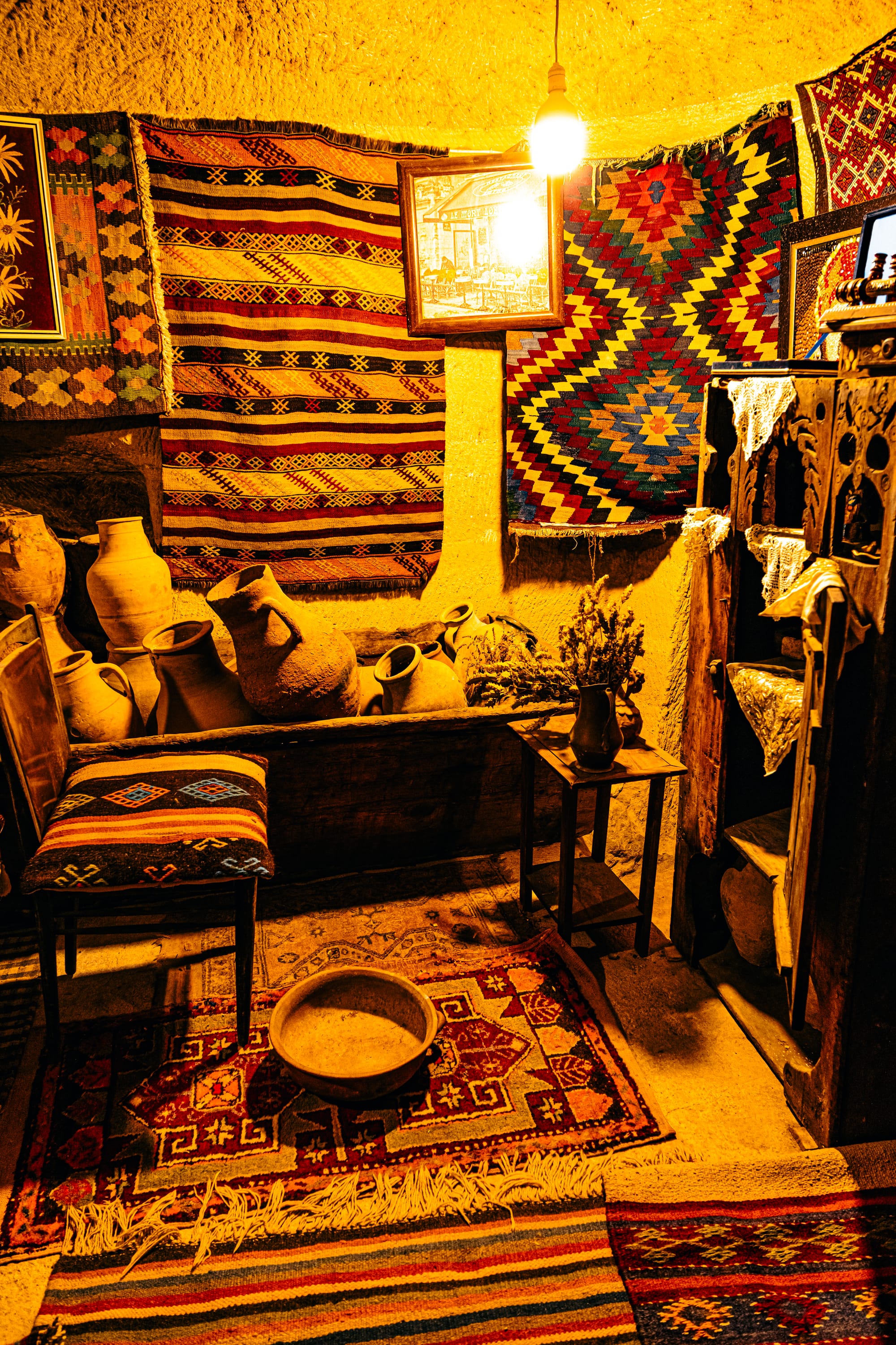 Interior of Cappadocia Cultural Antique Collection cave room filled with pottery, woven rugs, traditional Anatolian artifacts, and vintage household items illuminated by warm lighting