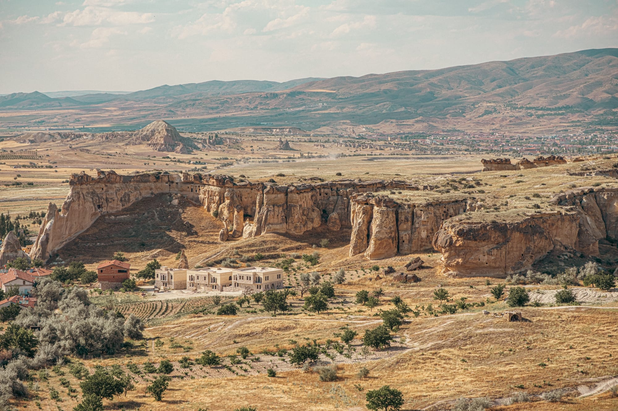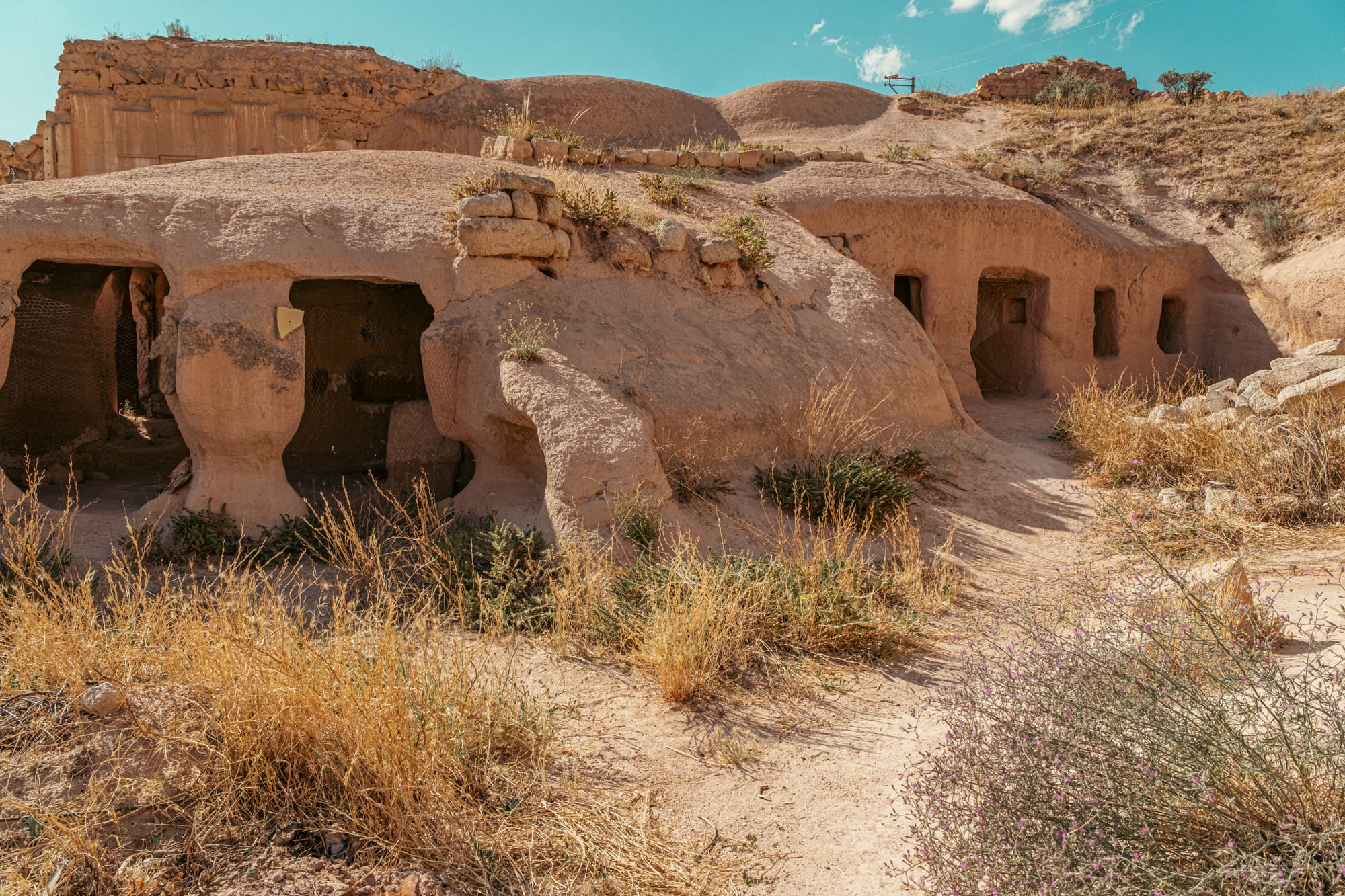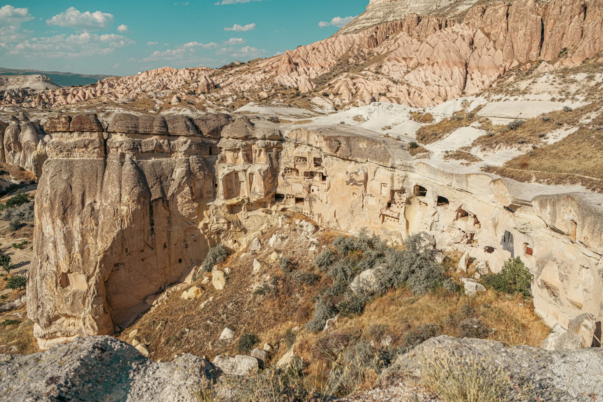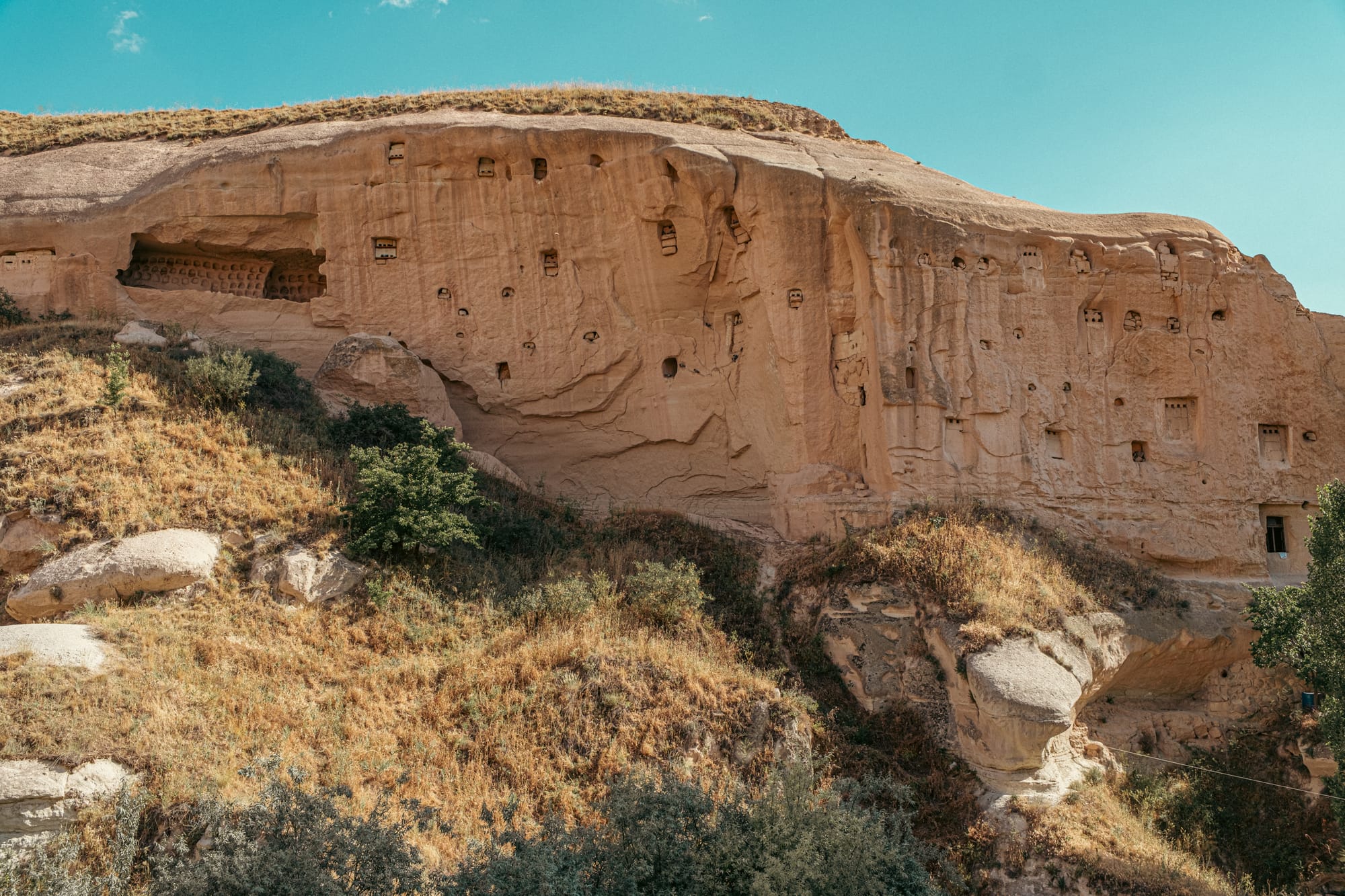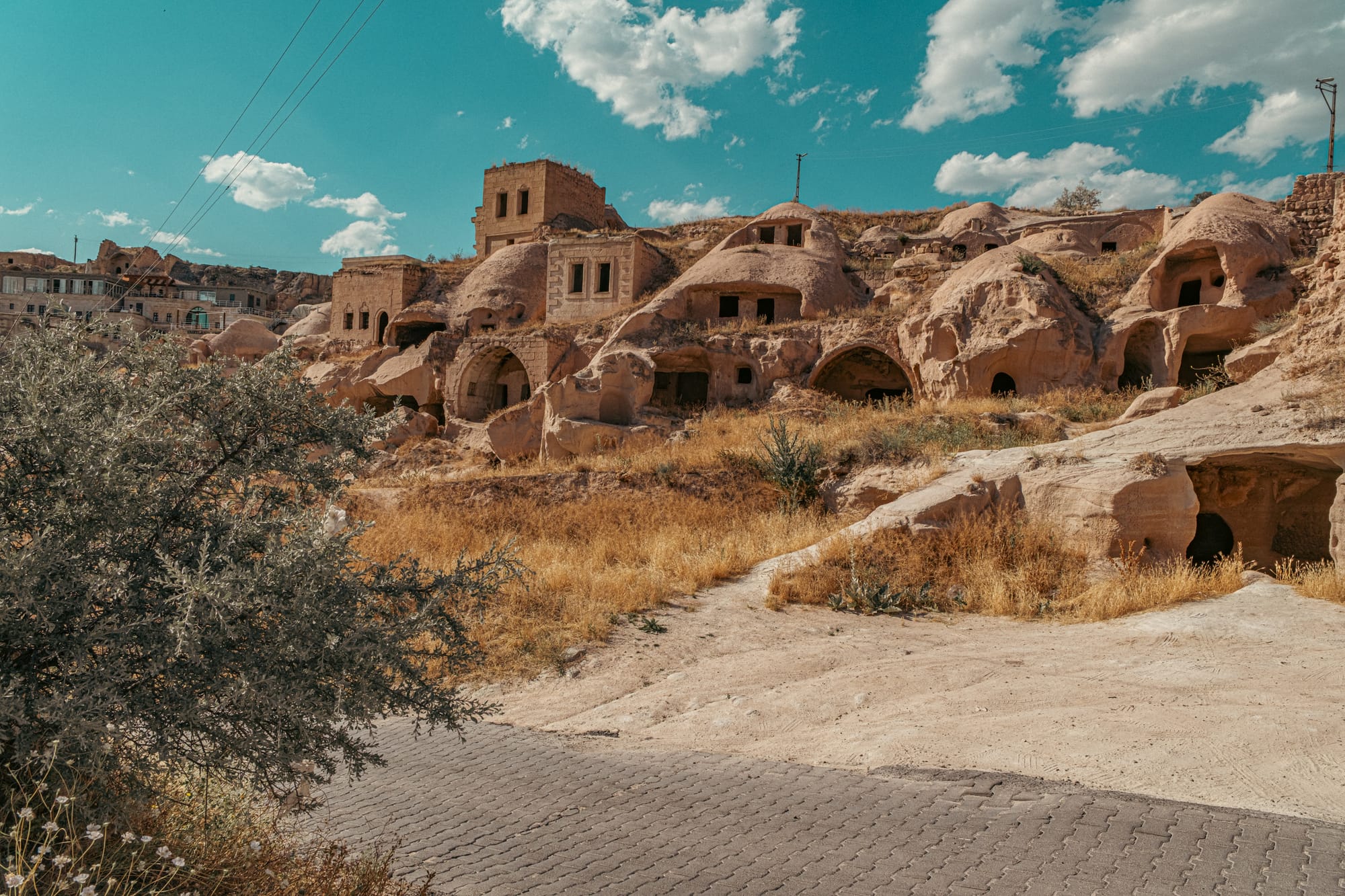 Ancient cave entrances and stone ruins along the lower slopes of Çavuşin village