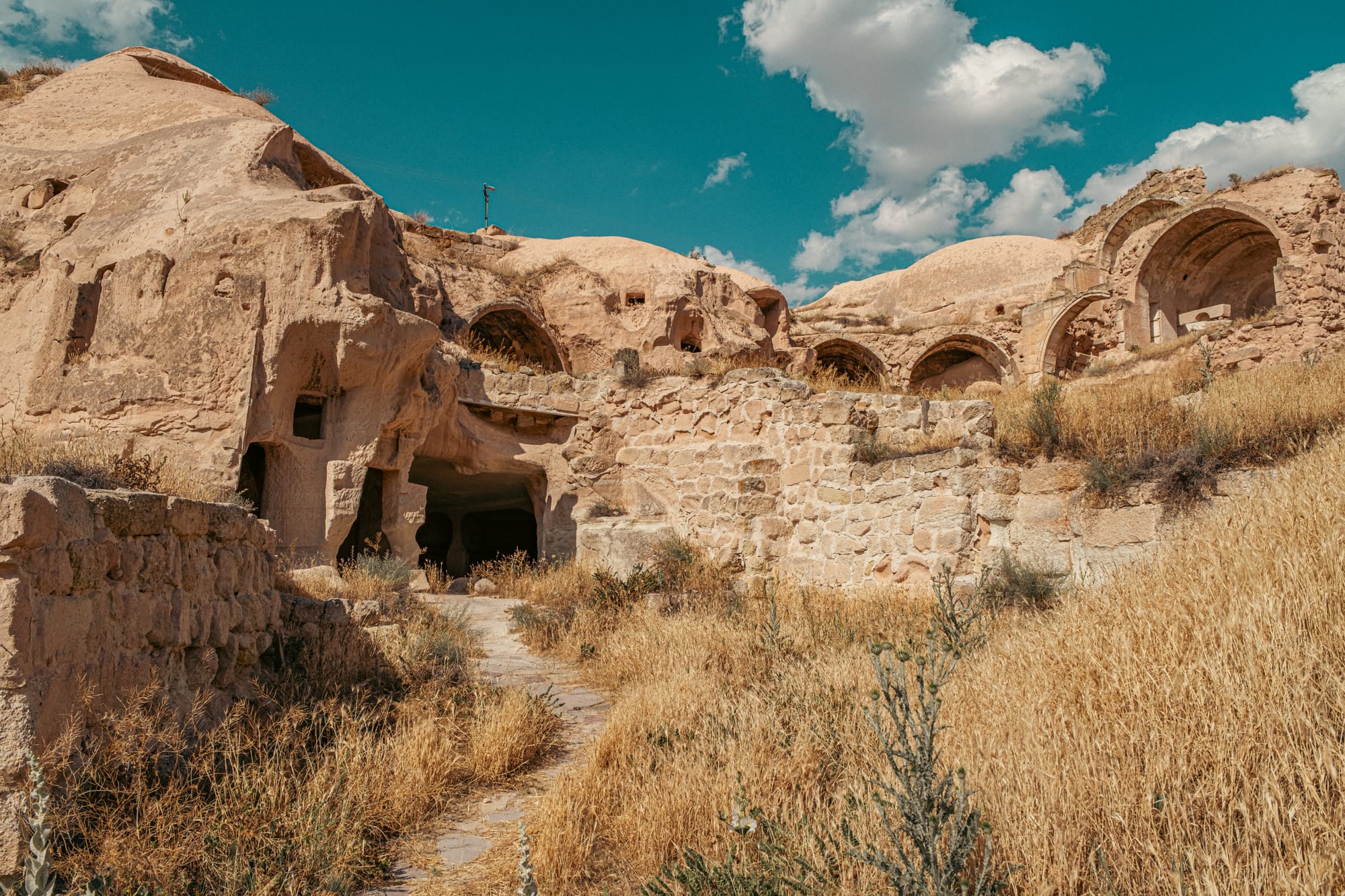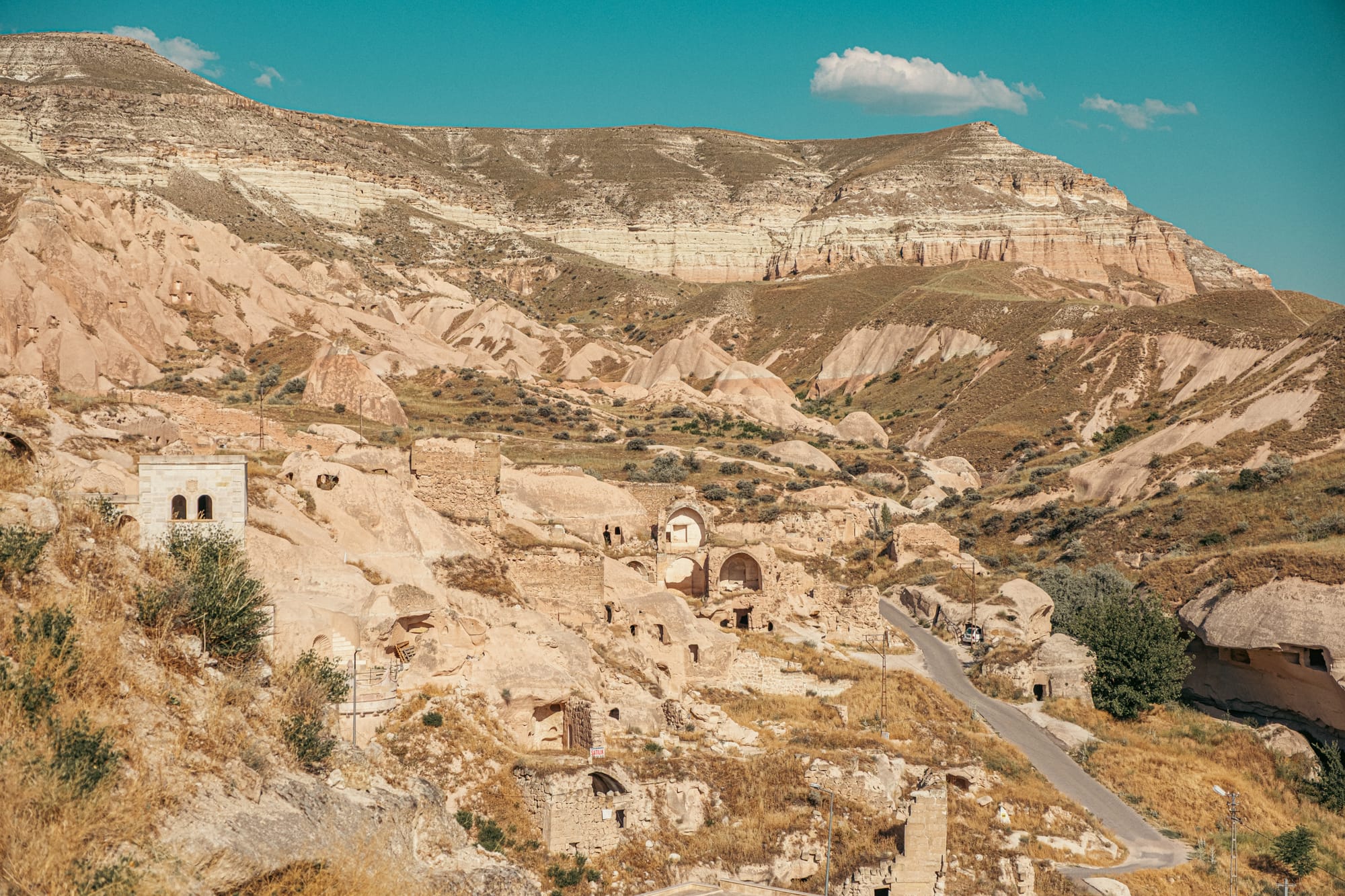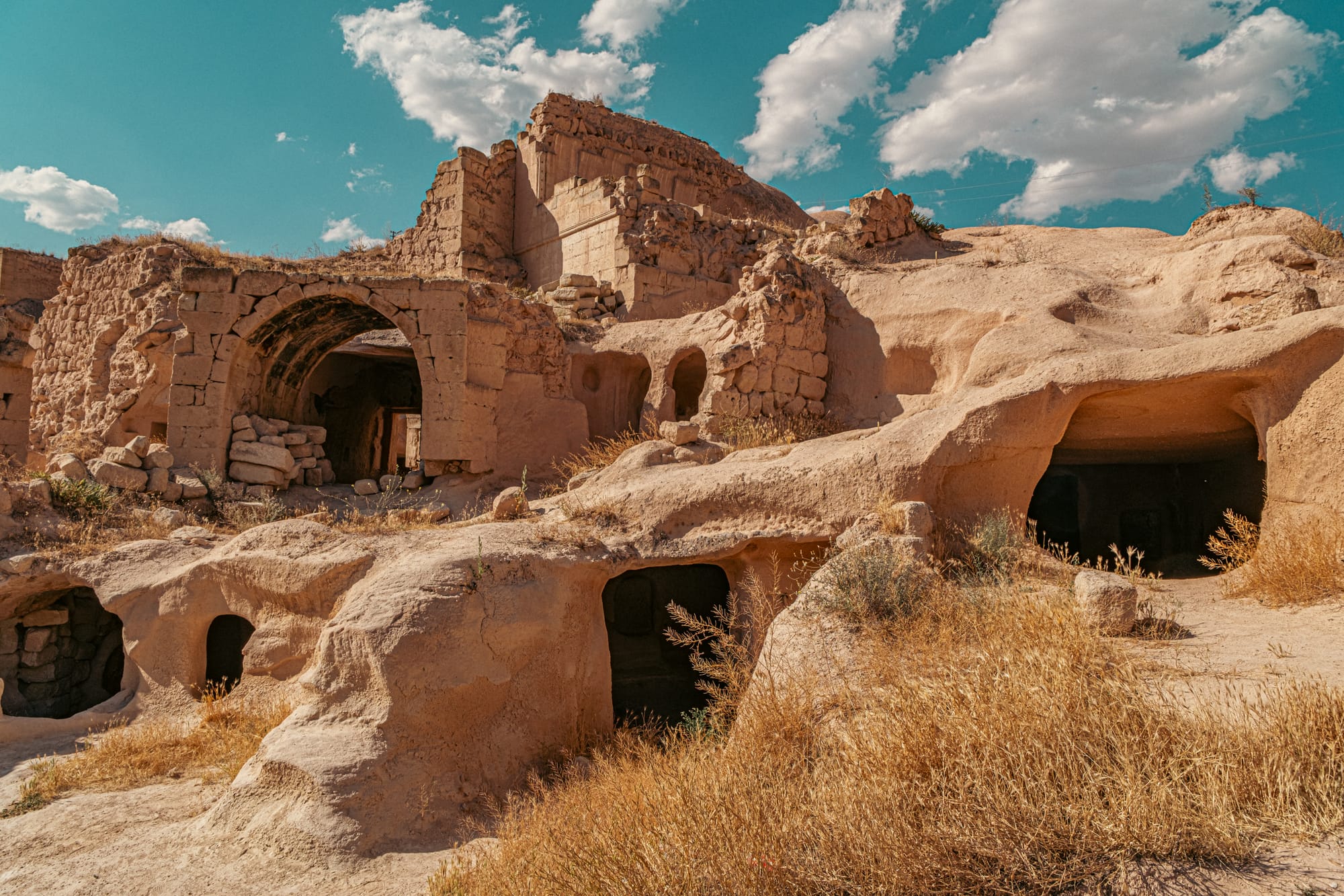 Stone archways and cave homes carved into the rocky landscape of Çavuşin