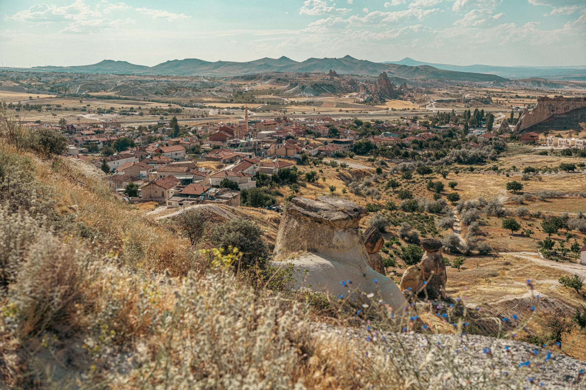 Sweeping views of Çavuşin village and surrounding rock formations from the castle path
