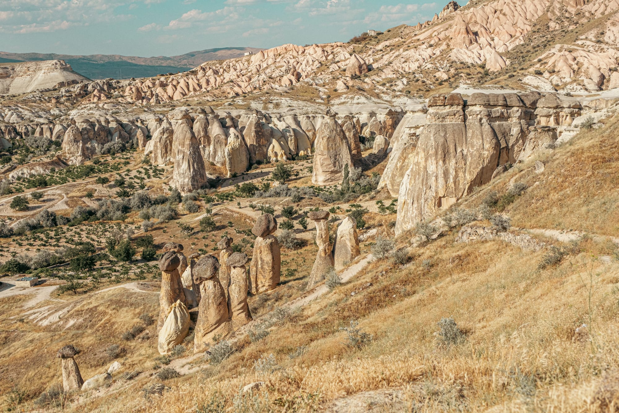 To one side, the soft curves of Rose Valley unfold in shades of cream and pink; to the other, distant fairy chimneys rise like ancient sentinels from the earth.