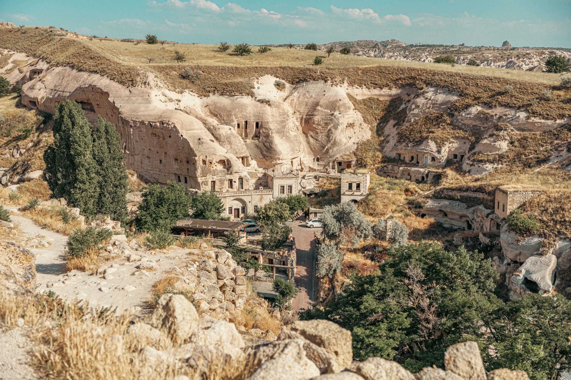 To the east, you can trace the sinuous curves of Rose Valley; to the west, the fairy chimneys stand like sentinels against the horizon. Below, the village’s patchwork of homes and gardens forms a tranquil counterpoint to the rugged beauty of the cliffs.