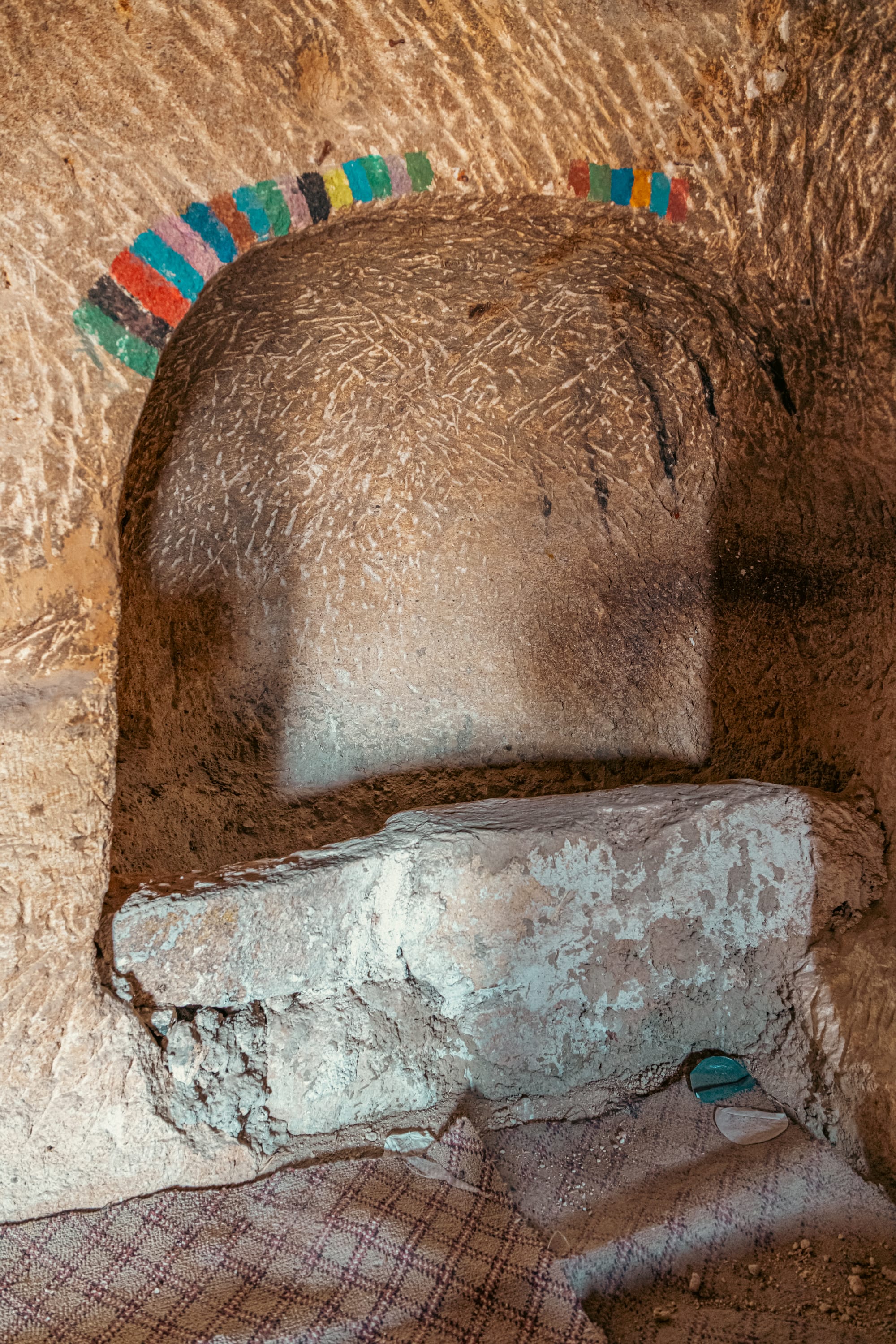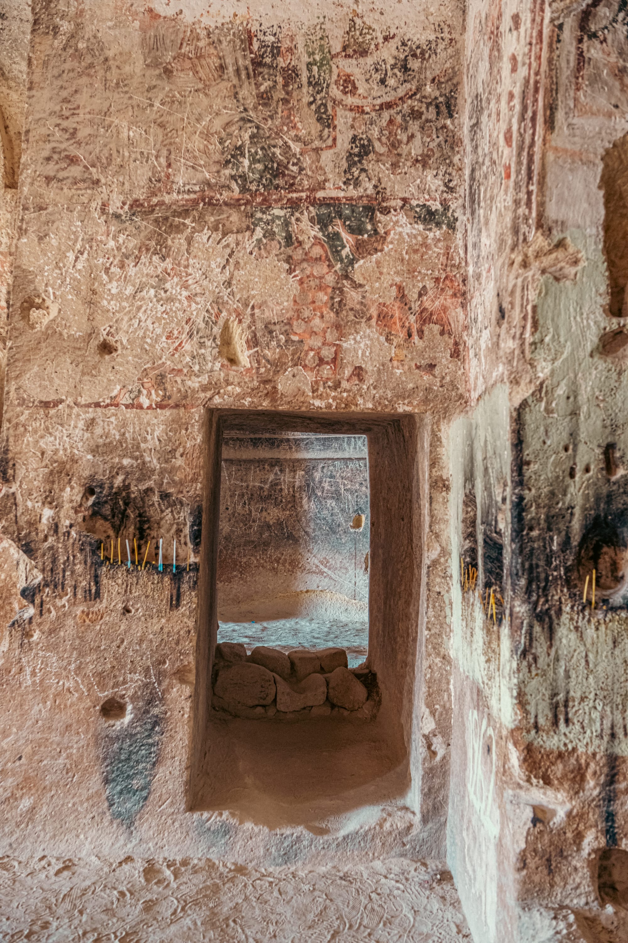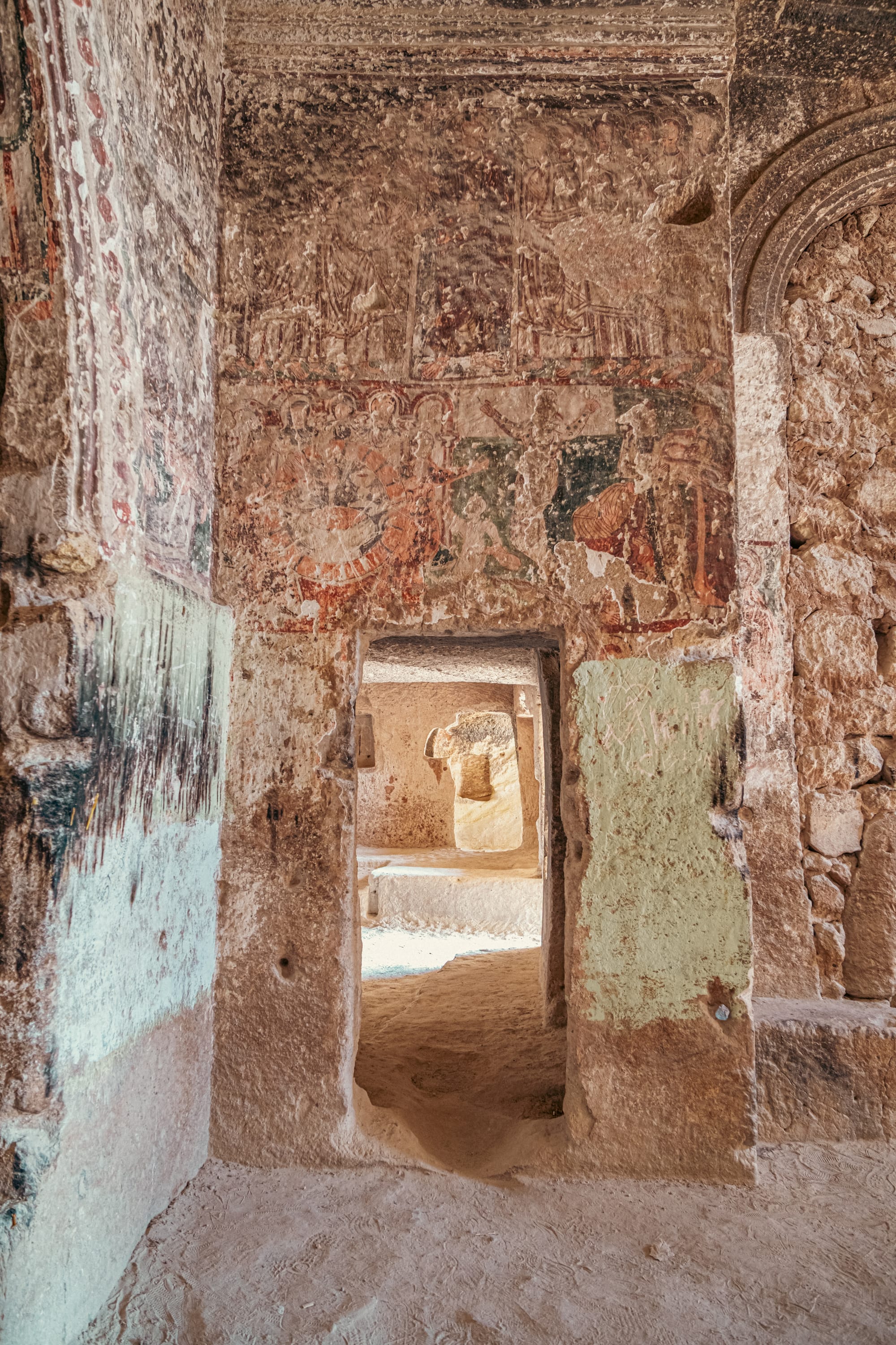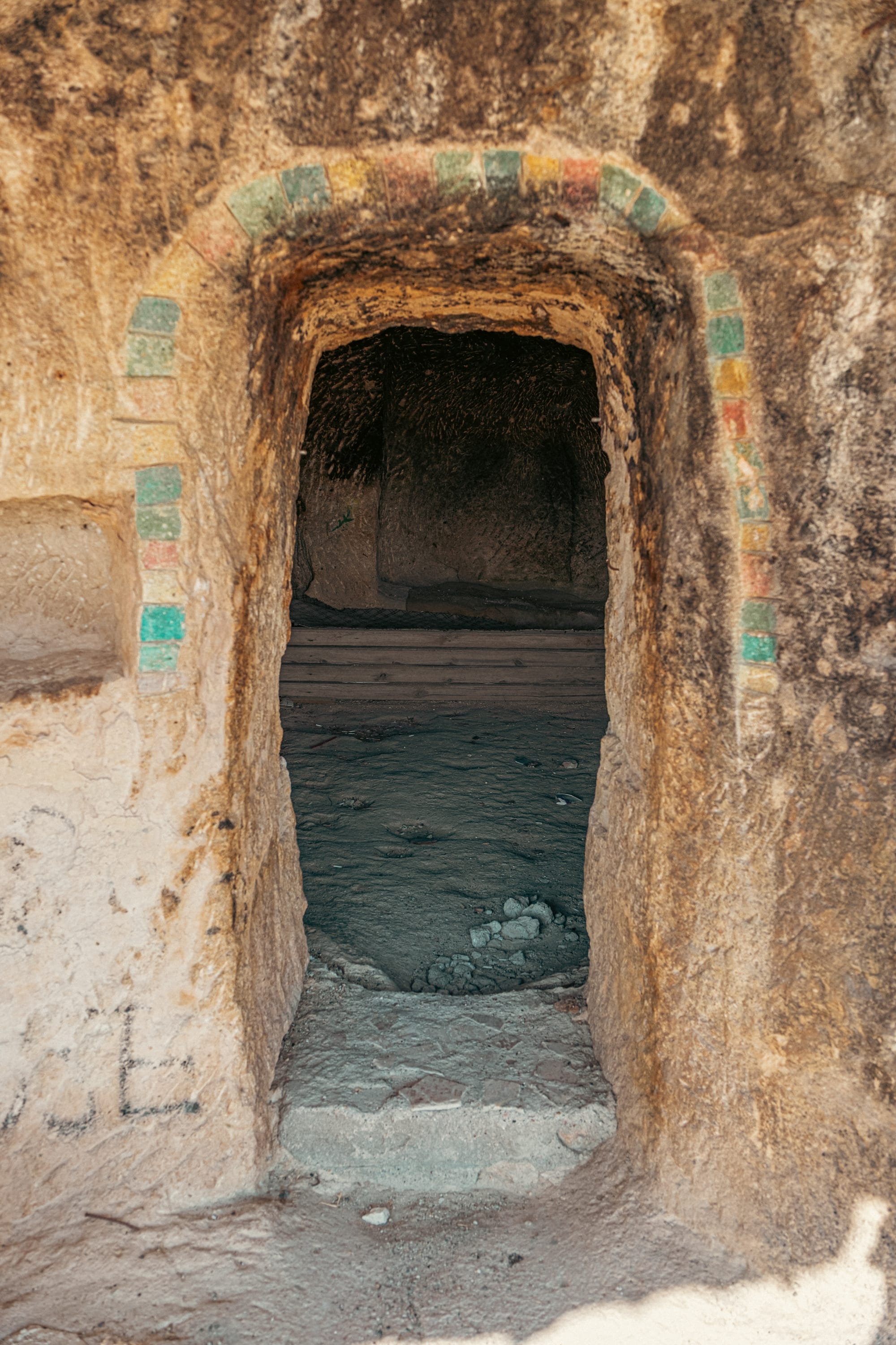 Colorful painted arches frame ancient doorways and alcoves inside Çavuşin’s rock-carved castle rooms