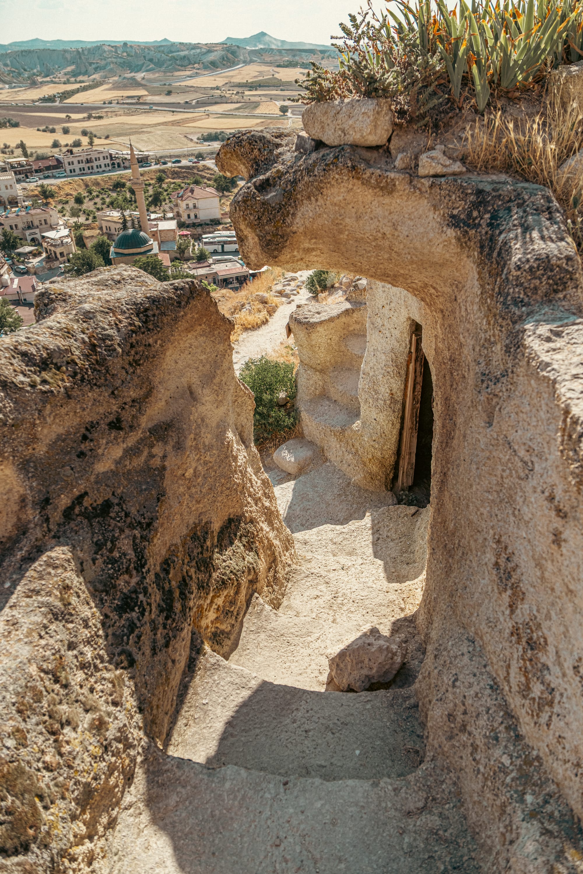 Ancient stone doorways and staircases offering breathtaking views from Çavuşin Castle