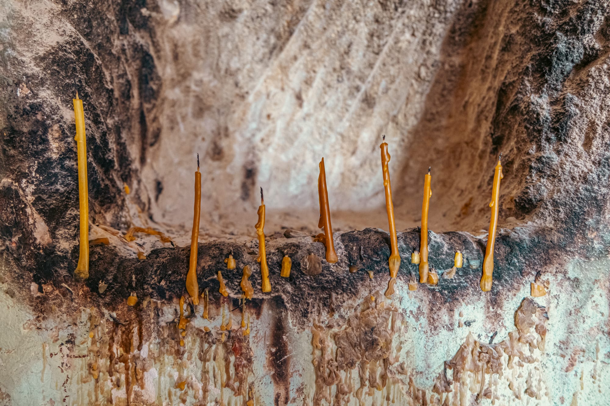 Candles flicker softly inside a weathered stone chamber of Çavuşin Castle