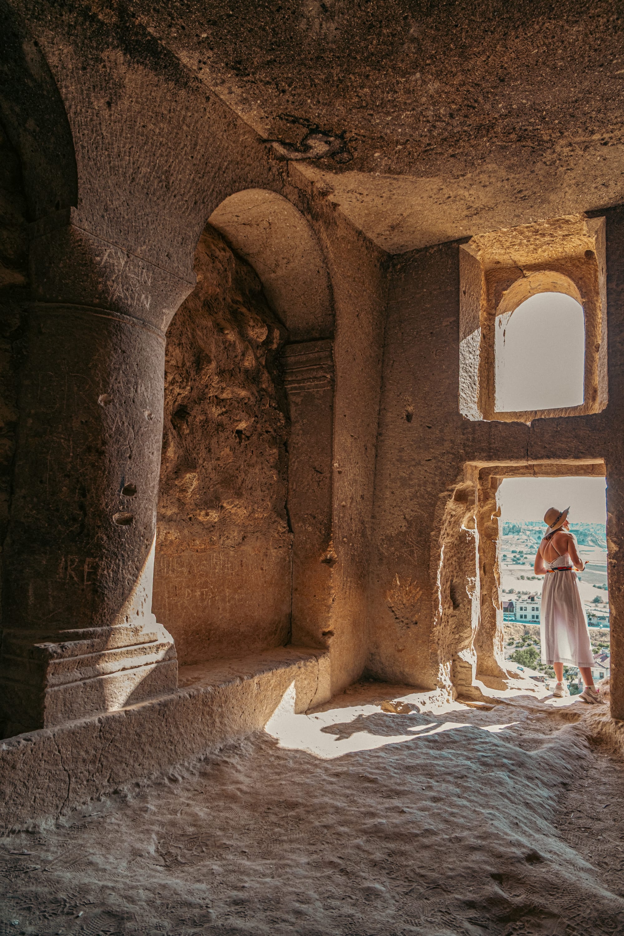 Ancient stone archways and sunlit windows inside the upper chambers of Çavuşin Castle