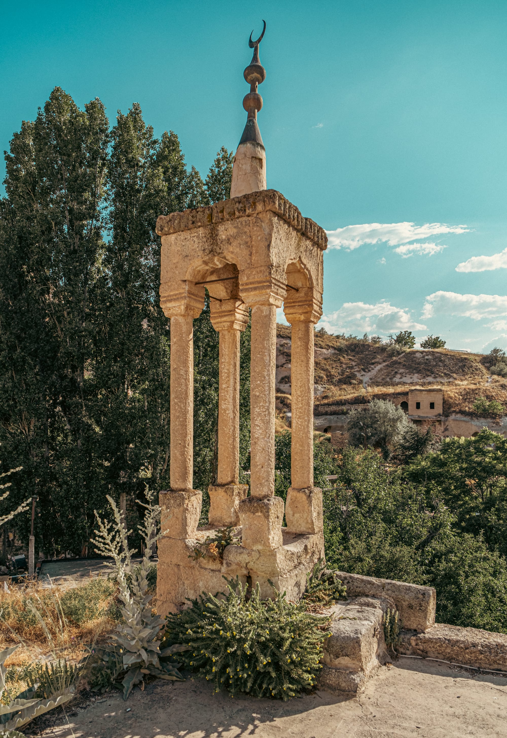 Historic stone minaret and sweeping views of Çavuşin’s rugged cave dwellings and dramatic cliffs