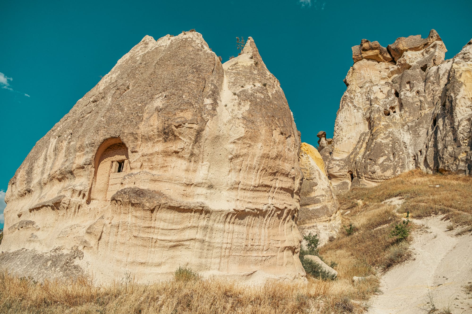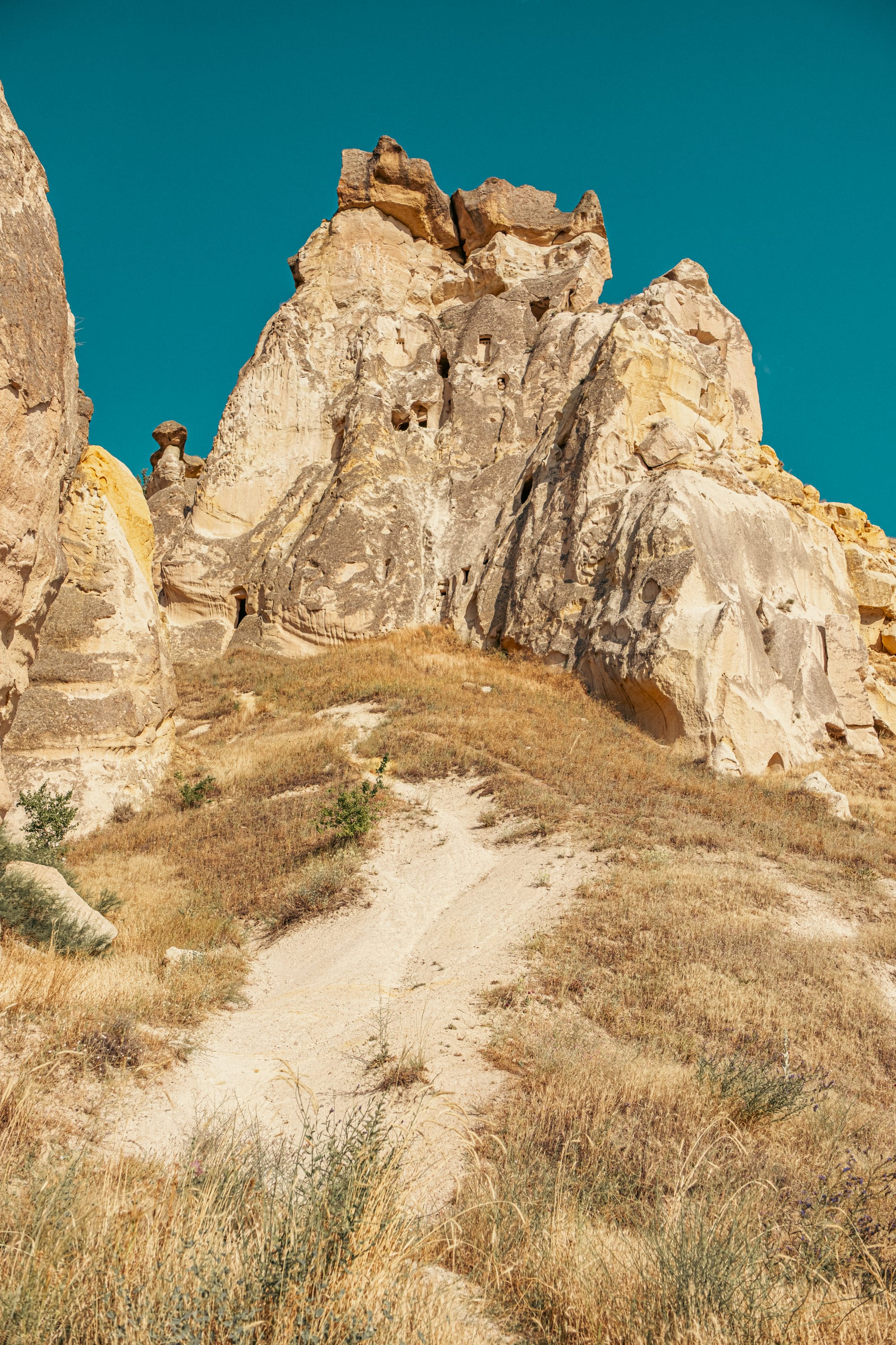 The path to the top of Çavuşin Castle winds through a series of smaller cave dwellings carved into the rock face.