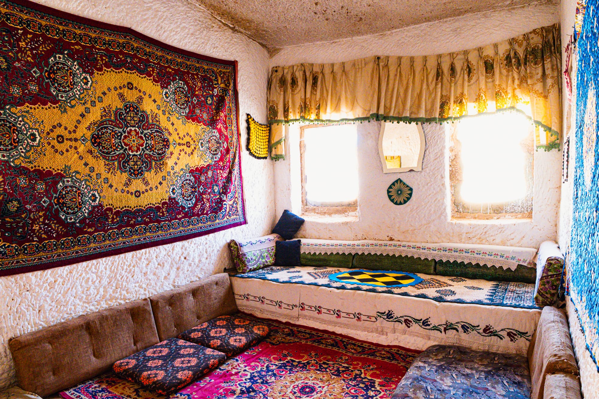 Rustic outdoor tea setup and a cozy, colorful cave interior in Çavuşin