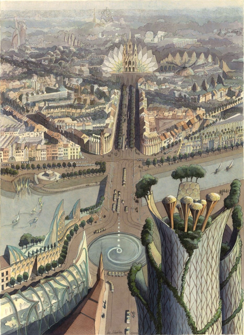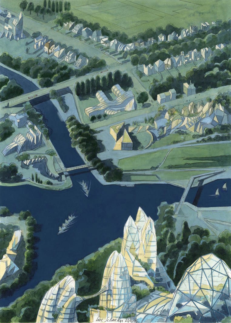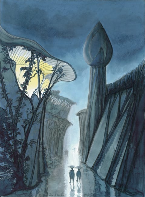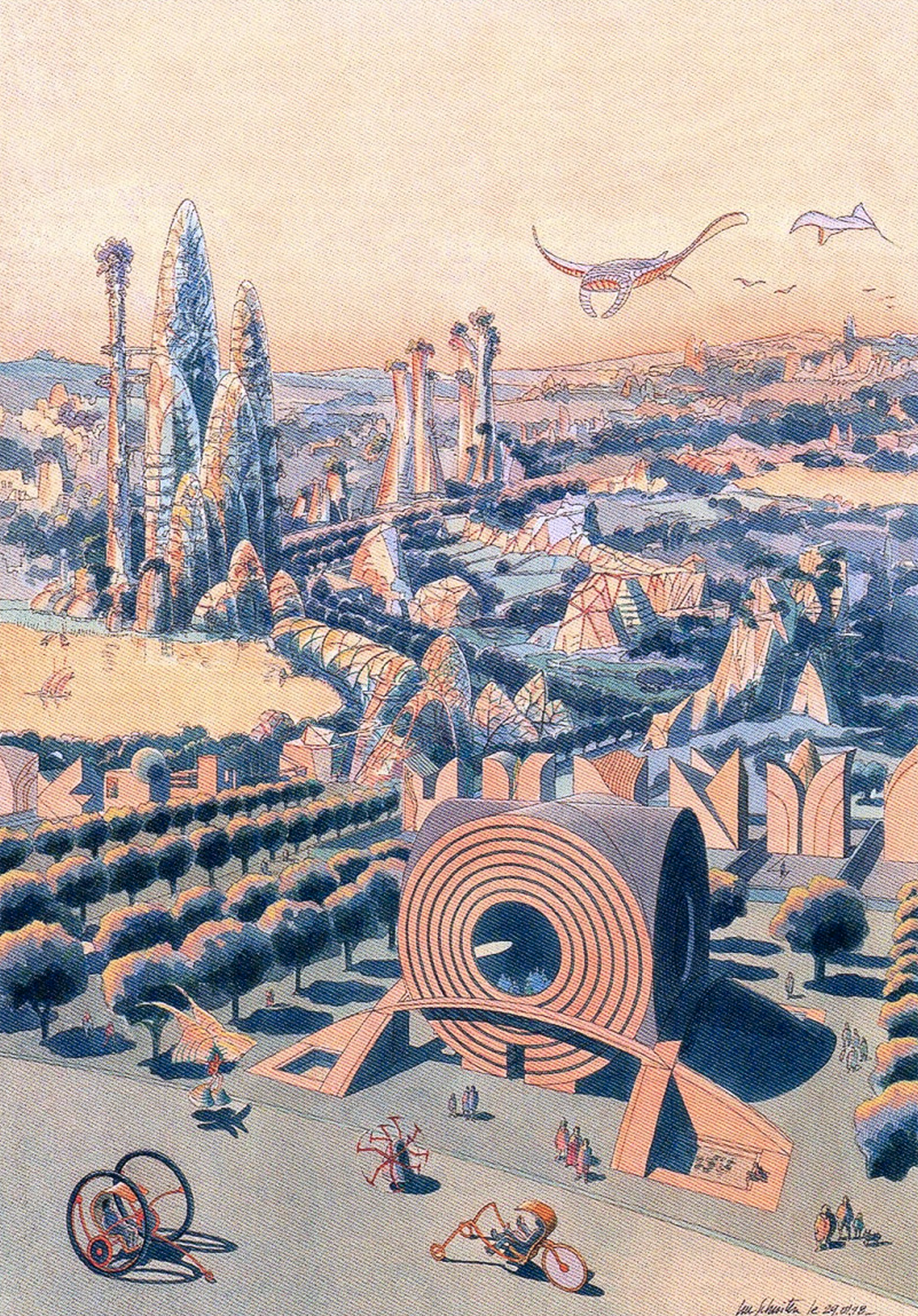 Parallels have been drawn between Schuiten’s work and the ethos of solarpunk, suggesting his architecture is an excellent depiction of the ecological futures the aesthetic movement imagines.