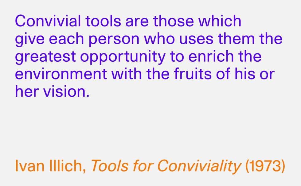 Conviviality is Ivan Illich’s term for a mode of life where tools, systems, and technologies are oriented toward autonomy, reciprocity, and human flourishing rather than extraction or control. In his 1973 book Tools for Conviviality, Illich distinguishes between tools that empower individuals and communities to act with freedom, and tools that become industrial megastructures serving bureaucratic or capitalist imperatives.
