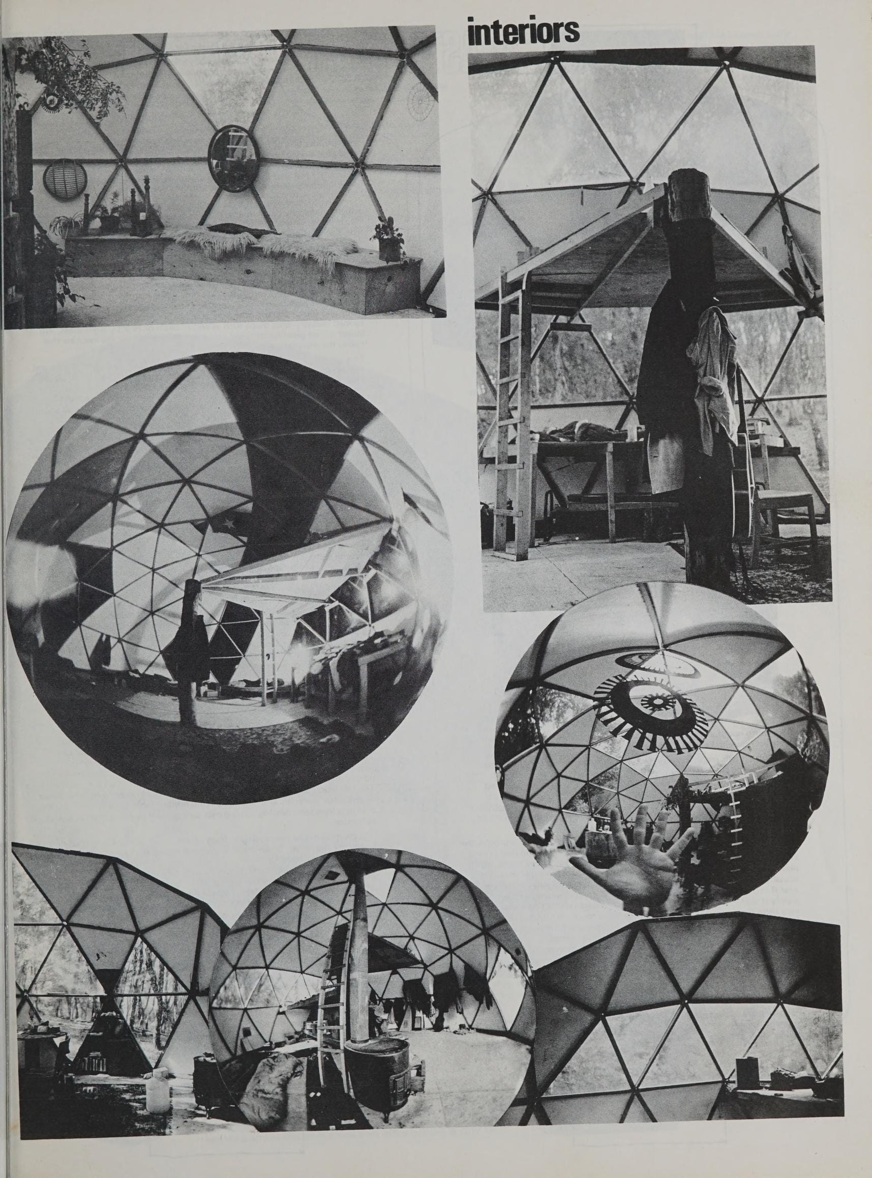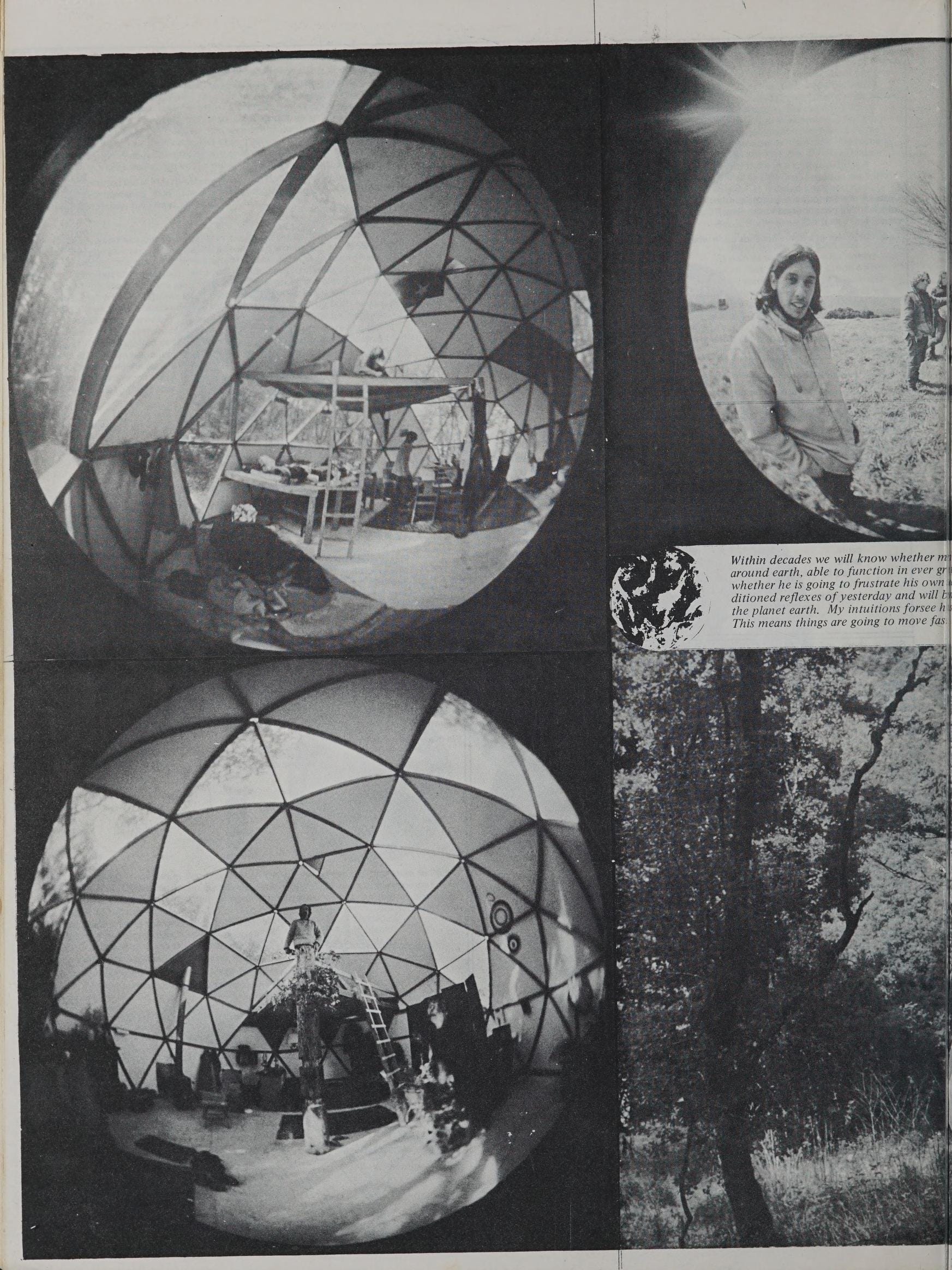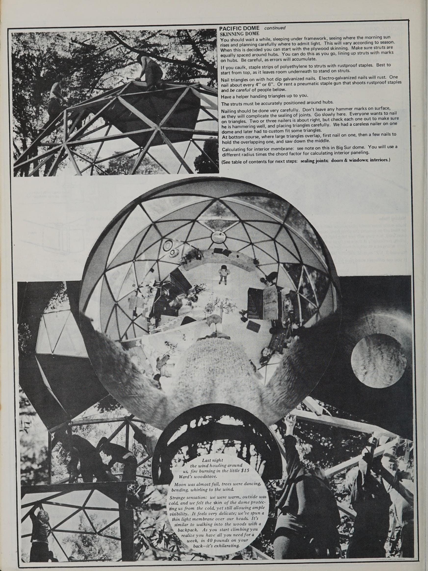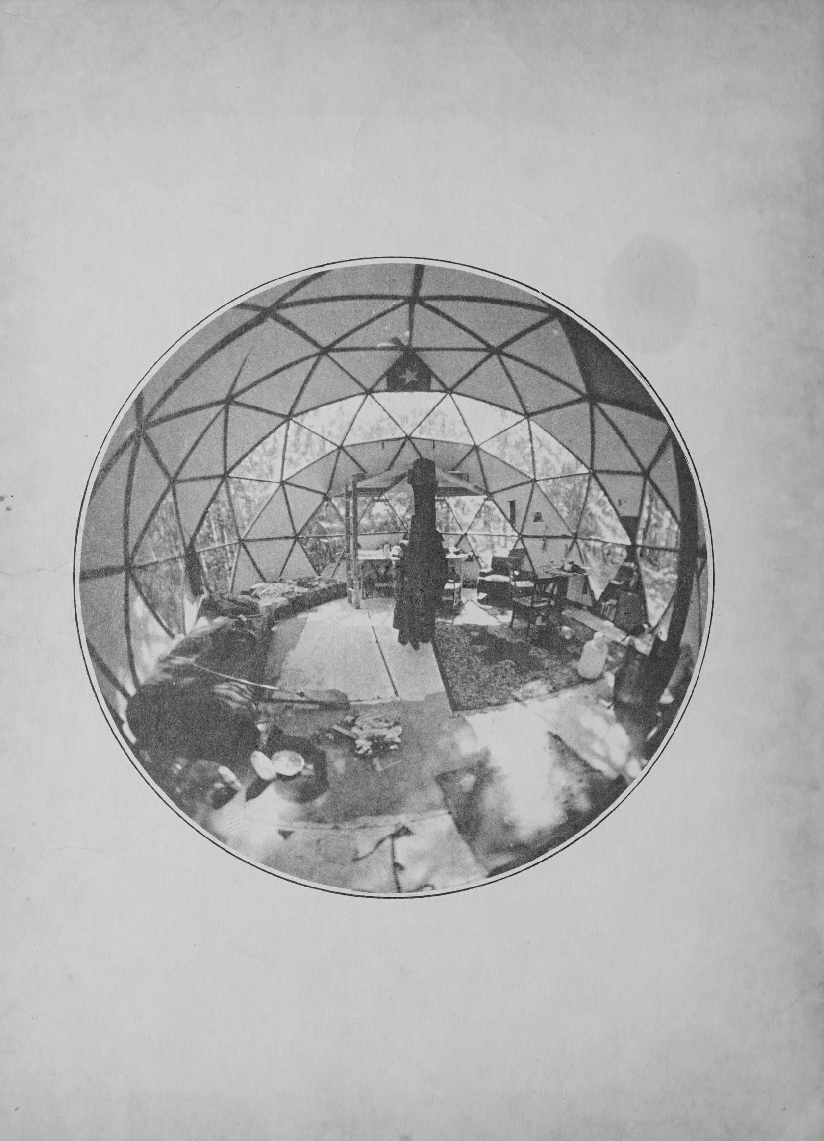 The book combined Buckminster Fuller’s geometry with field reports from people actually constructing domes in fields, deserts, and forests. Its pages were practical and utopian at once: truss patterns and load calculations sat beside photos of glowing communal structures rising out of improvised camps. The dome was framed as both shelter and symbol, a structure that embodied the ideals of collective sufficiency, experimentation, and ecological attention.