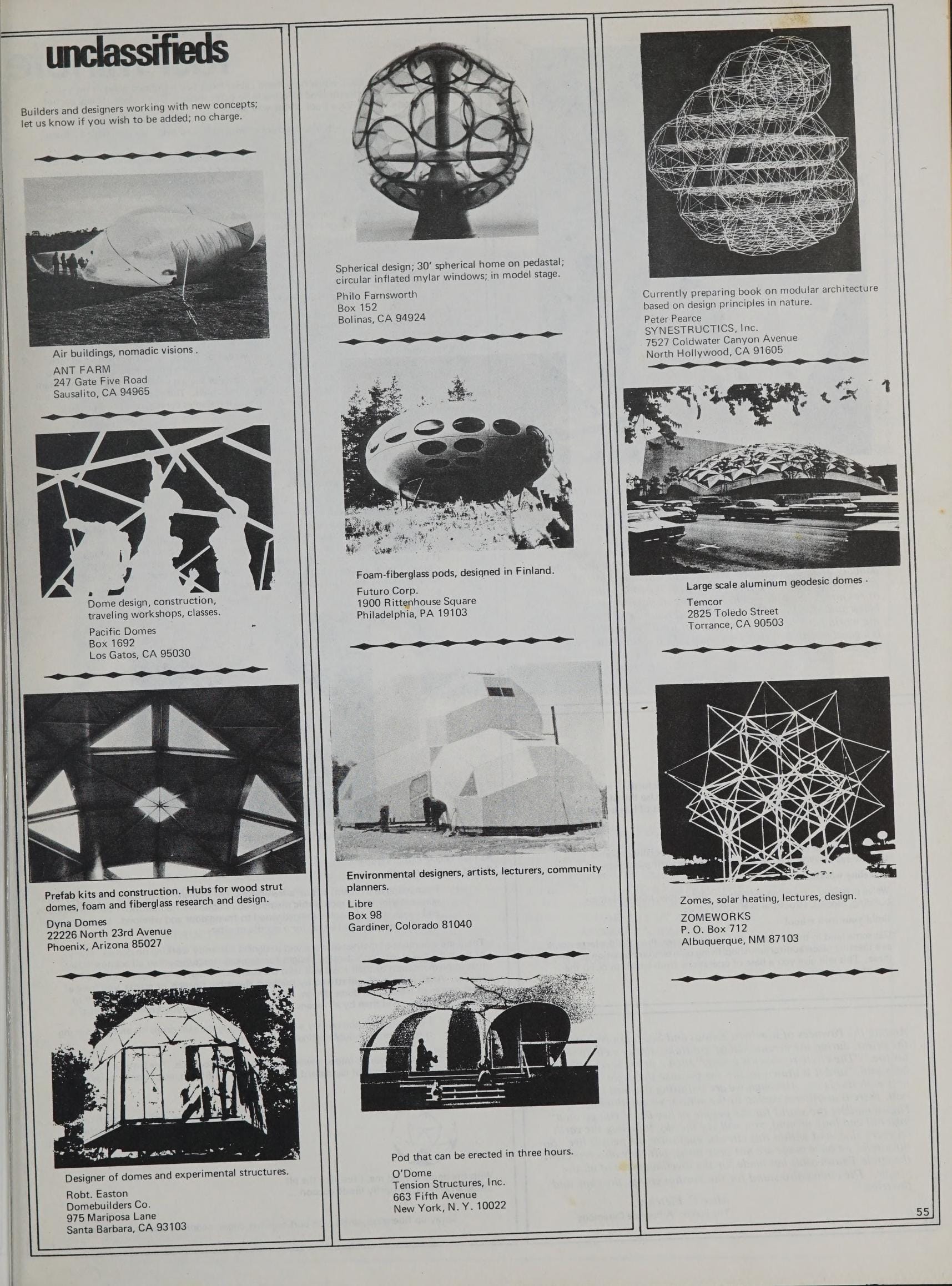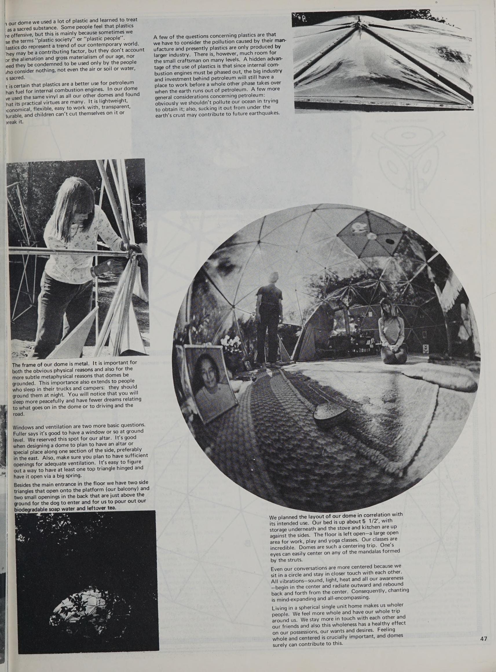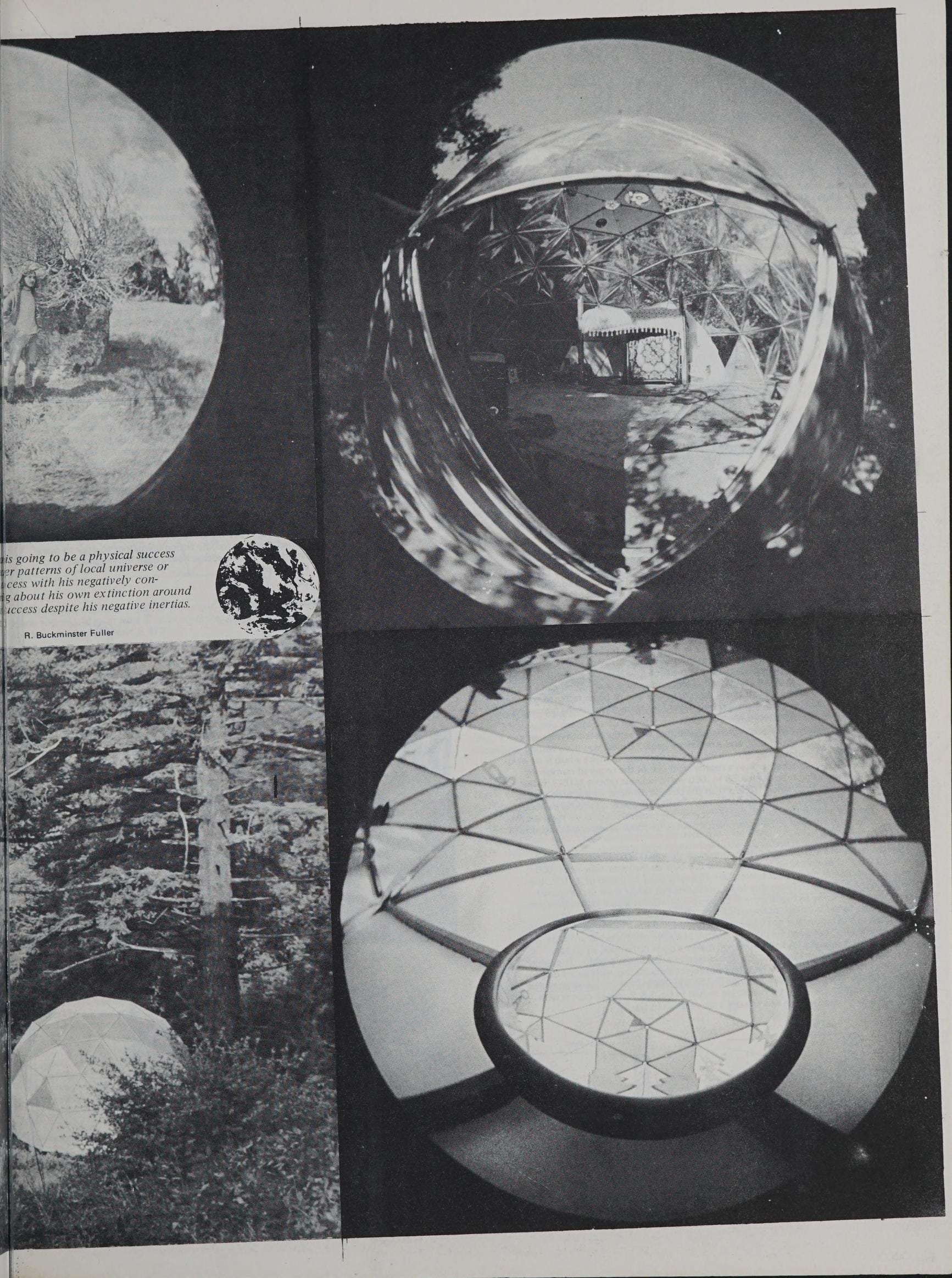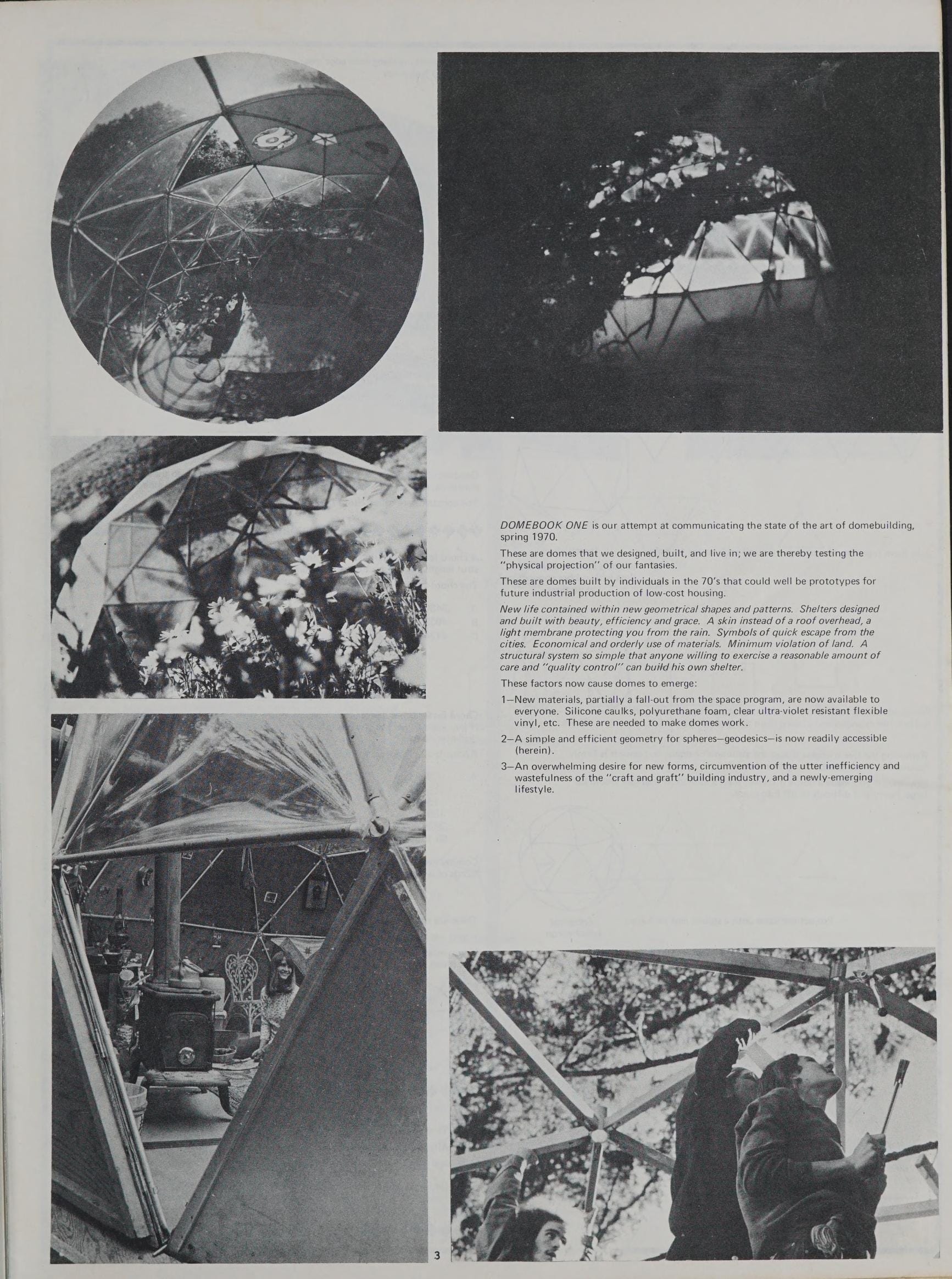 The book combined Buckminster Fuller’s geometry with field reports from people actually constructing domes in fields, deserts, and forests. Its pages were practical and utopian at once: truss patterns and load calculations sat beside photos of glowing communal structures rising out of improvised camps. The dome was framed as both shelter and symbol, a structure that embodied the ideals of collective sufficiency, experimentation, and ecological attention.