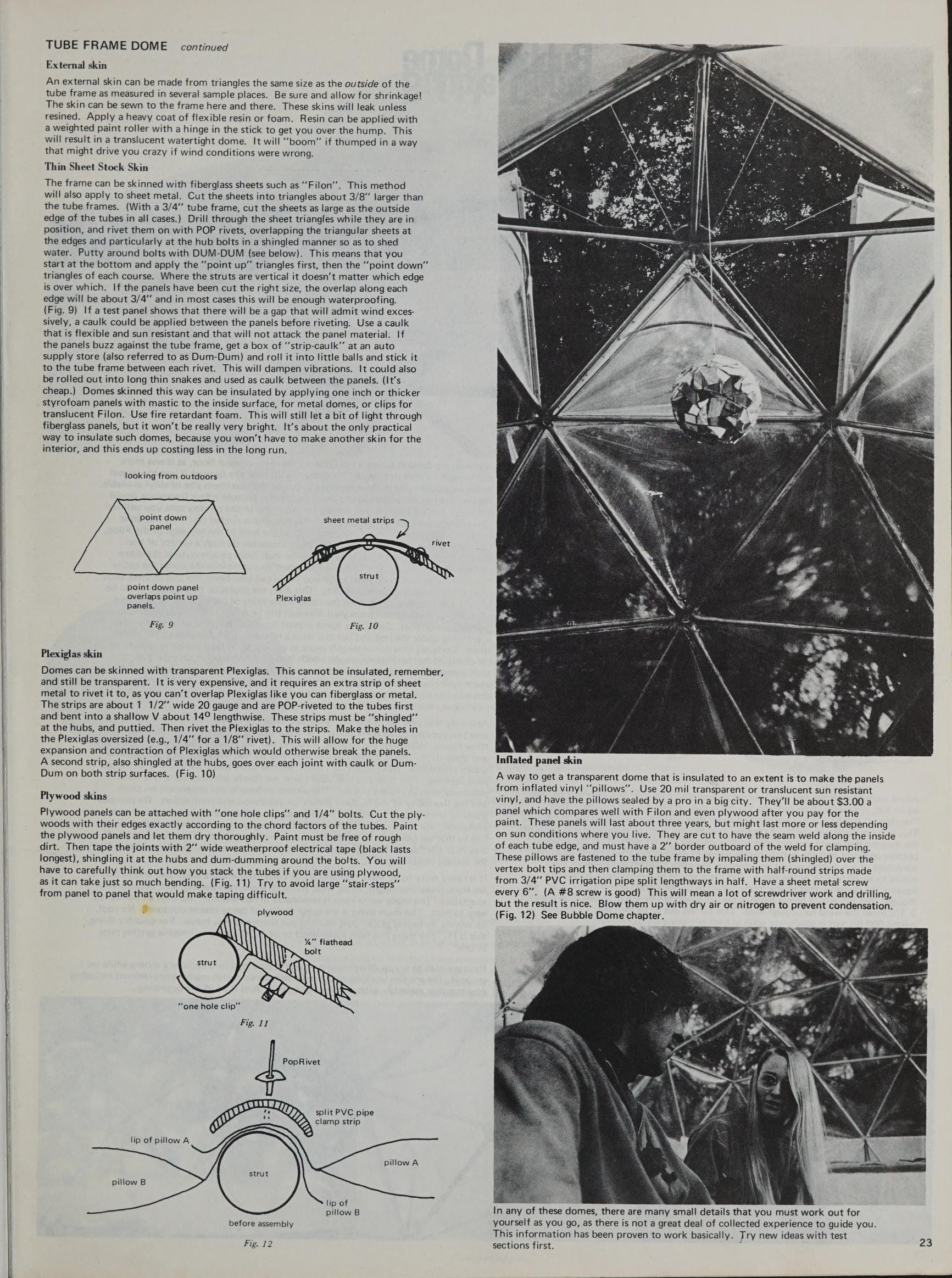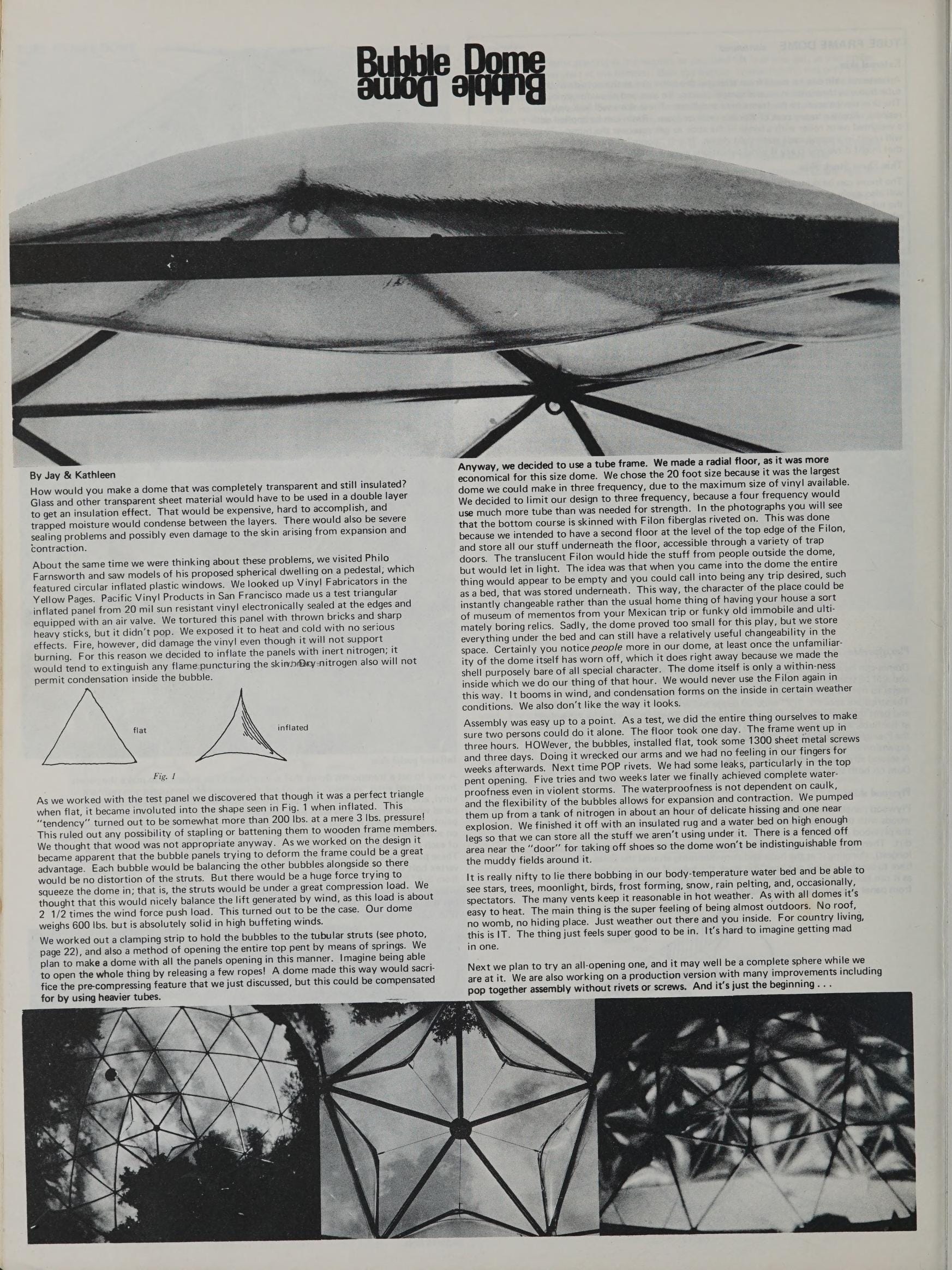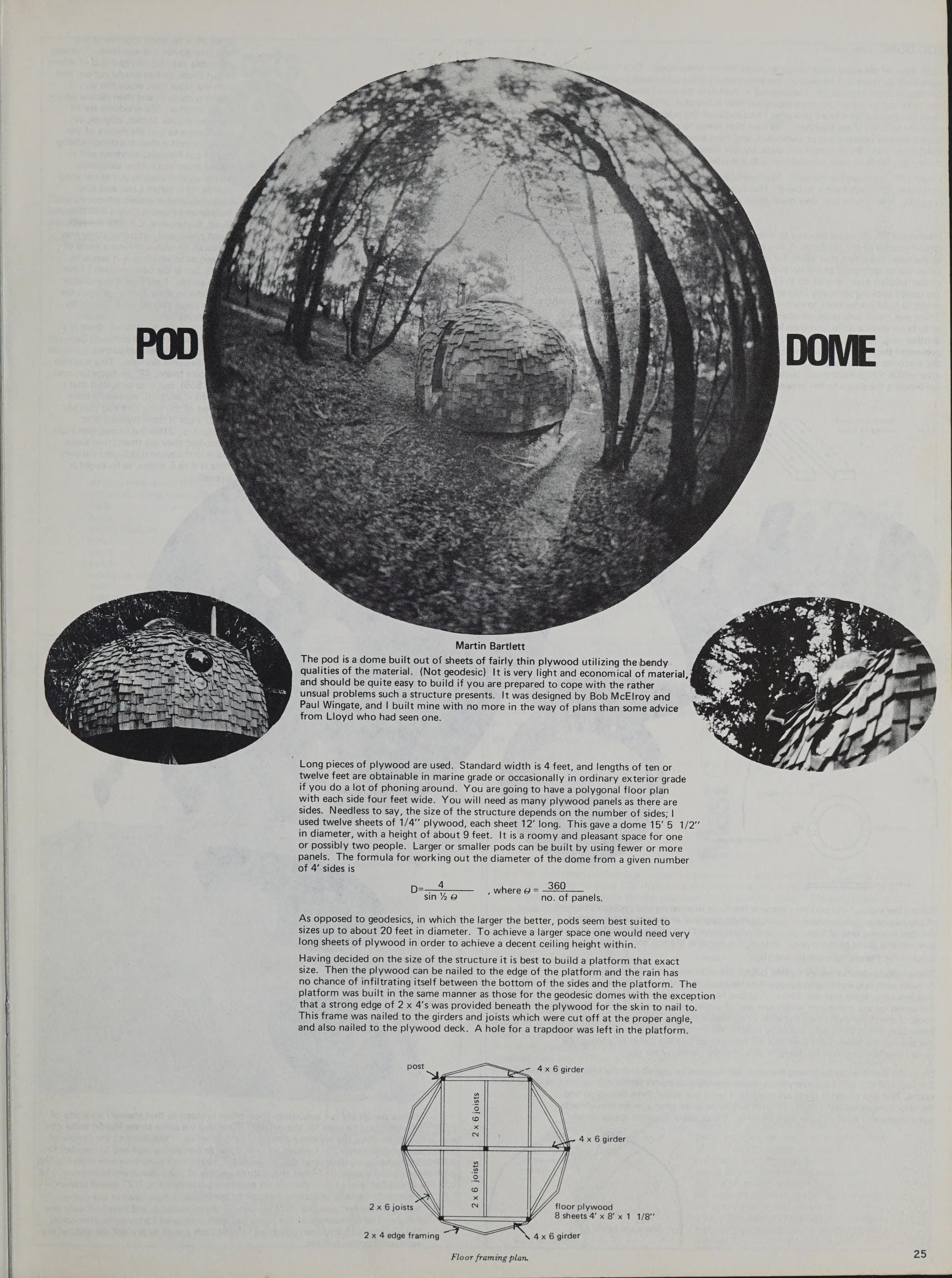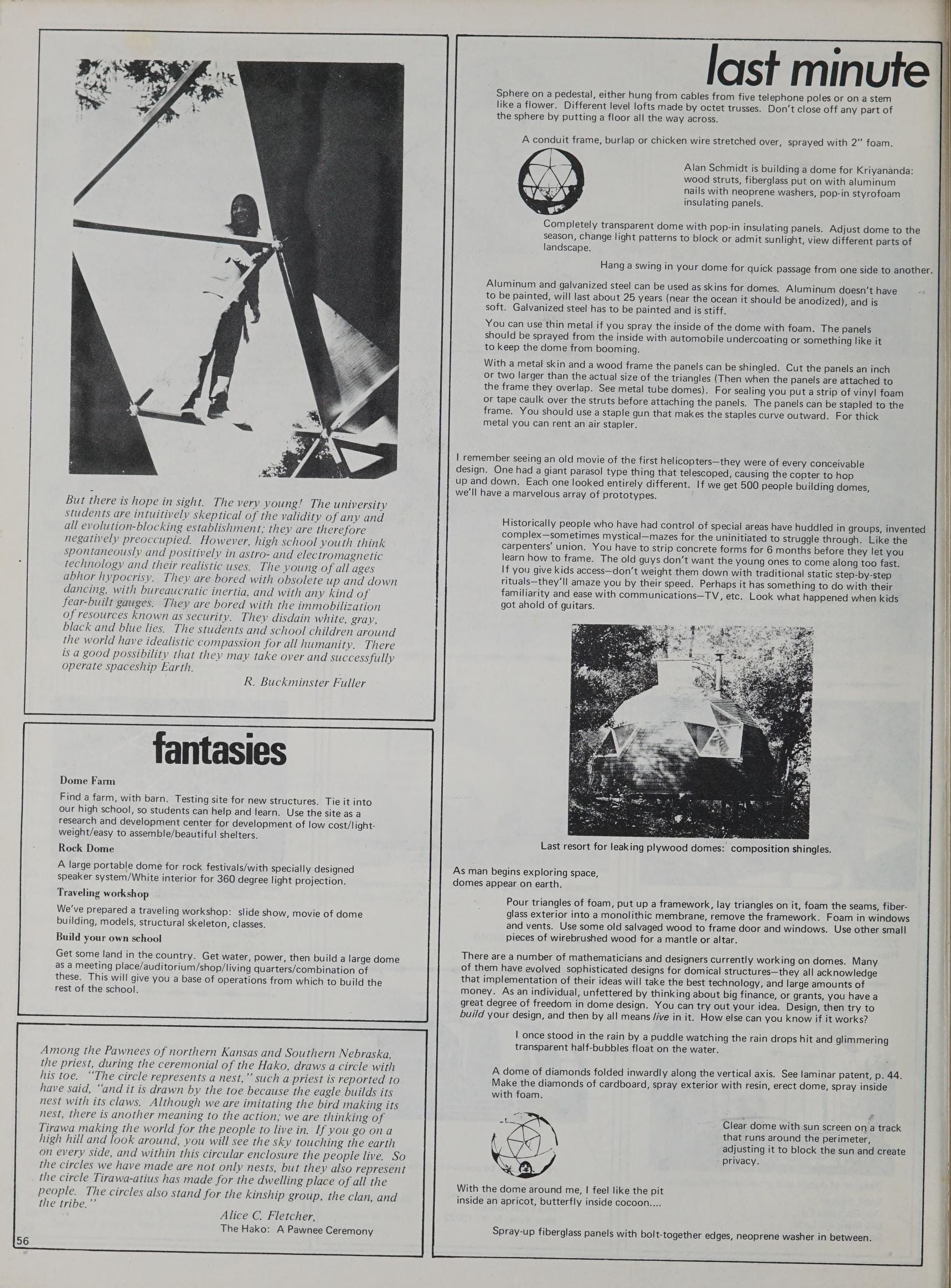 The book combined Buckminster Fuller’s geometry with field reports from people actually constructing domes in fields, deserts, and forests. Its pages were practical and utopian at once: truss patterns and load calculations sat beside photos of glowing communal structures rising out of improvised camps. The dome was framed as both shelter and symbol, a structure that embodied the ideals of collective sufficiency, experimentation, and ecological attention.