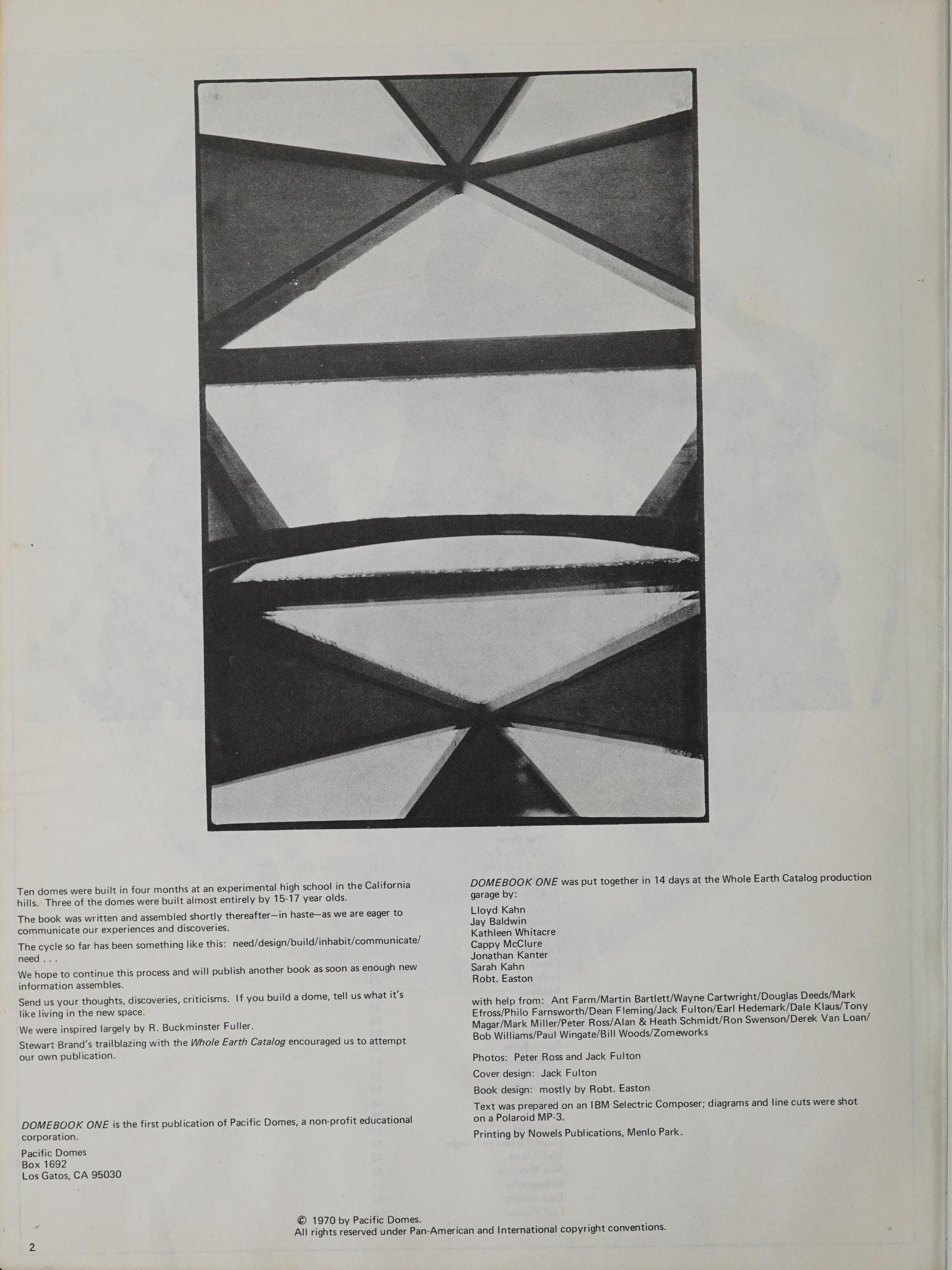 Domebook One (1970) was a handbook edited and published by Lloyd Kahn that gathered instructions, diagrams, and photographs on how to build geodesic domes. Emerging directly from the countercultural ferment of the late 1960s, it became a blueprint for back-to-the-land communities, communes, and experimental builders who sought lightweight, low-cost, and portable dwellings.