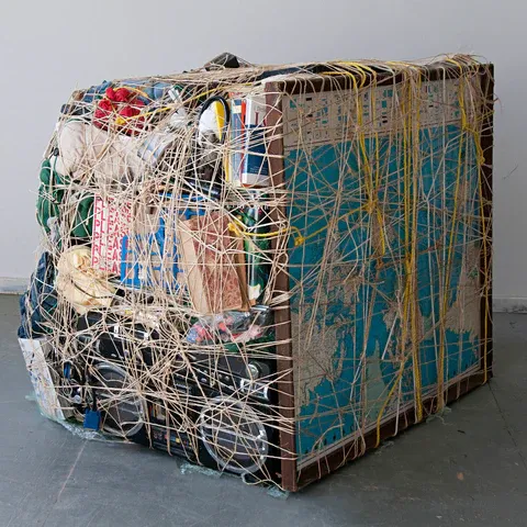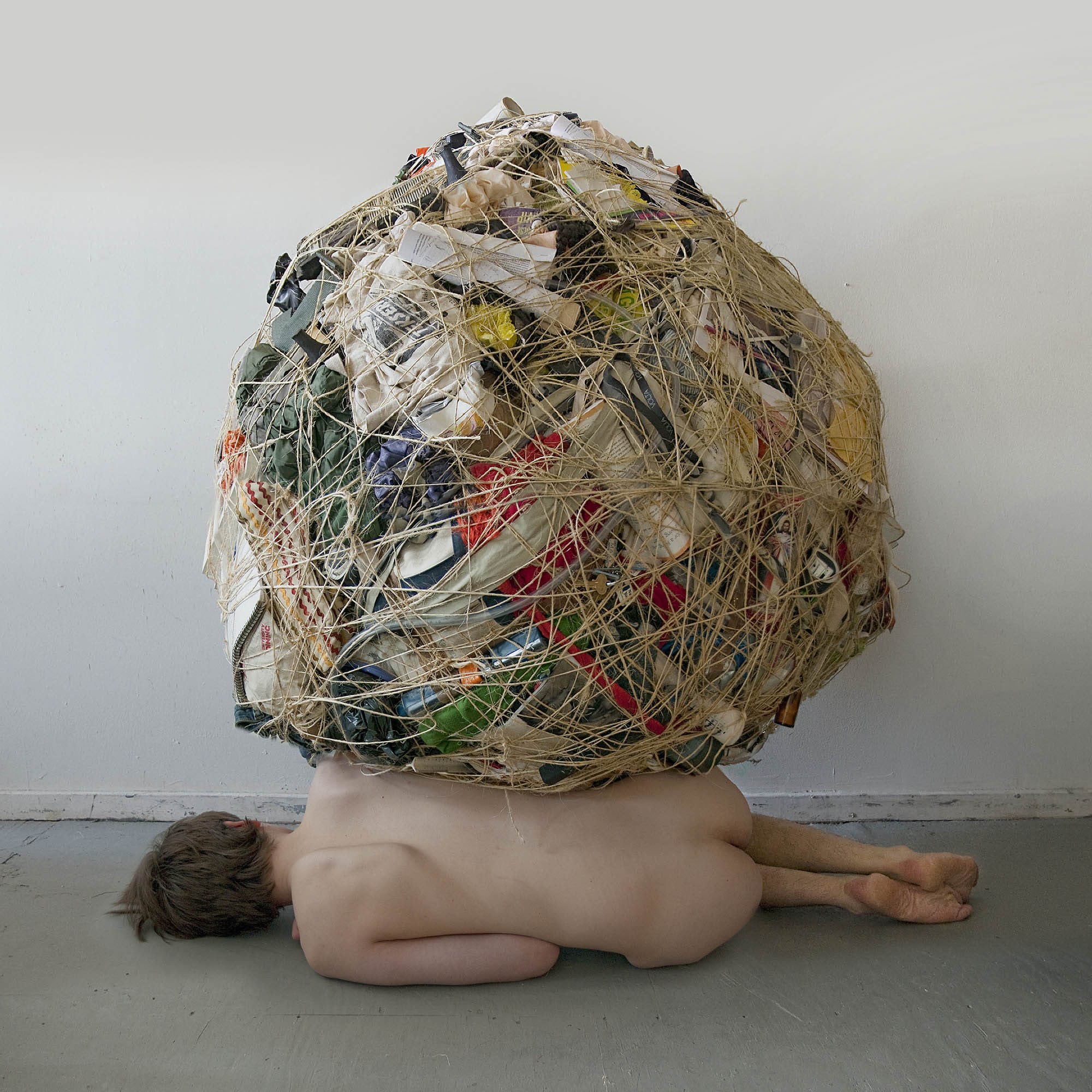 I’ve spent years living in and with ecosystems and shelters I’ve co-built, some of which appear in House and Universe. Those experiences asked me to reconsider my surroundings and to imagine how collections of personal belongings could become monuments to consumption. As a resident of New York City, I contribute to a collective monument: the landfill. In absurd performances, I pulled bundled sculptures of my own possessions through the city to emphasize the literal and symbolic weight of these objects. Their wrappings are inextricably intertwined, like the cycles of production themselves. Through chains of formal and informal exchange, an object is mined, made, distributed, purchased, exchanged, discarded, and then becomes something else.