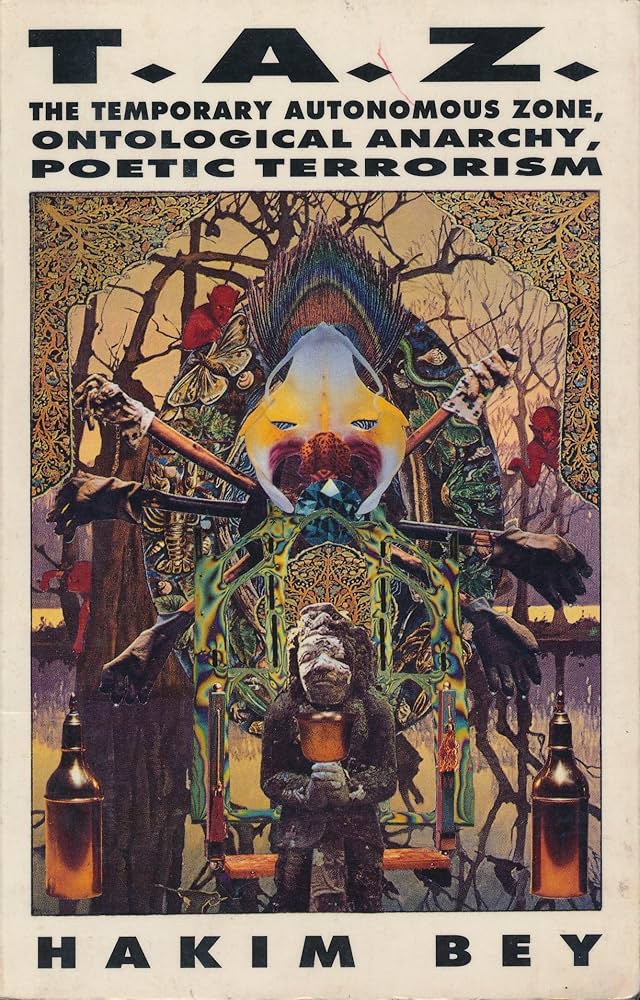 The Temporary Autonomous Zone is a 1991 manifesto by writer and poet Hakim Bey (pseudonym of Peter Lamborn Wilson). The book proposes that freedom can be practiced in temporary, ephemeral spaces that slip through the grasp of state power and market control. Rather than waiting for a revolution that may never arrive, Bey suggests that autonomy already exists in pockets and moments—pirate utopias, clandestine gatherings, underground raves, festivals, or any collective act that creates a space of liberation before it is recuperated.