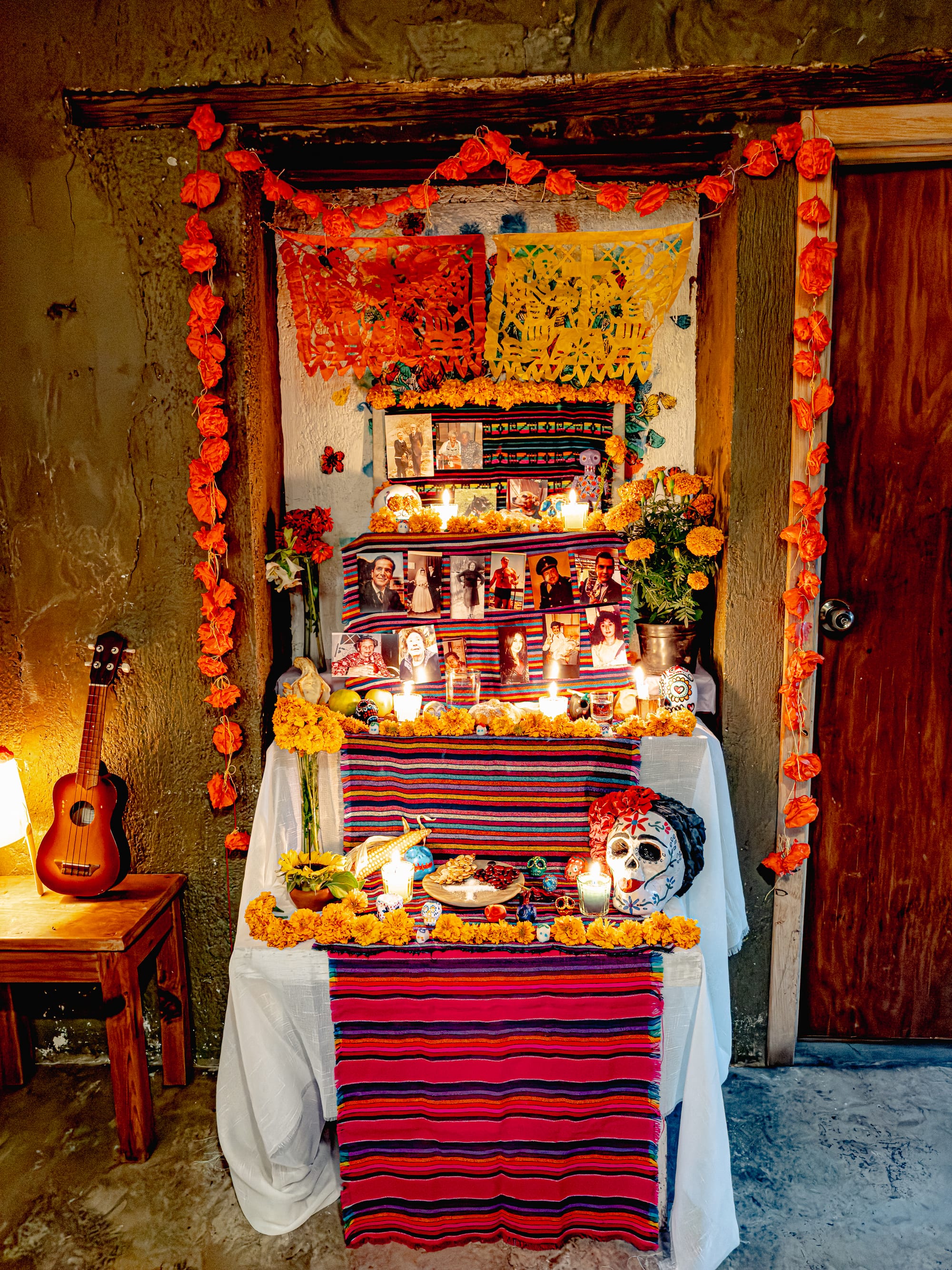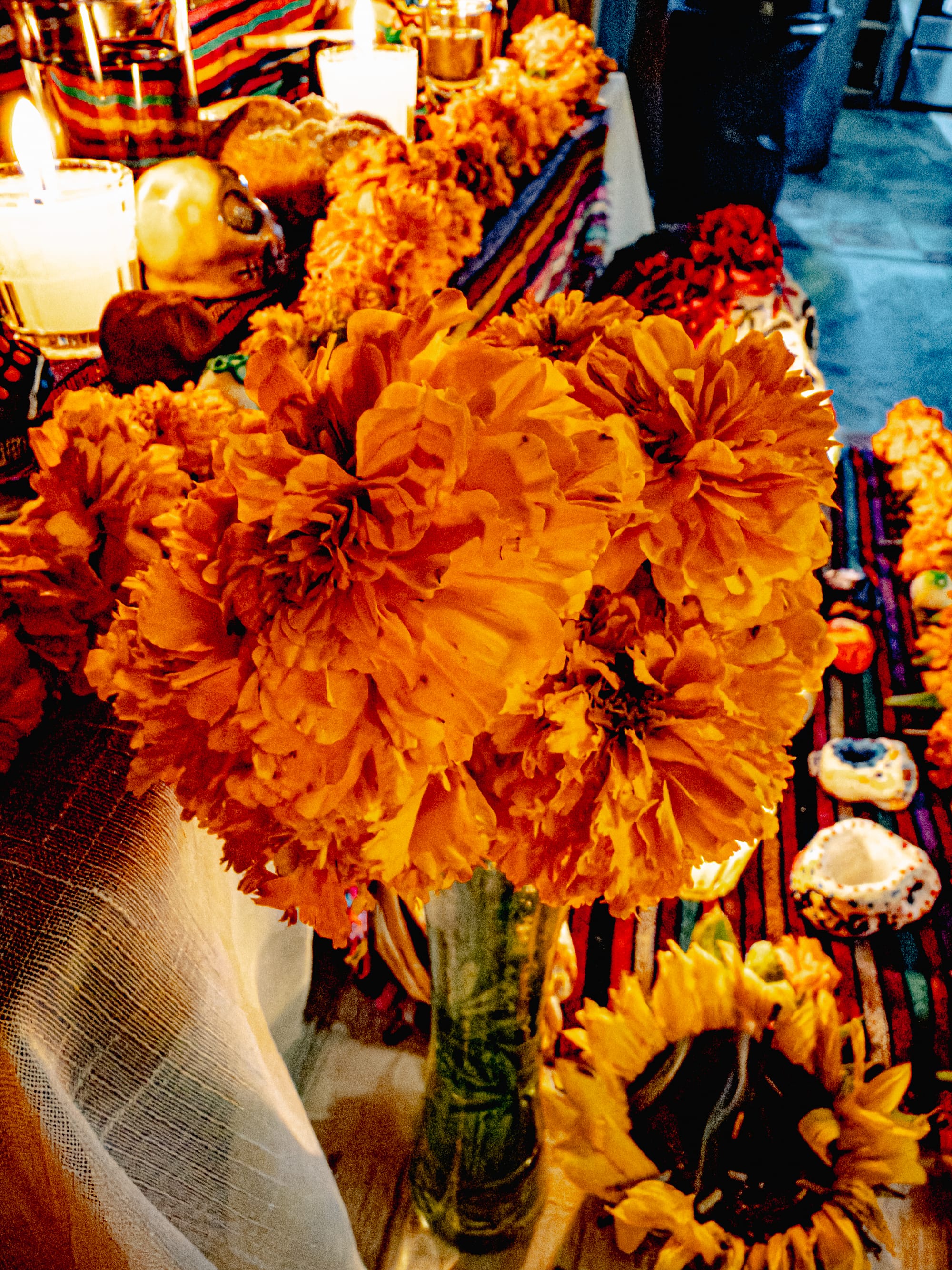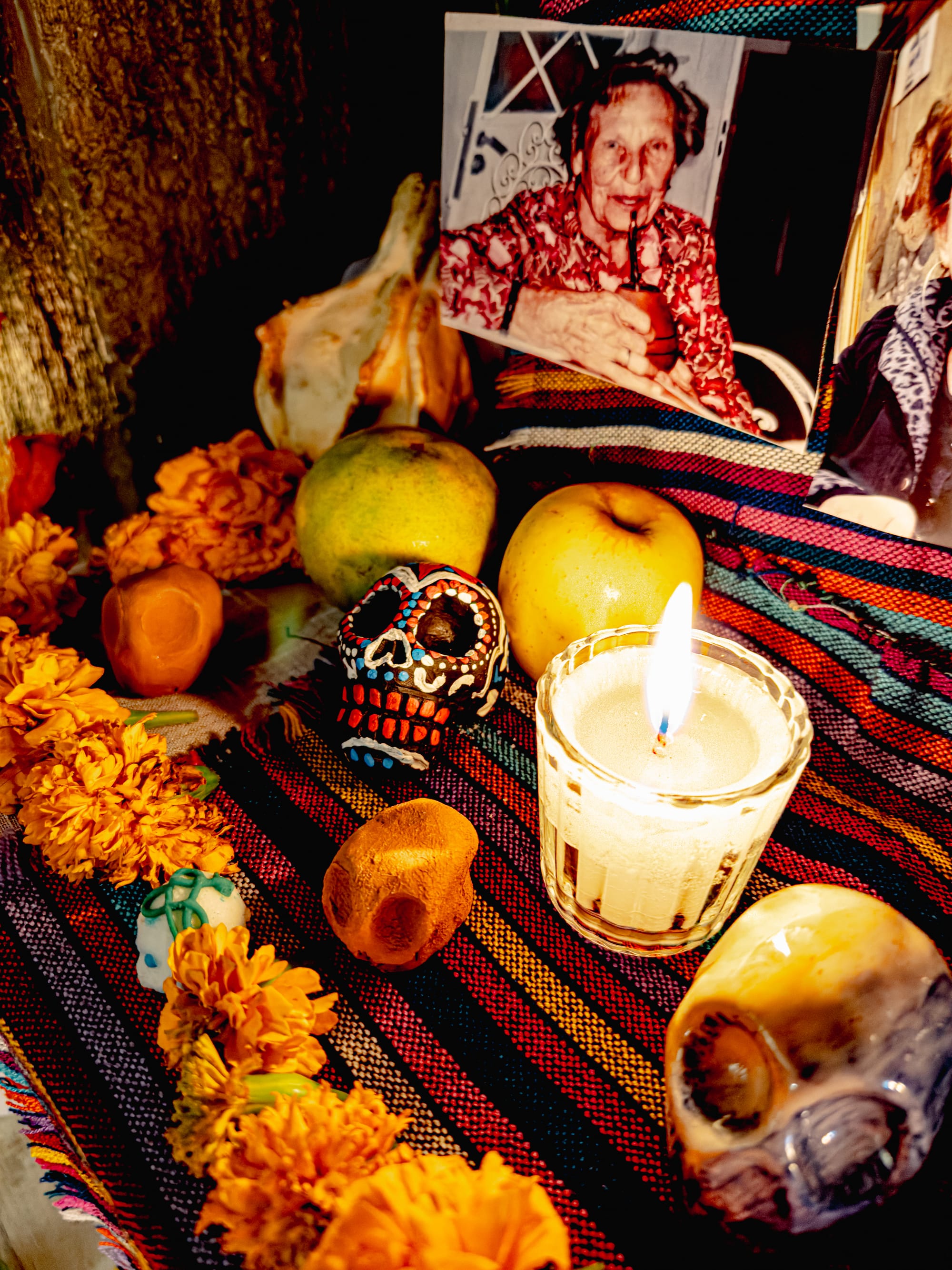 Skulls, flowers, and candlelight on the ofrenda