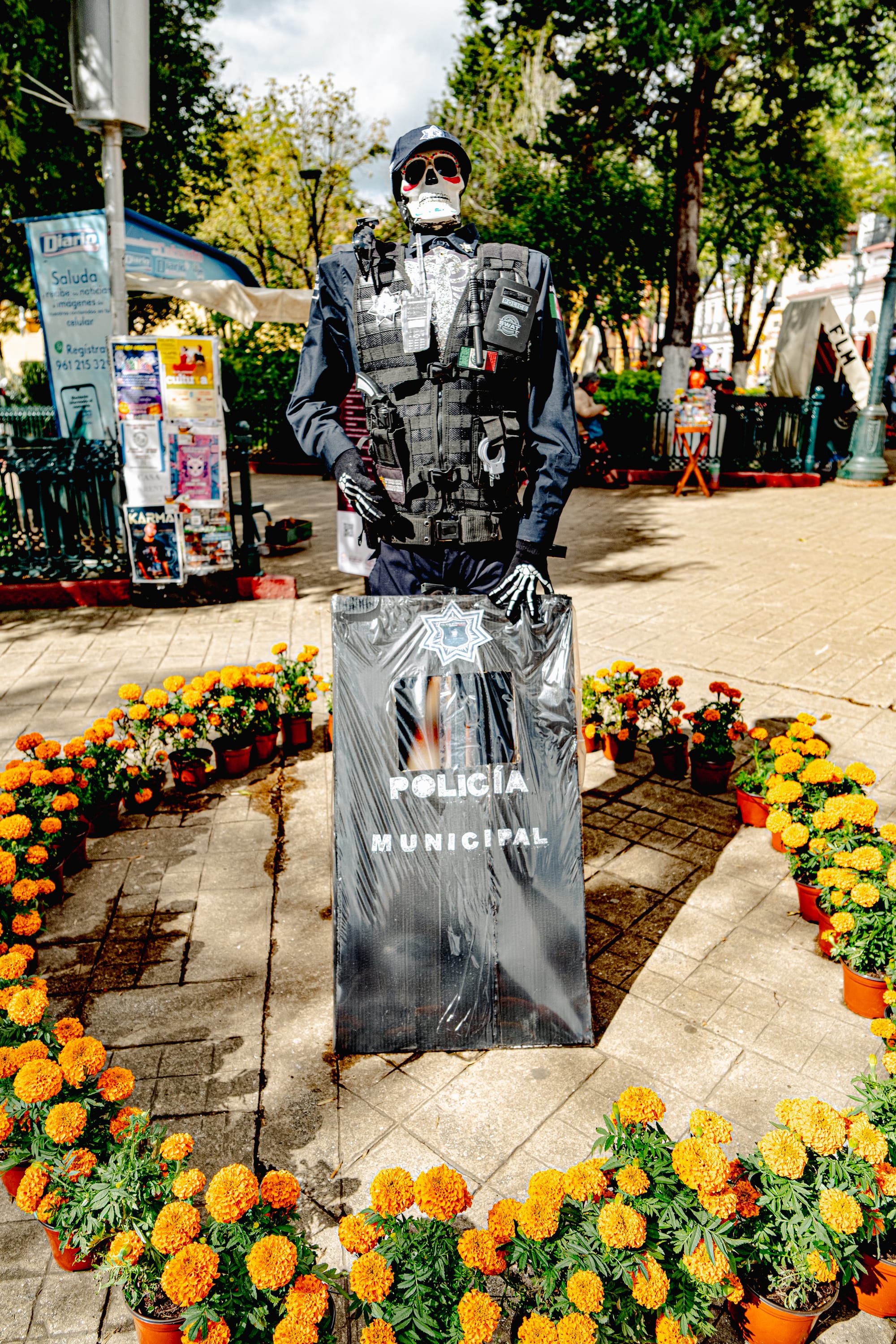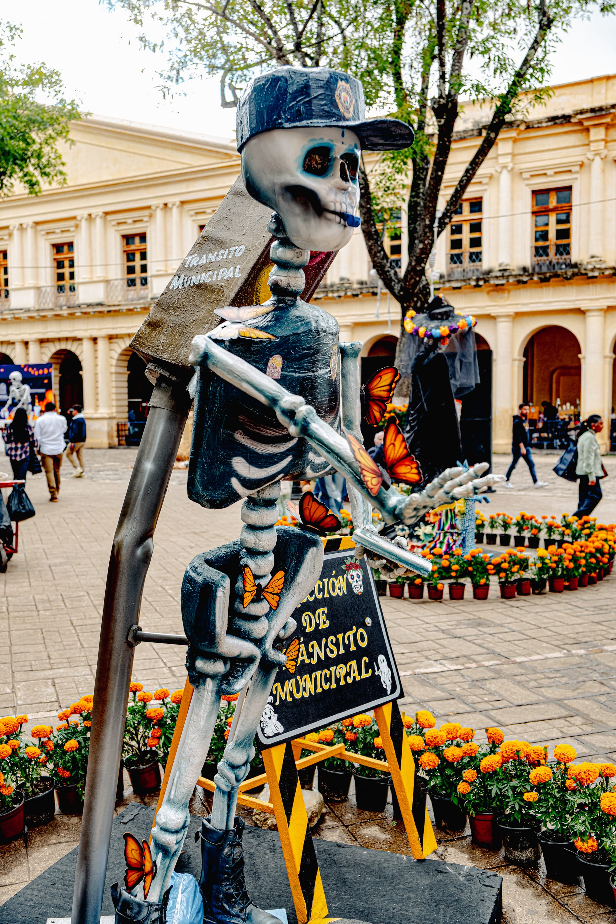 The main plaza filled with ornate skeleton figures, each styled differently. Rather than feeling theatrical, they felt conversational, as if the boundary between worlds had thinned just enough to allow humor alongside reverence.