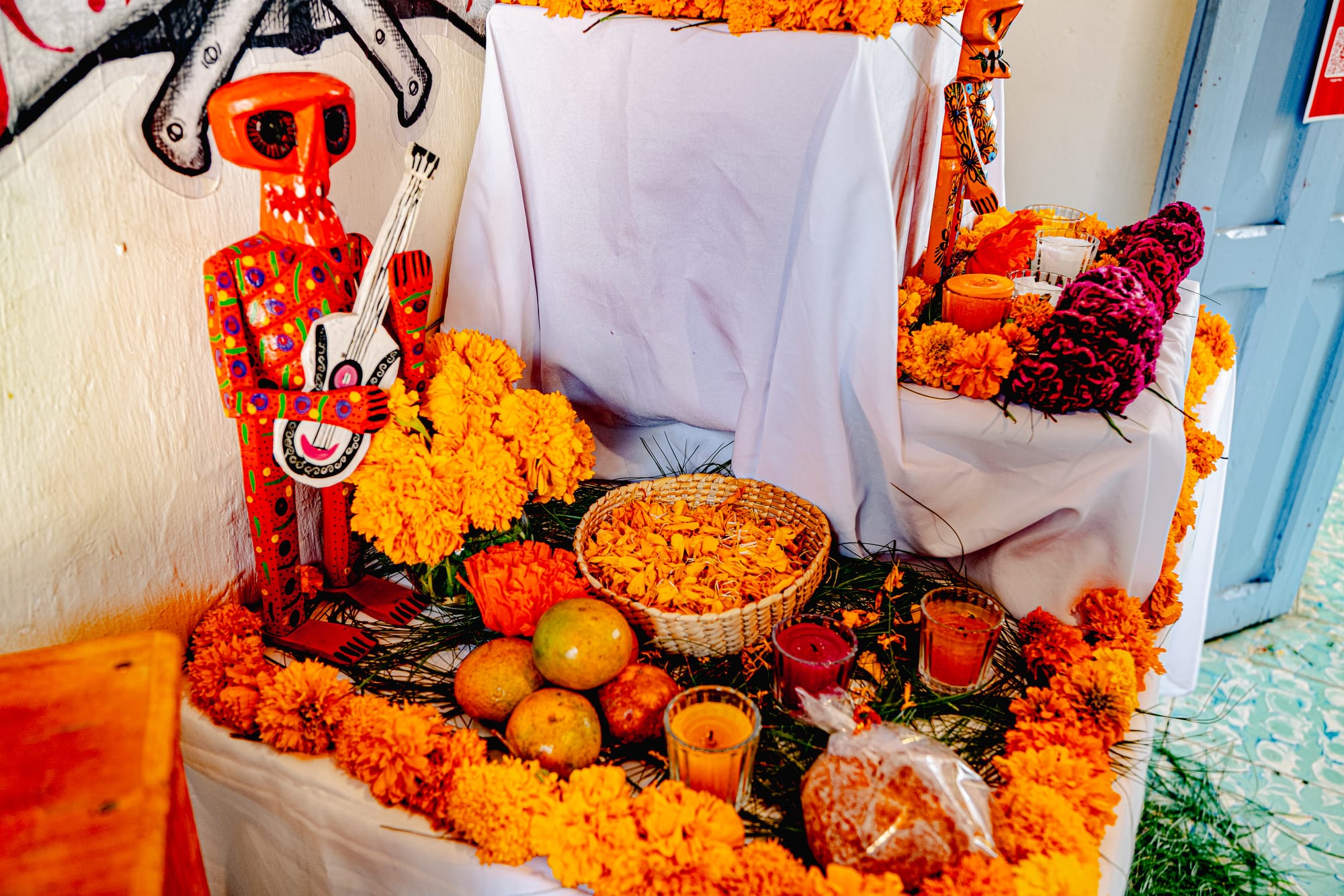 A public ofrenda layered with art, offerings, and marigolds