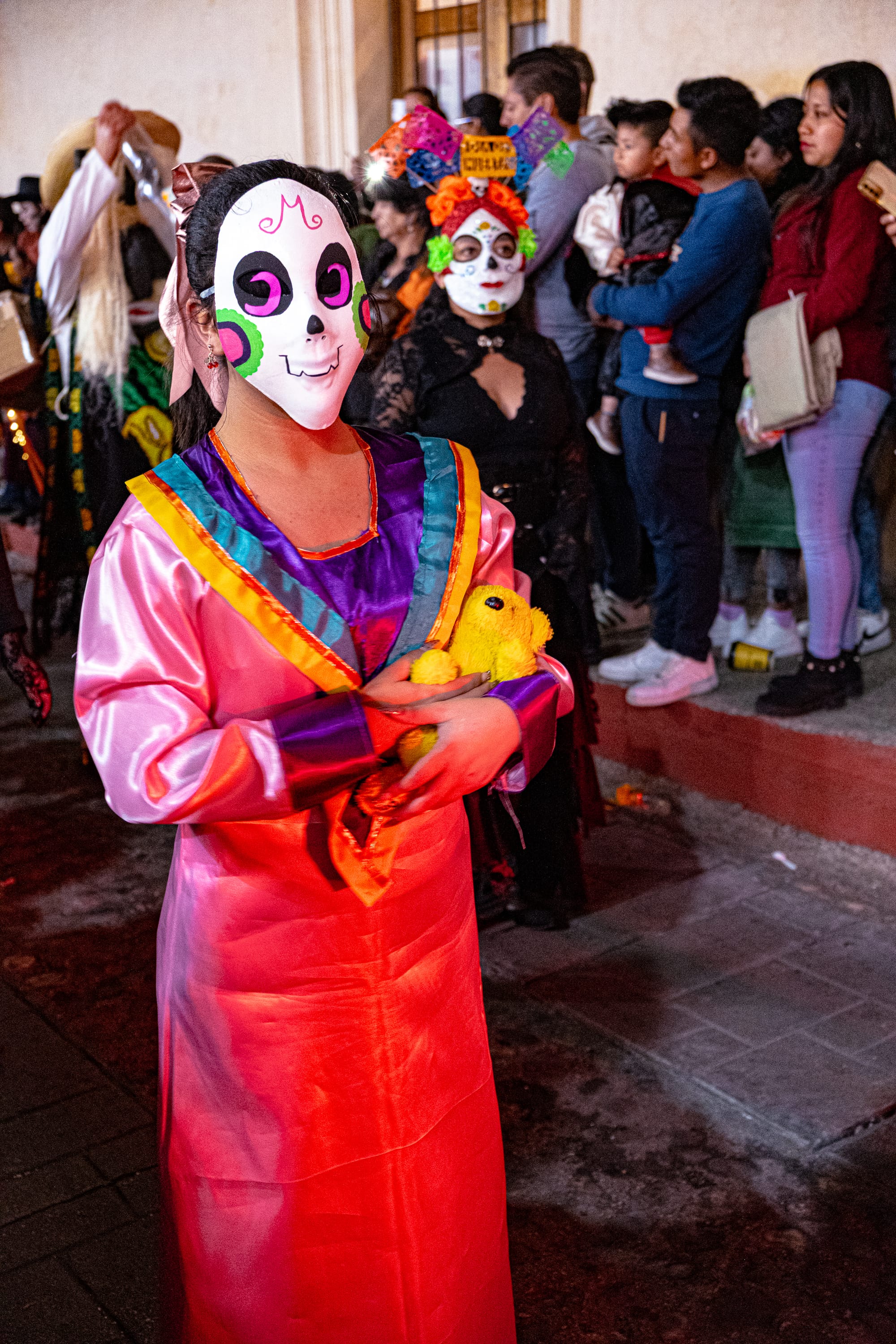 The Day of the Dead parade unfolded through the city as a vibrant, communal expression of remembrance. People gathered along streets and sidewalks. Children, elders, families, and friends. Many dressed up. Many painted their faces—calaveras, Catrinas, and skulls adorned with flowers and symbols.