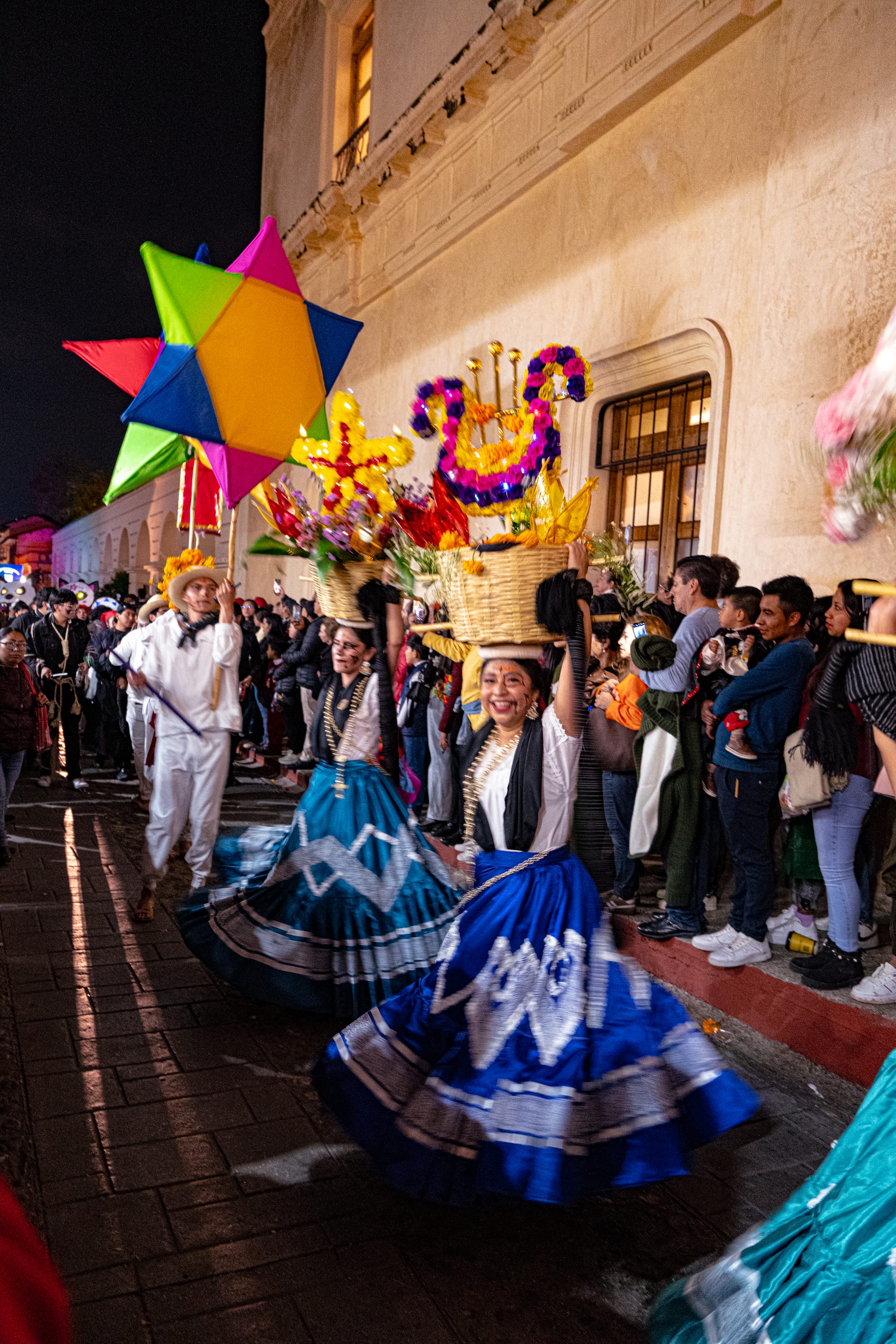Elaborate costumes moving through the Día de Muertos parade