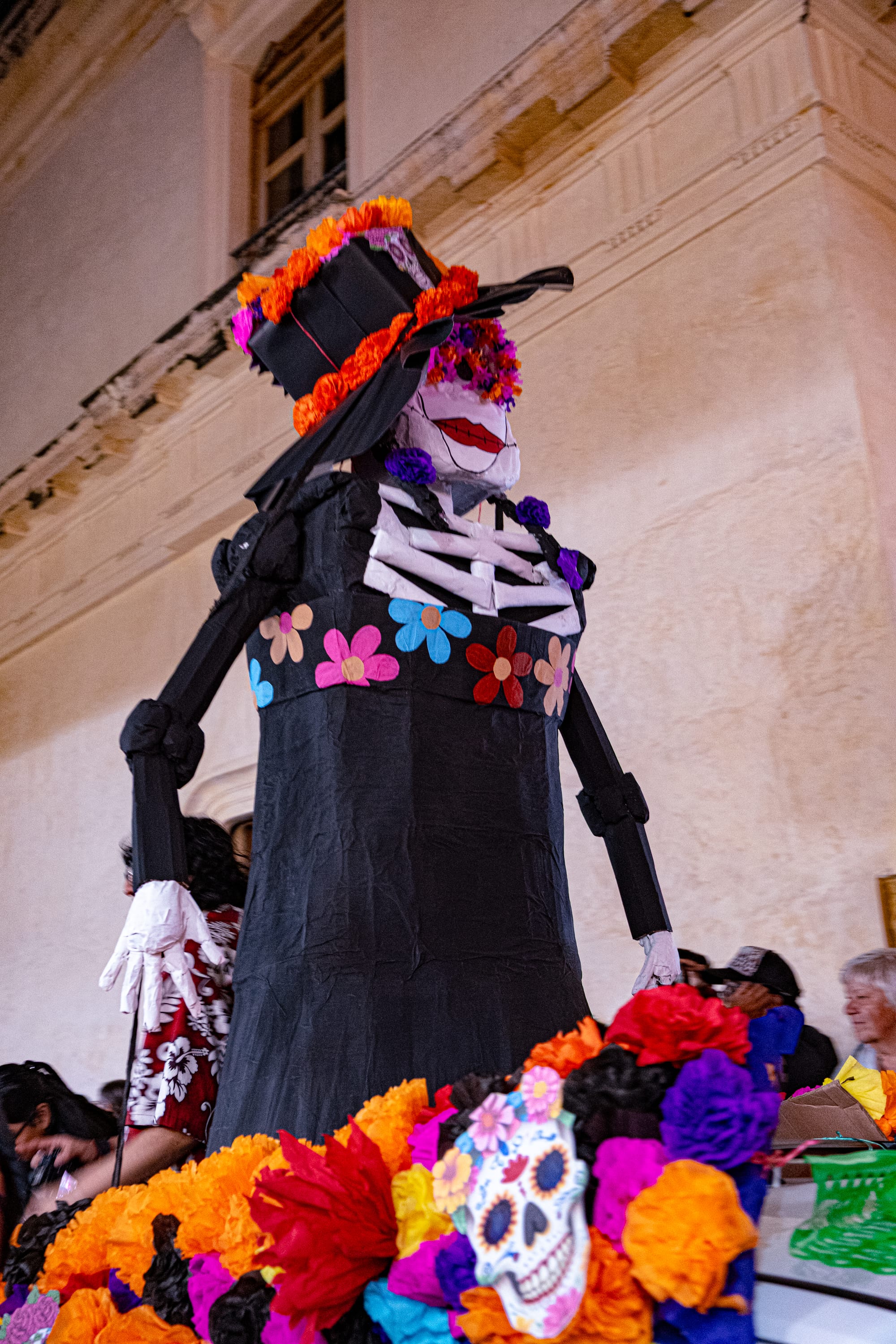 A floral carpet and playful skeletons in the plaza