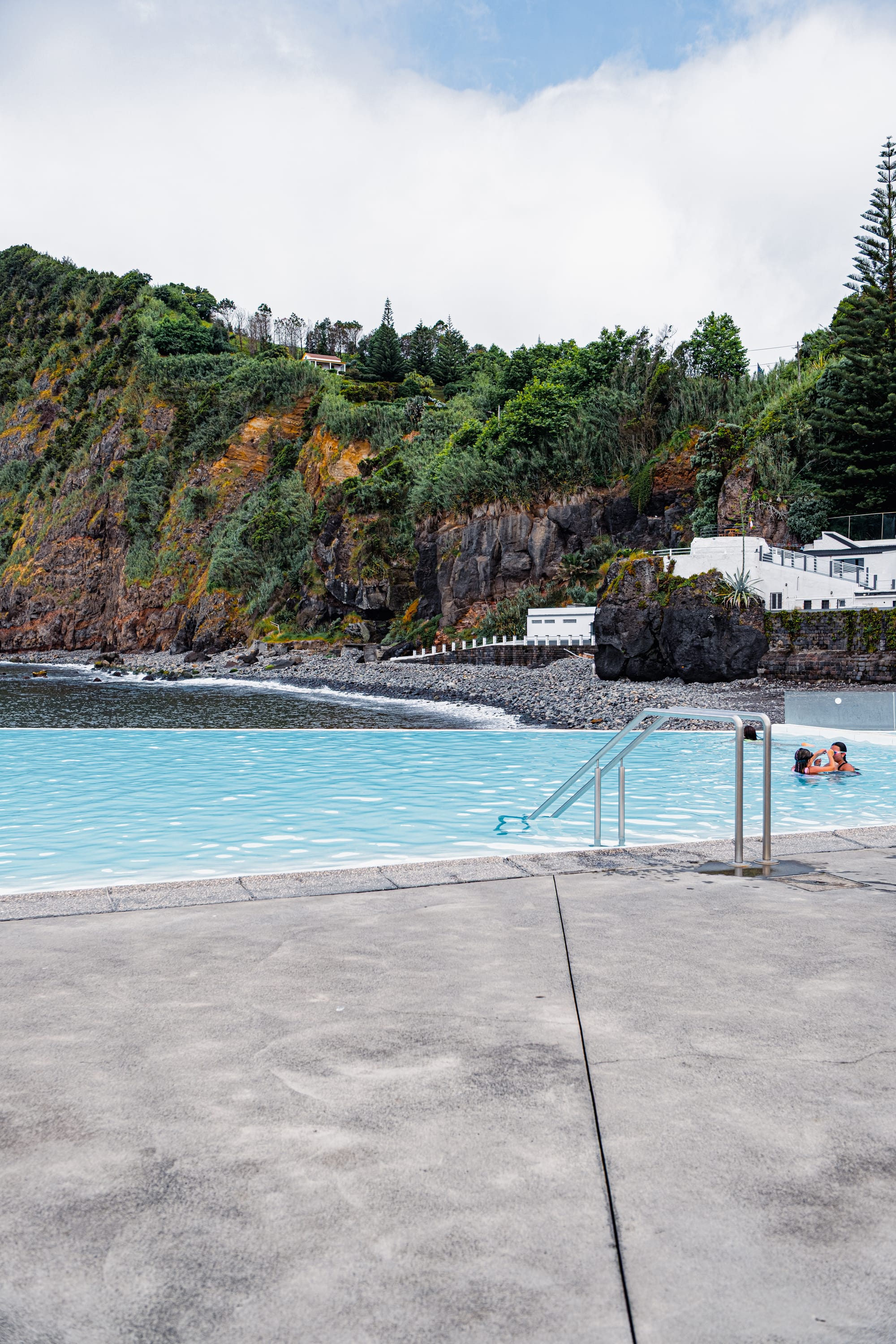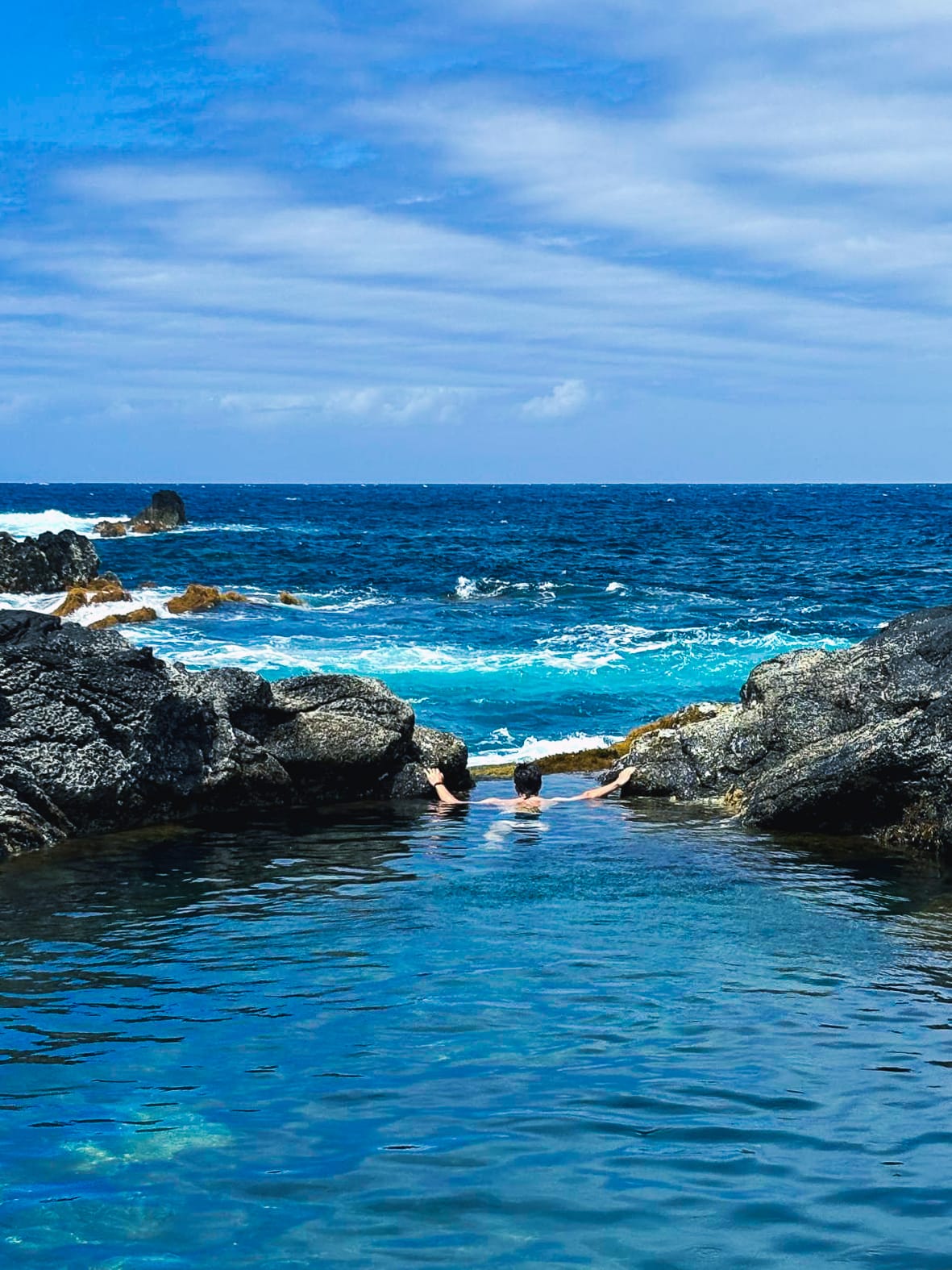 On the island’s northwest coast lies one of its calmest swimming spots: the natural ocean pools of Caneiros. Formed by volcanic rock and shielded from the open sea, these pools create a safe, wave-buffered place to float, wade, or stretch out under the sun. The lava formations give the space a sculptural beauty, and you’ll find locals sunbathing, kids exploring tide pools, and swimmers enjoying a break from the surf.