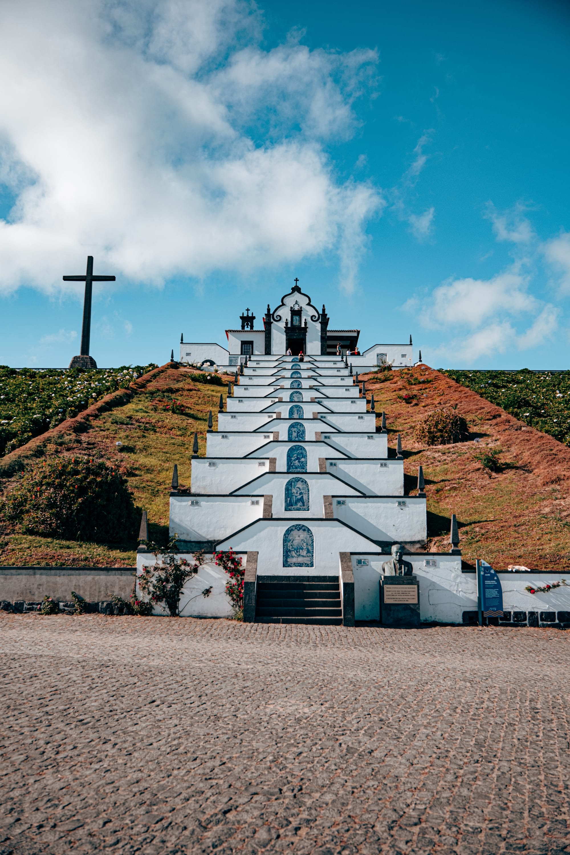Rising above the town of Vila Franca do Campo, the Sanctuary of Nossa Senhora da Paz is one of the most visually striking churches on the island. The ascent begins at the foot of a sweeping staircase, flanked by hand-painted azulejos that depict scenes from the rosary. Each step feels symbolic—like climbing toward stillness.