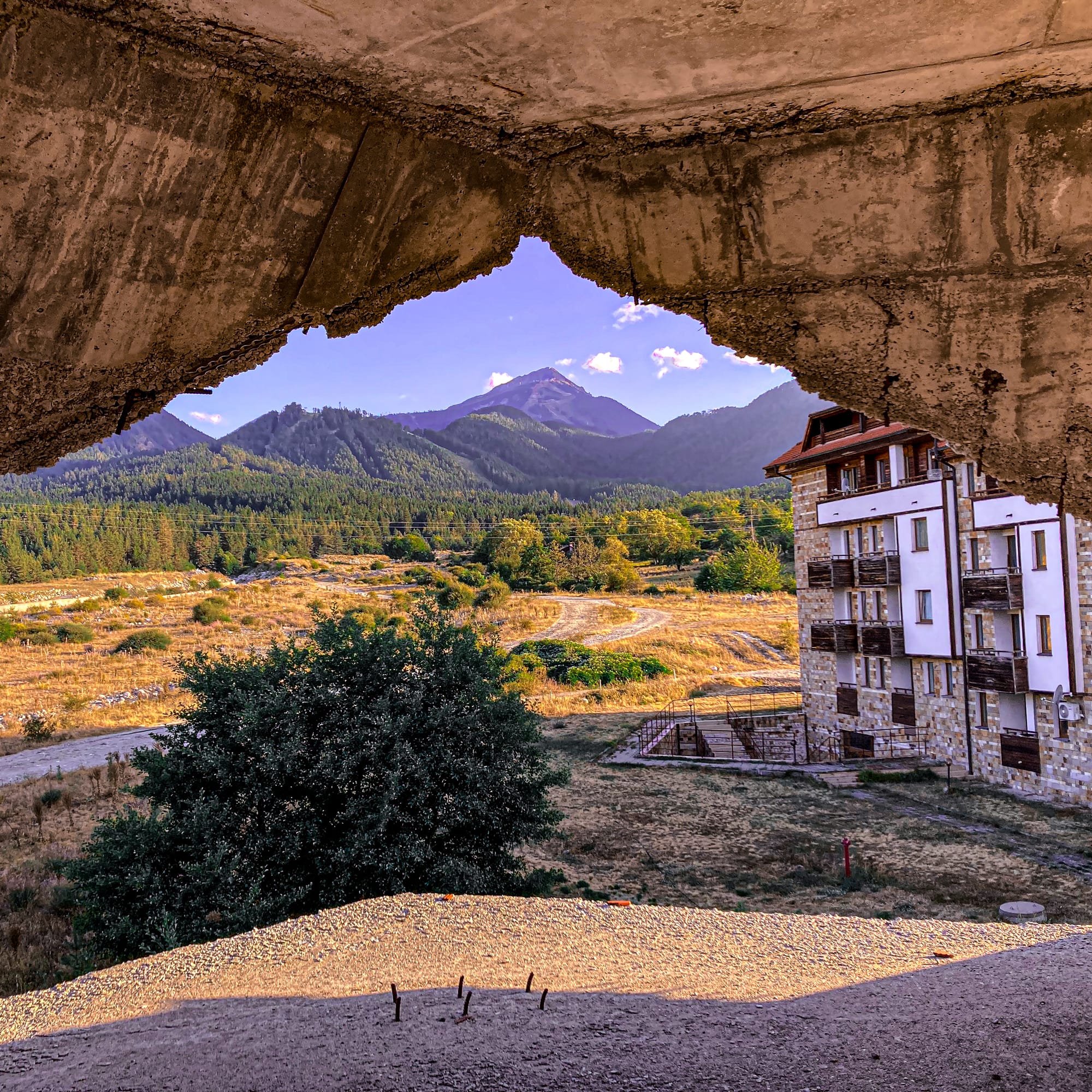 Whispered about in Bansko’s nomad circles, the so-called “Secret Hotel” is an abandoned complex on the edge of town that has taken on near-mythic status. Its shell looms empty, windows dark, staircases exposed, and nature slowly reclaiming the site. Seen from the outside, it’s striking in its scale and atmosphere—a reminder of Bulgaria’s recent past and the fleeting nature of ambition.